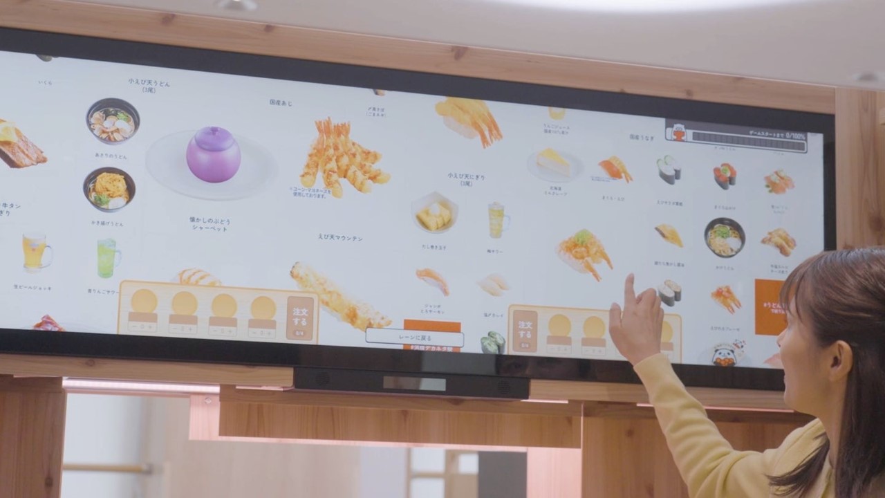 (スシロー店内のボックス席に設置された大型タッチディスプレイのデジローは、画面内に表示された回転すしレーンに流れる商品の中から、食べたい商品をタッチして注文できるので、回転すし店で当たり前だった「食べたい商品をレーンから自分で取る」行為を疑似体験できるシステム)