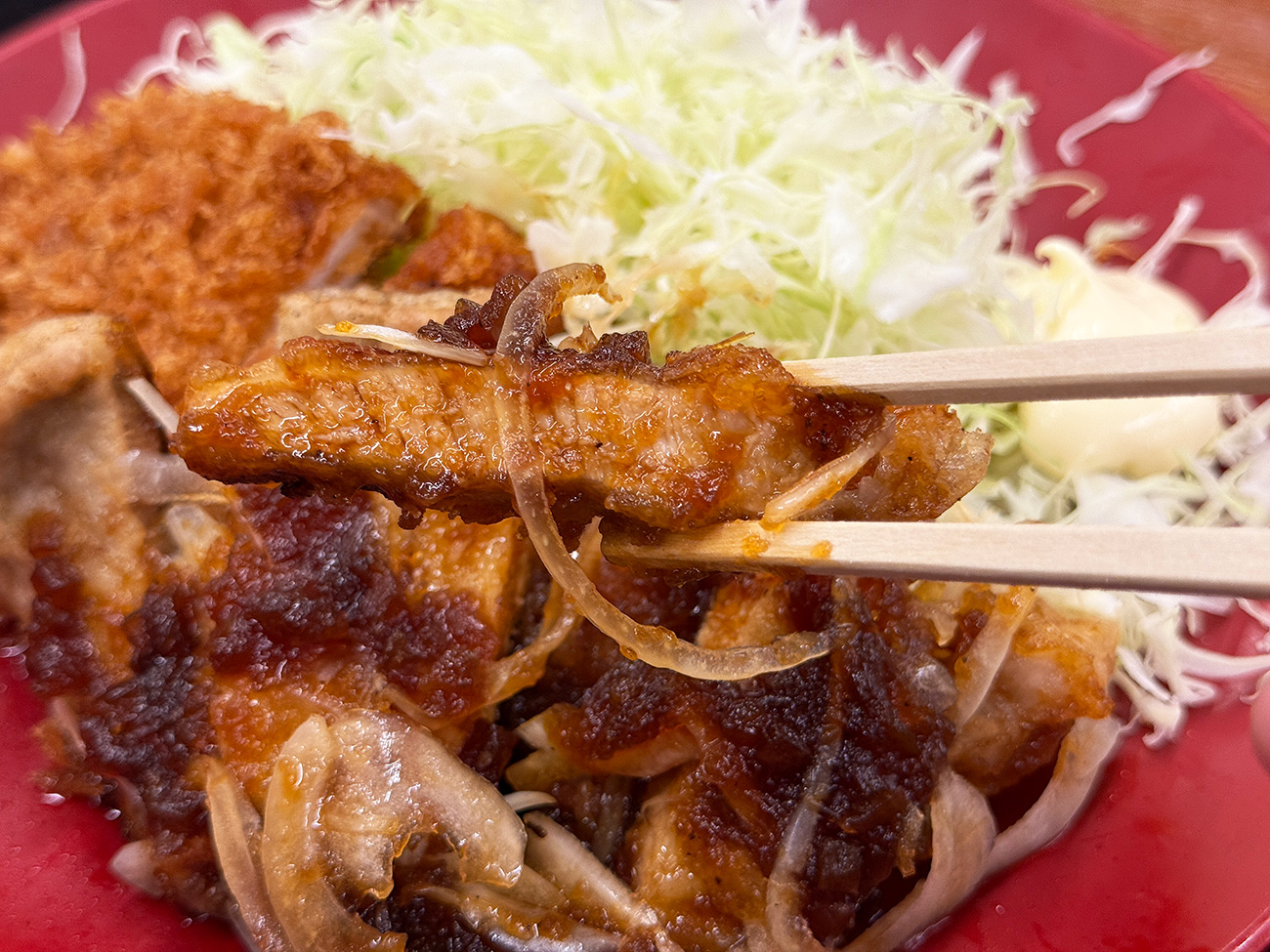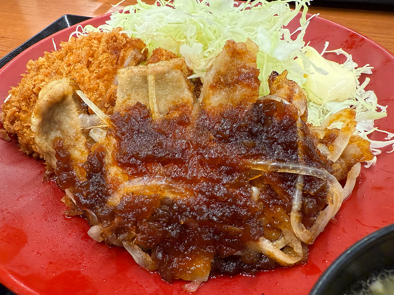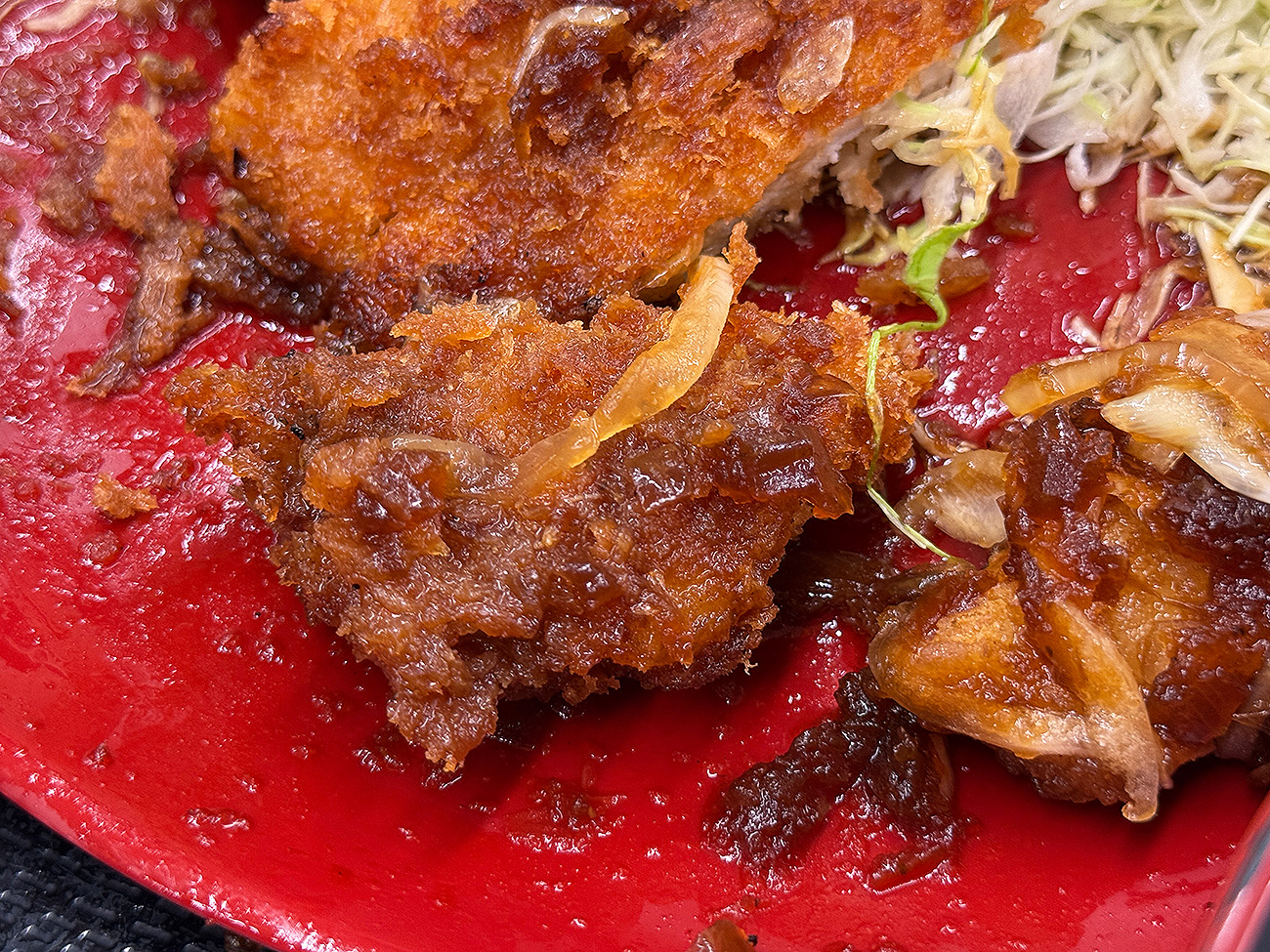 また、今回はトンテキとロースカツのセットで注文したわけですが、トンテキのソースを吸収したロースカツもまた美味でした。トンテキ単品でもいいけど、これはセットにして大正解。というかこのソース、かなりいい味をしてます。