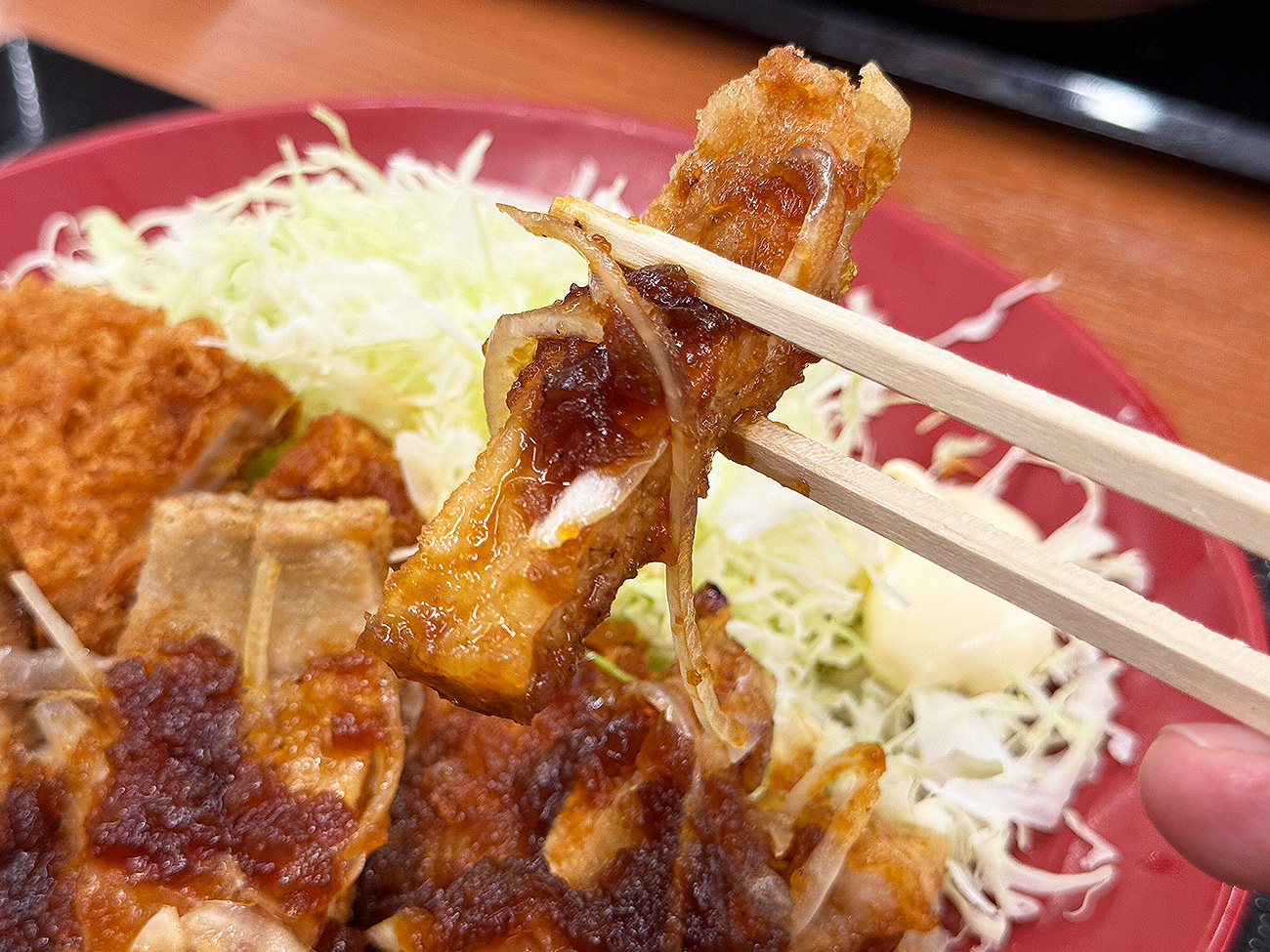 揚げたとはいえ、とんかつのようにザクザクした食感があるわけではないので違和感ないし、かつやとしても揚げて作ることでオペレーションも簡単になるのでしょう。これは見事な采配だなあ!