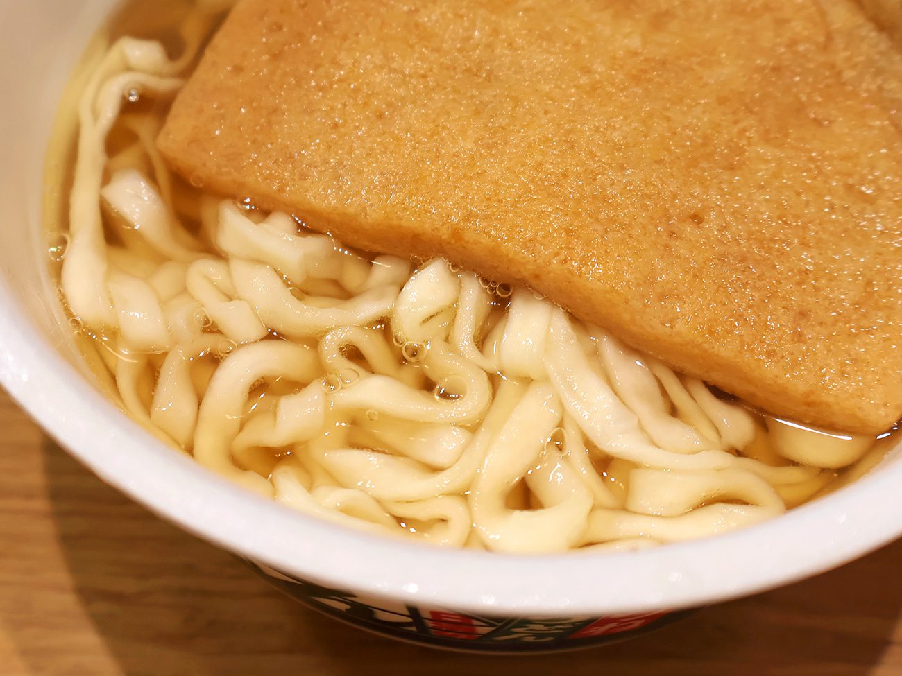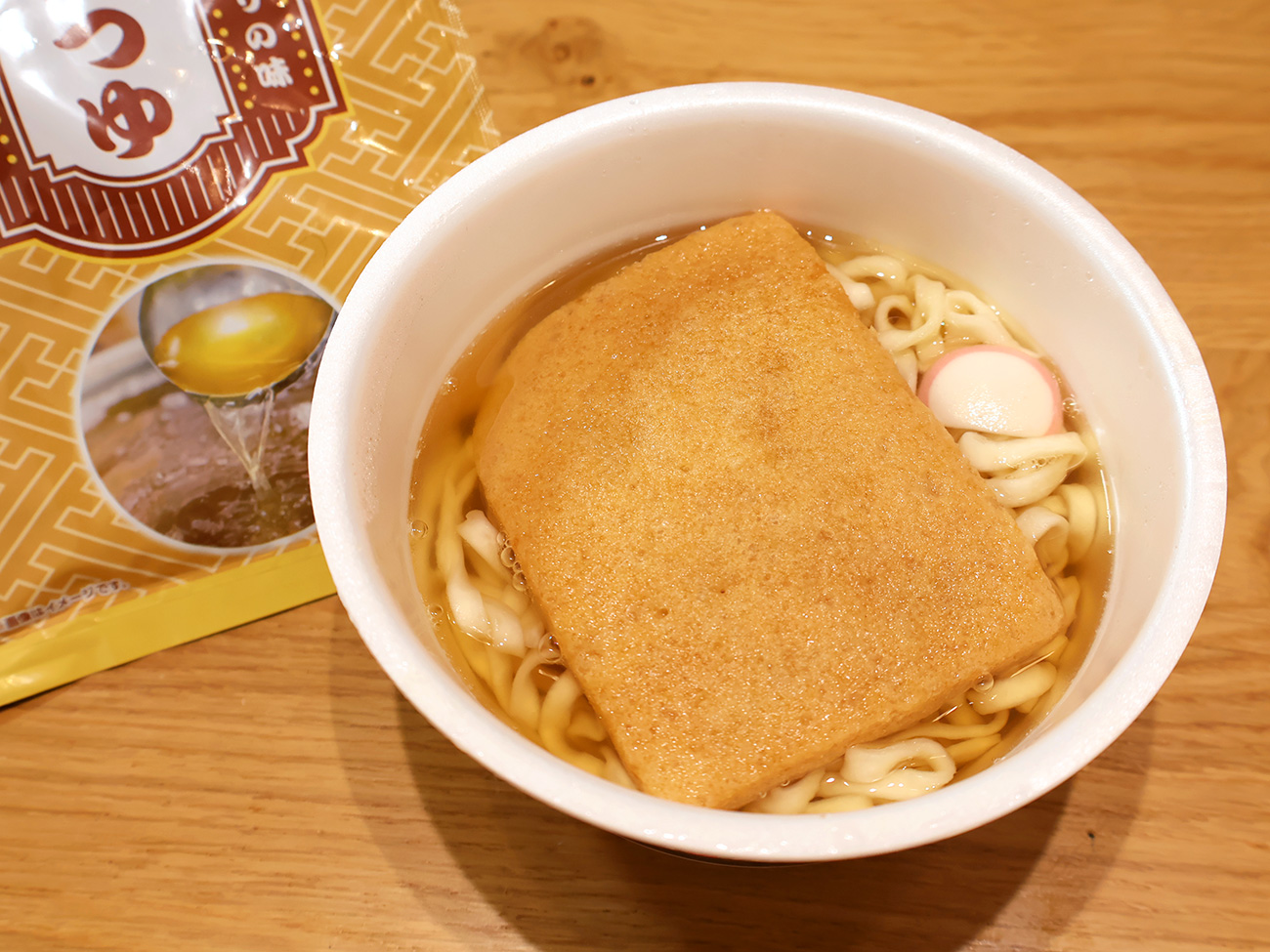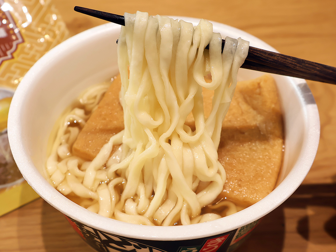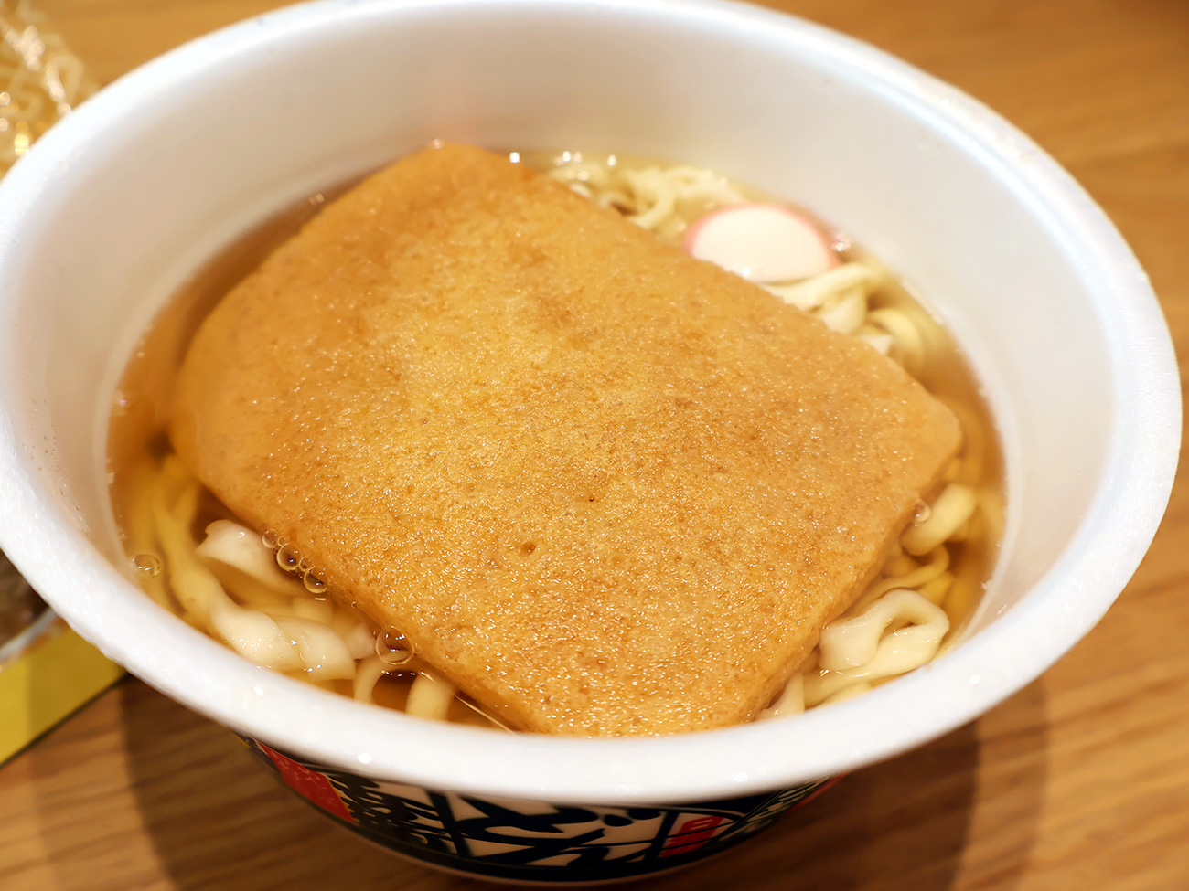 また、写真だと伝わりにくいと思いますが、黄金色に輝くつゆはまさに資さんうどんのそれであり、いつものどん兵衛とは別物。期待が高まります。