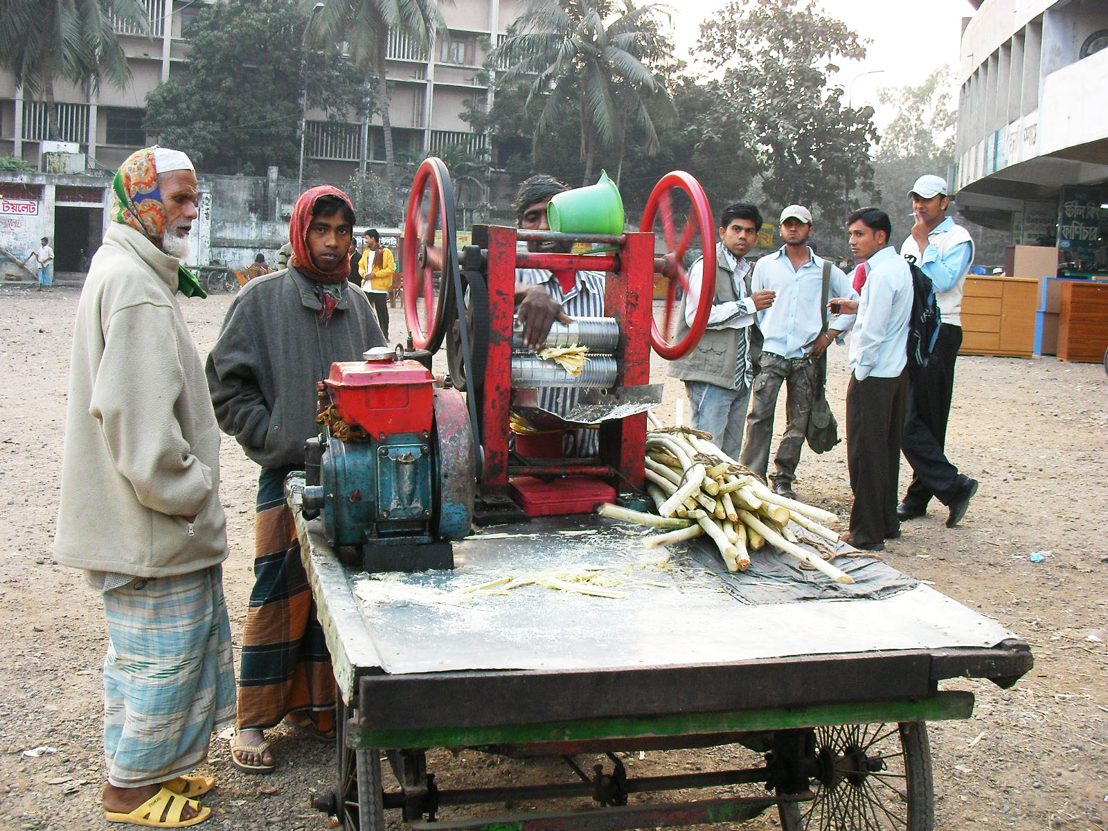 インドやバングラデシュなどでは定番ともいえる、路上でサトウキビジュース。いわゆるインド汁。それを搾り売りしているおじさんたち。単にジュースを売っていると思ったら大違い。硬いサトウキビを徹底的に搾る必要があるため、けっこうな力仕事だ。