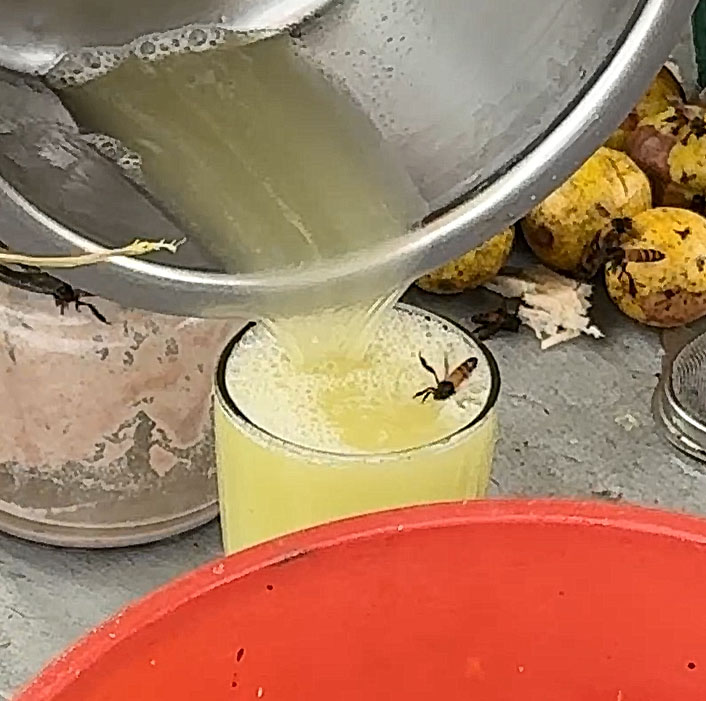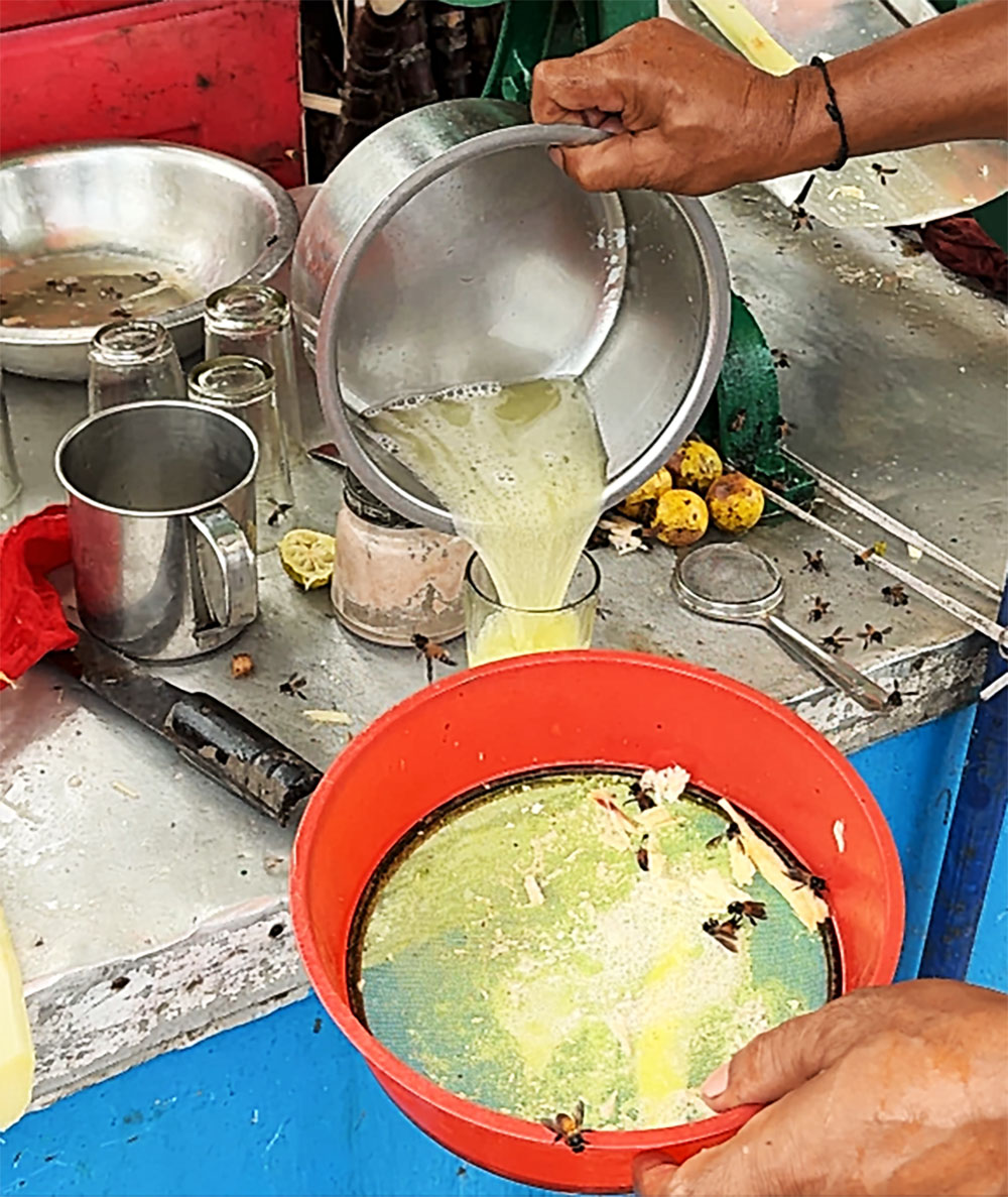 一部では店舗販売しているおじさんもいるが、基本的に屋台で売っている。新鮮なサトウキビをローラーで搾り、そこに柑橘系の果汁をプラスして完成。これ、意外と贅沢なドリンク。なぜなら100%ナチュラルだから。