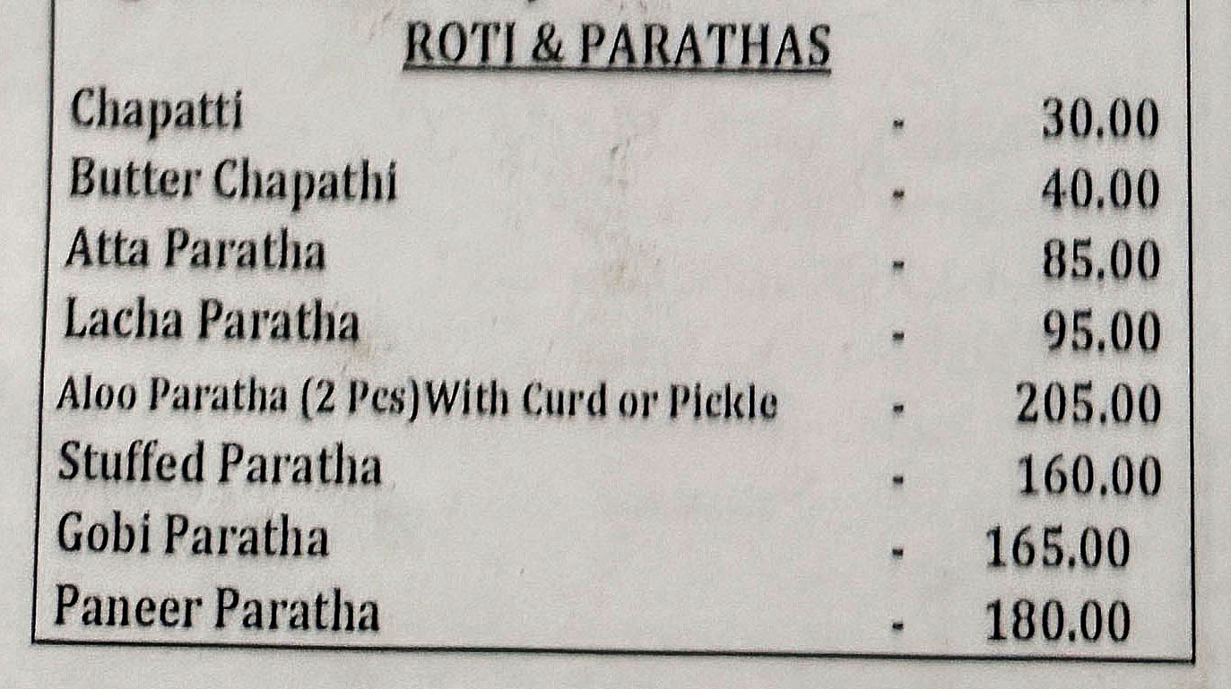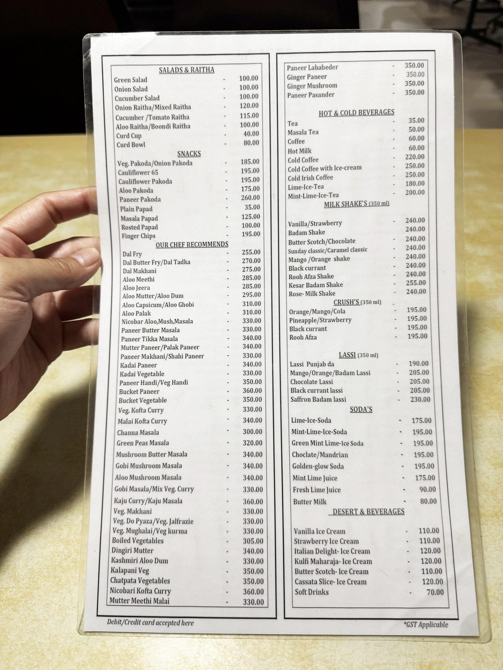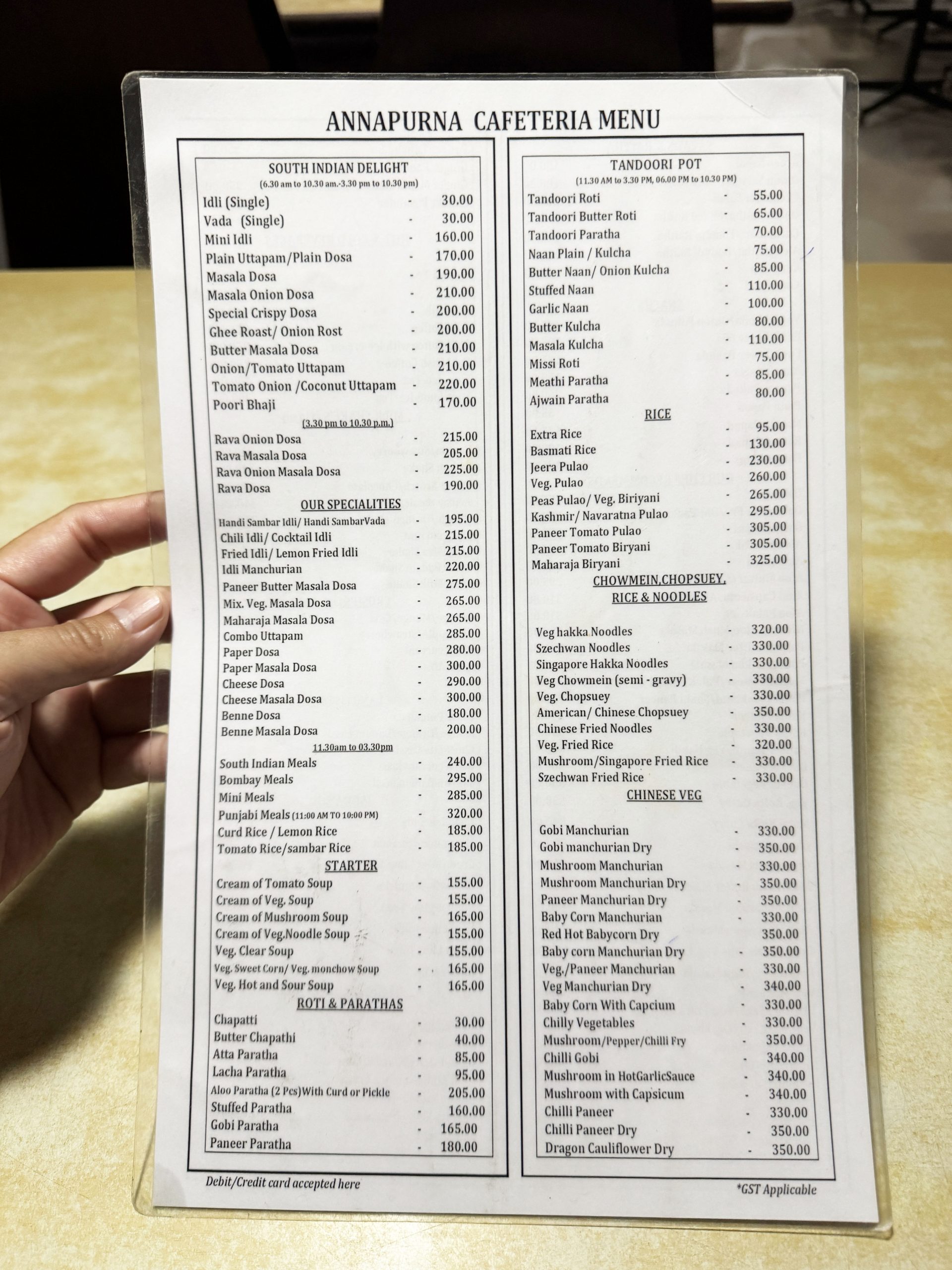 行ったインド料理店は、ポートブレアにある「アンナプルナ・カフェテリア・ピュア・ベジ」(Annapurna Cafeteria Pure Veg / MP8R+VW4, Aberdeen Bazar, Aberdeen, Sri Vijaya Puram, Andaman and Nicobar Islands)。いつも行っている大衆食堂では50~120インドルピーほどの金額で食べられますが、ここでは300インドルピー以上の料理がズラリ。確かに、いつもよりリッチ。