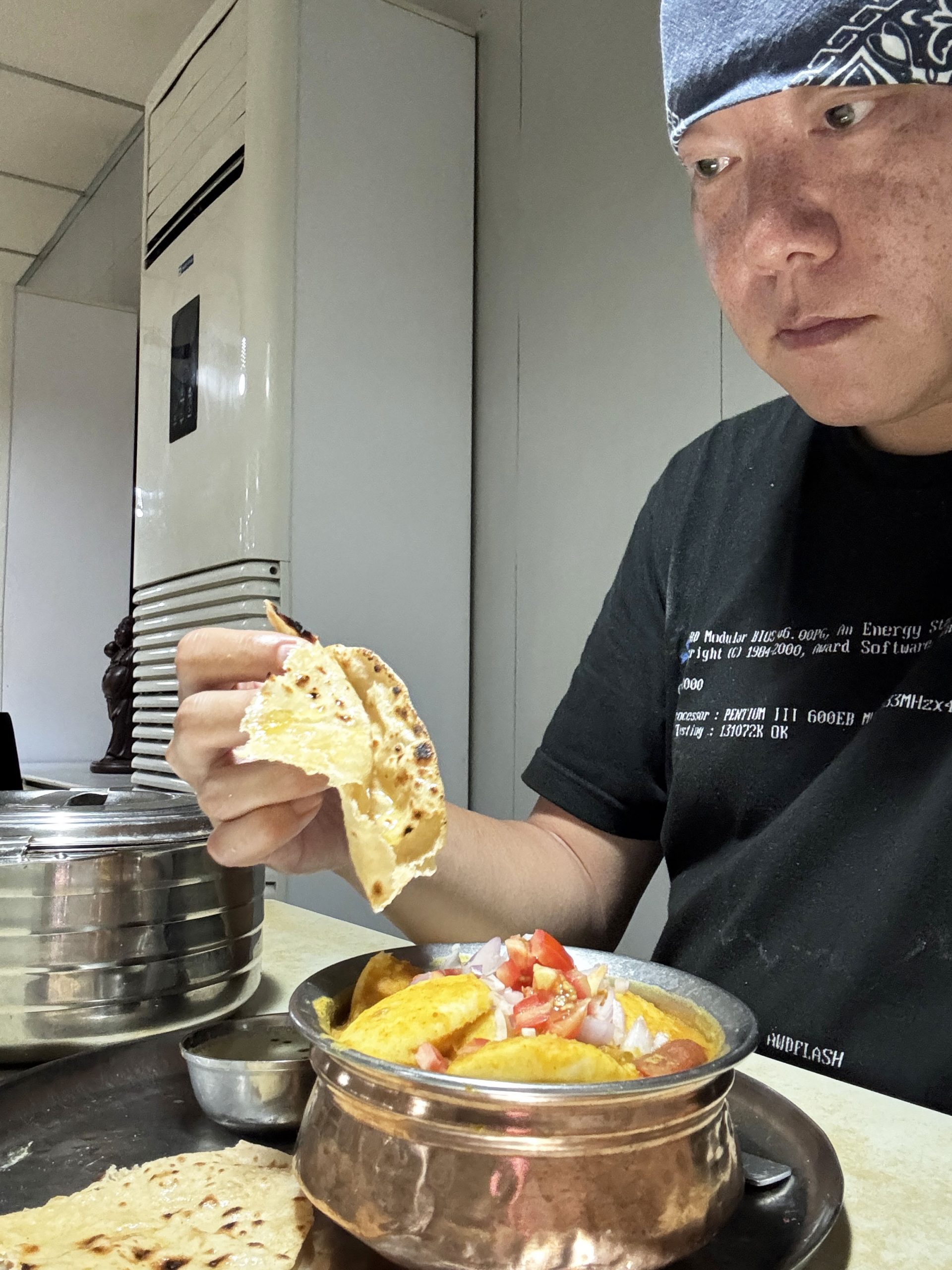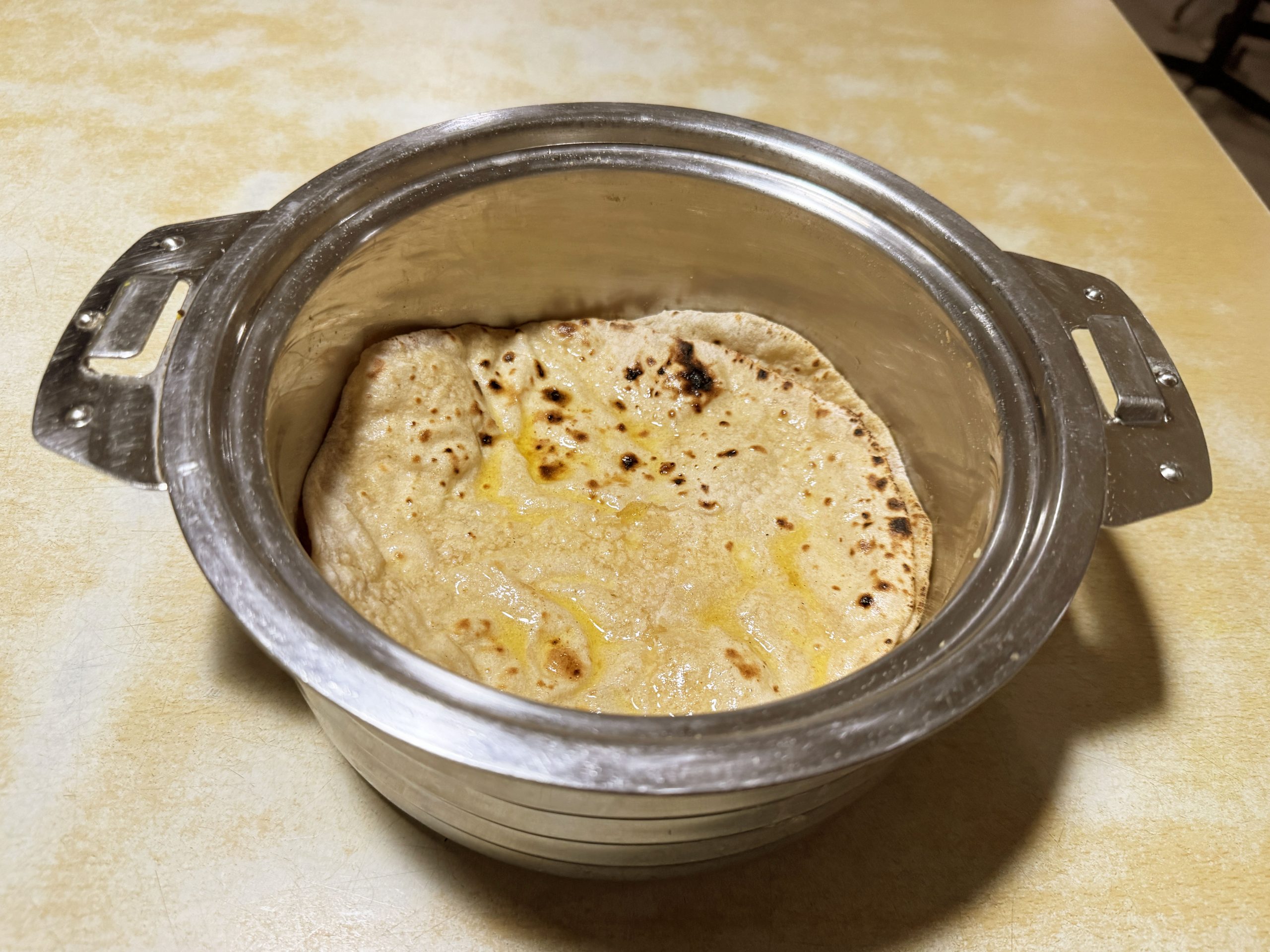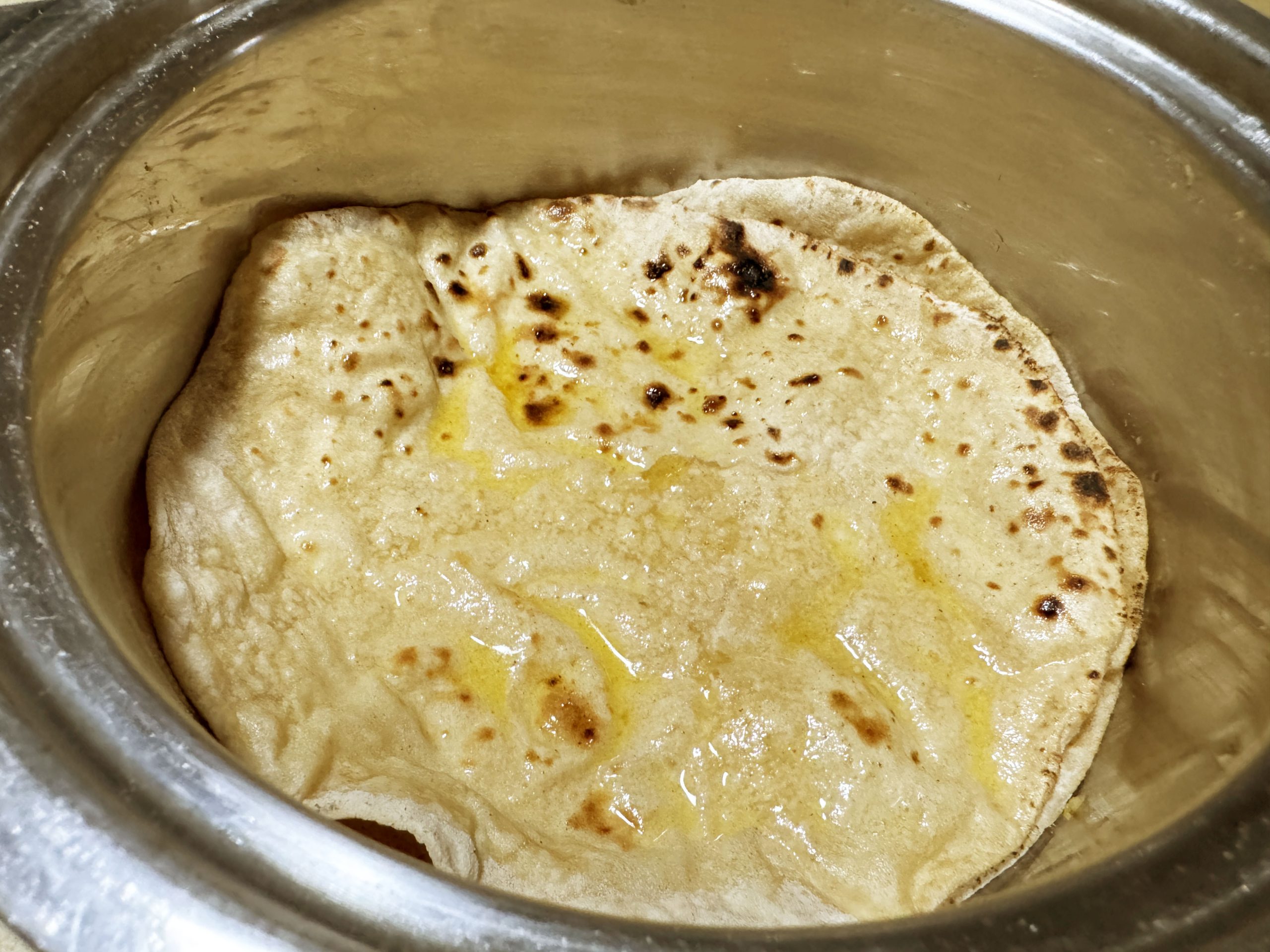 金属製の鍋が出てきたので、なんだろうと思い、蓋を開けてみると、そこにはたっぷりとバターが塗られたチャパティが入っていました。ちょうど鍋にピッタリと合うサイズのチャパティが!