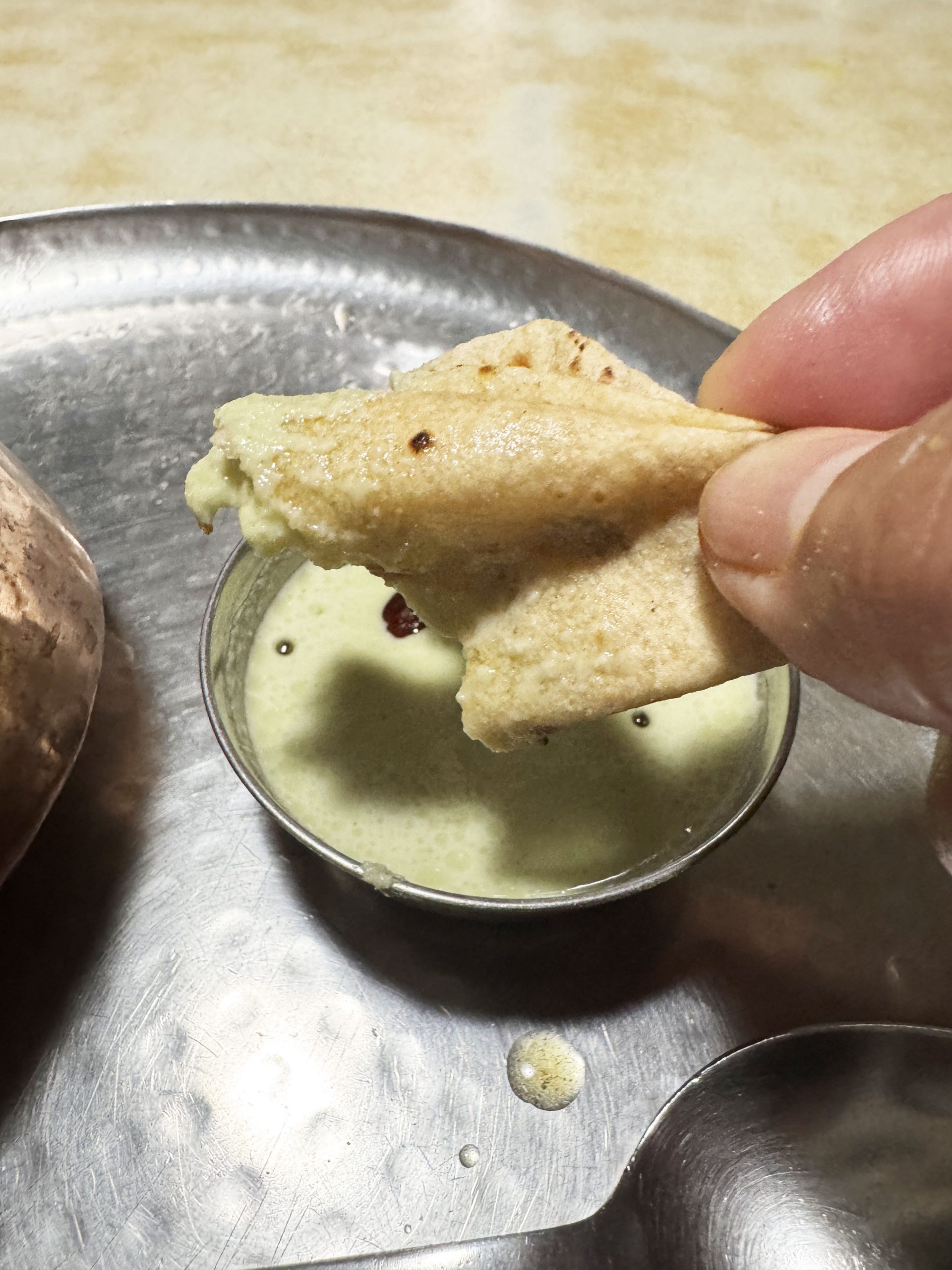 チャパティは、かなりフカフカで、特有のザラつきを残しつつ、しっとりしていました。そうか、この鍋はチャパティを保温するものなのか。