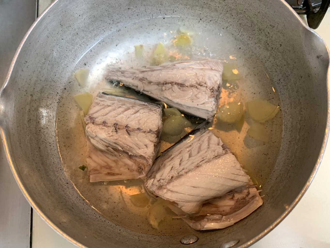 鍋が沸騰したら皮目を下にしてサバの切り身を入れます。