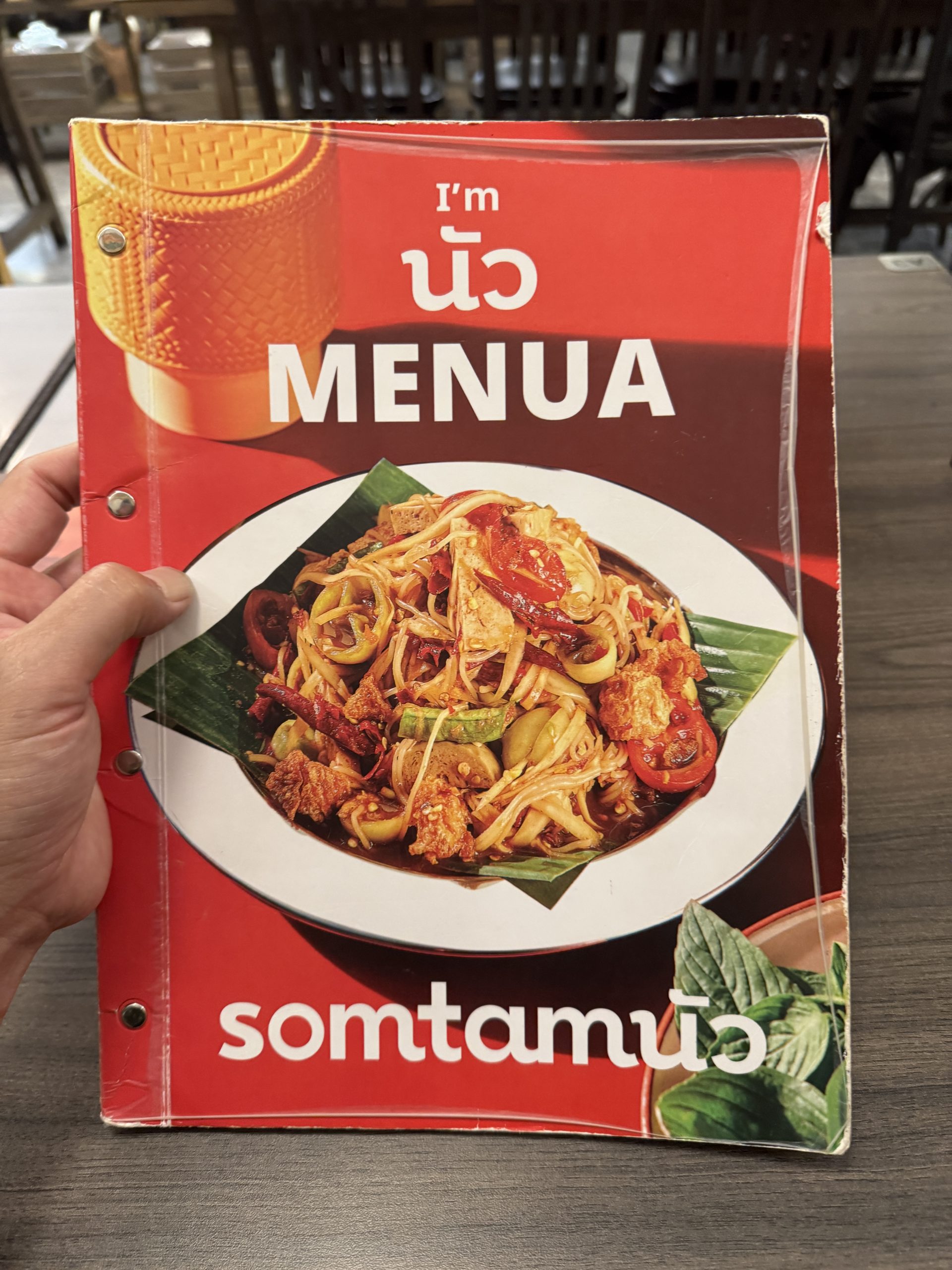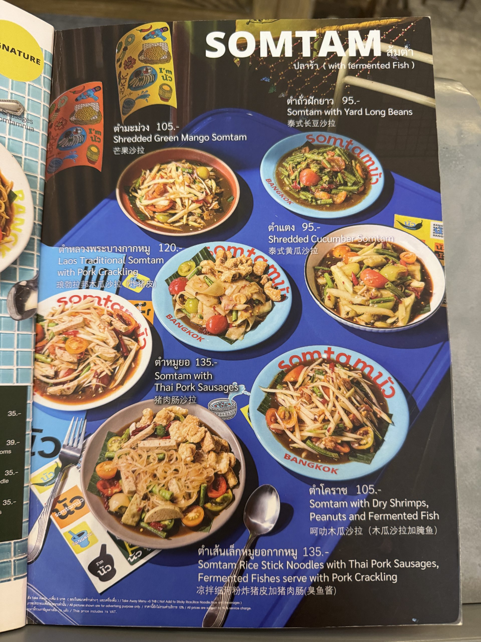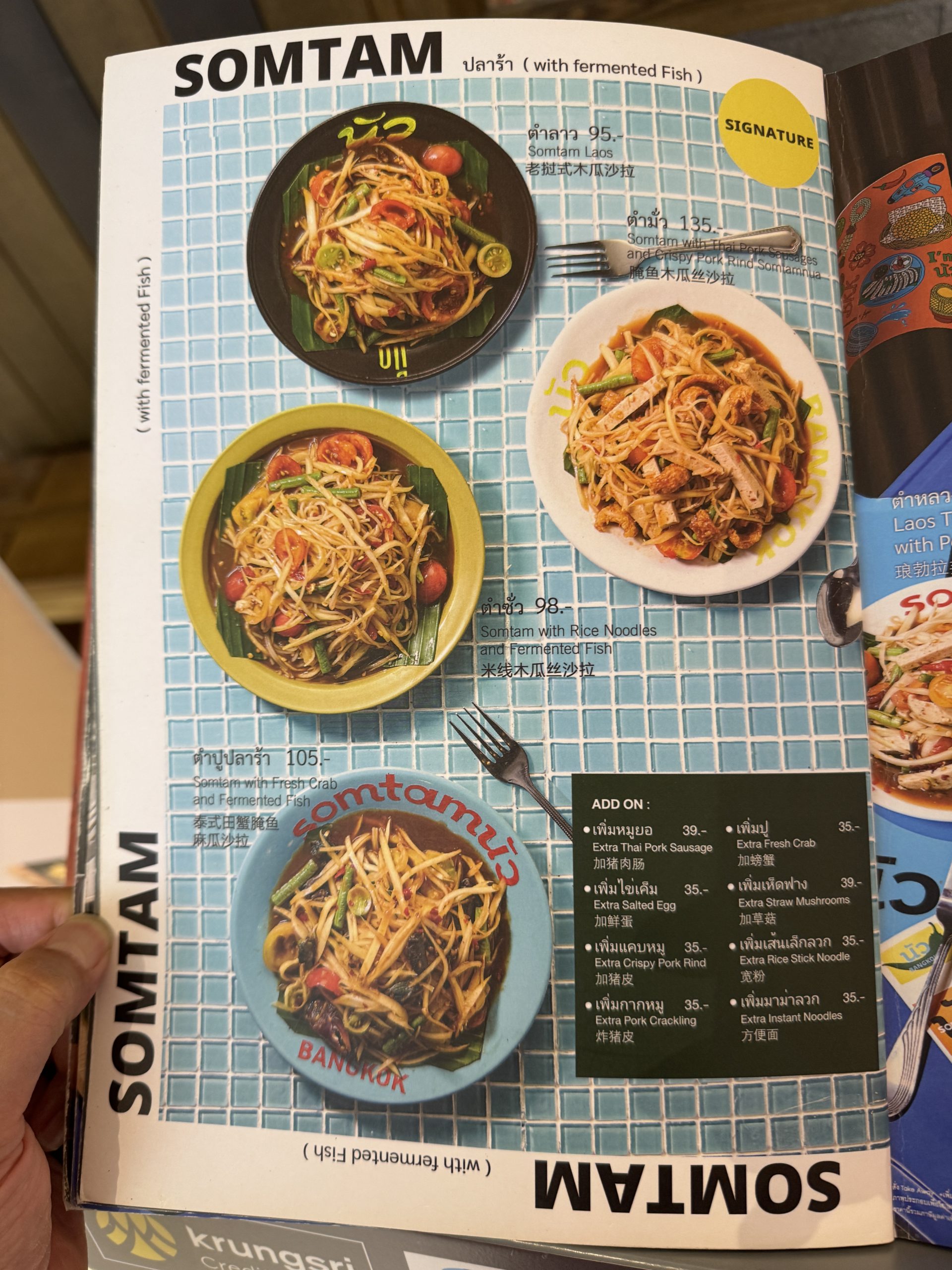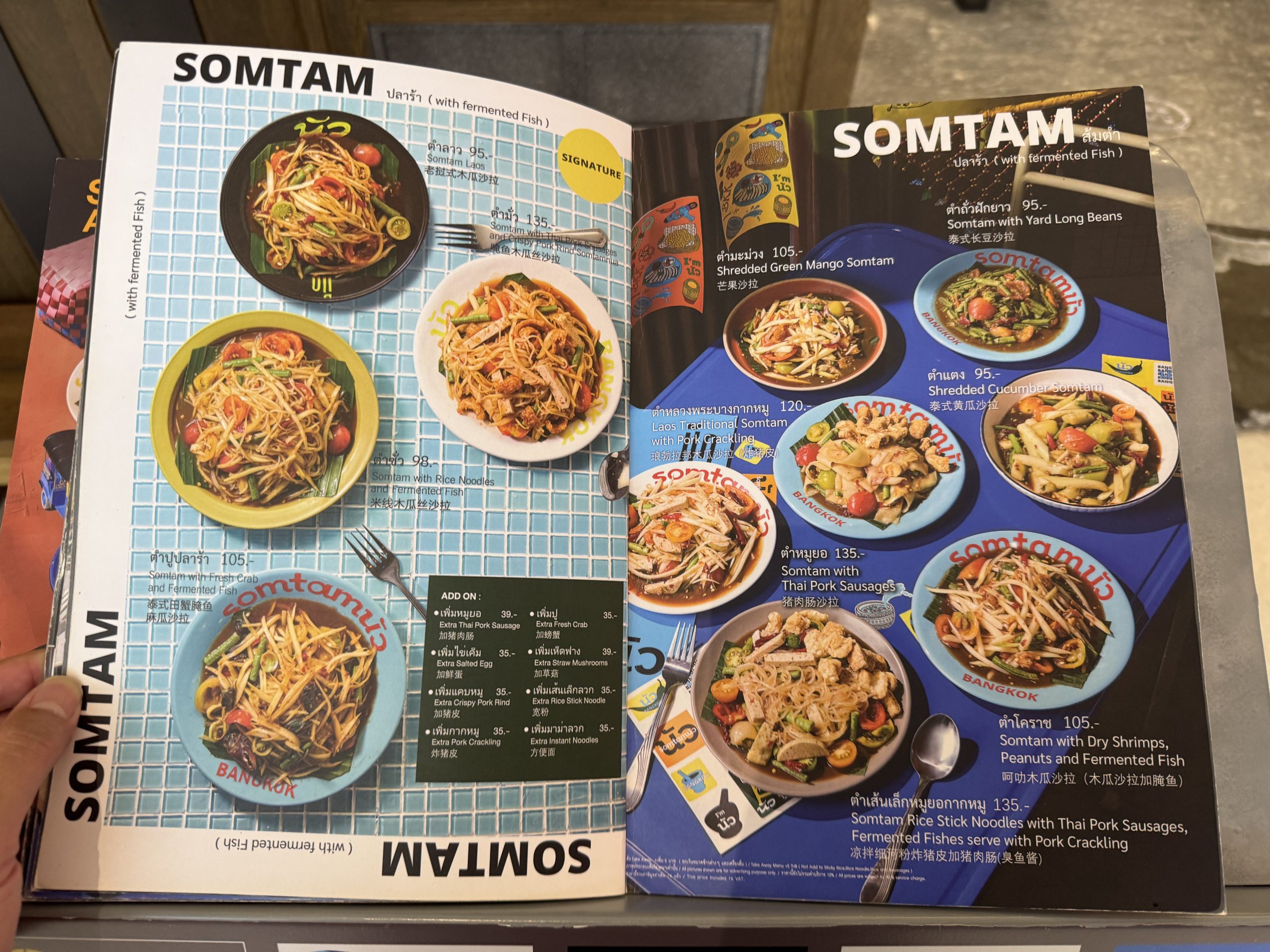店内は伝統と時代を感じさせるタイ的デザイン。さっそく着席してメニューを見てみると、確かに、ソムタムだらけでした。