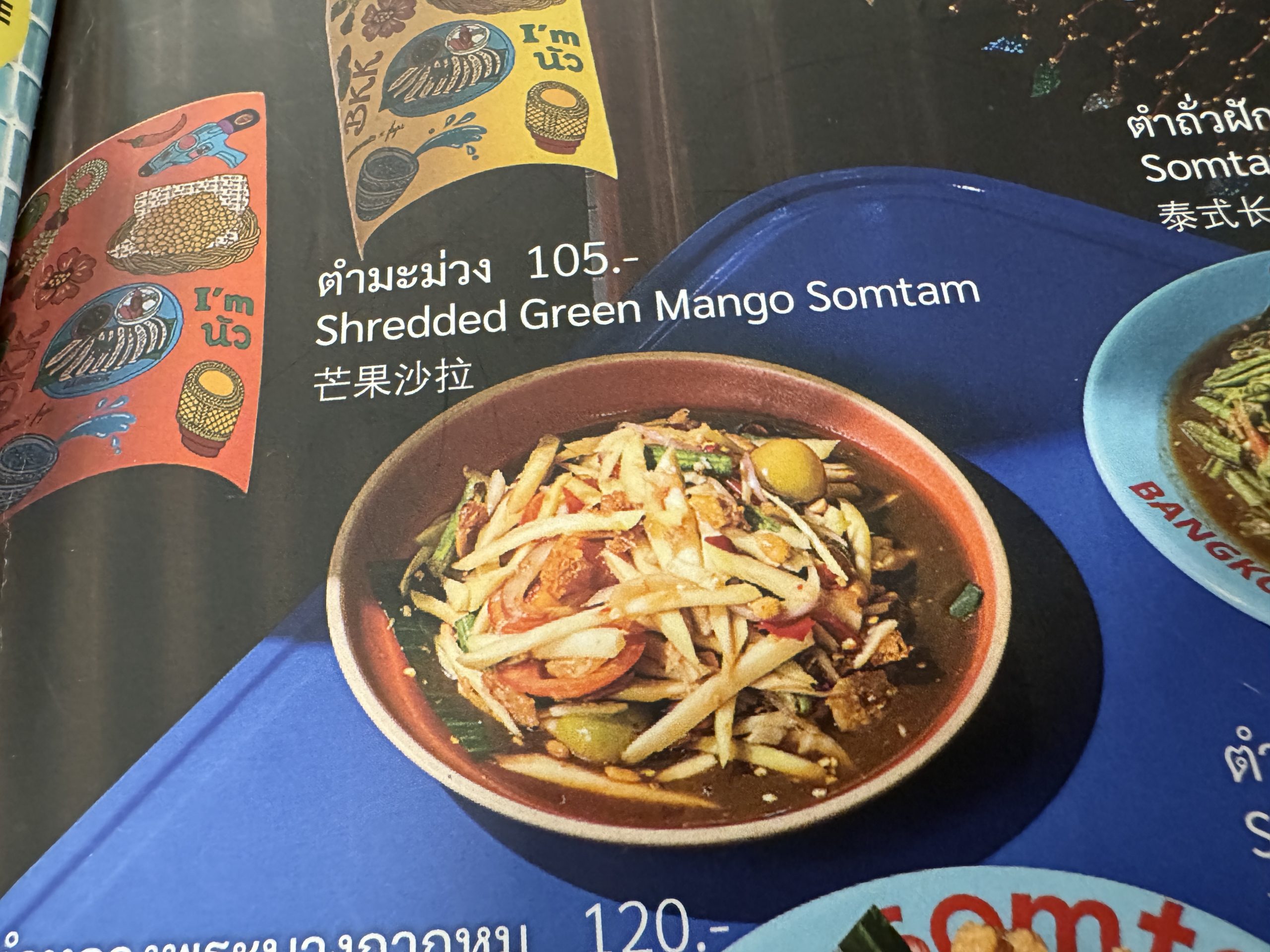 メニューを見て特に惹かれたのが、焼きトウモロコシのソムタムと、グリーンマンゴーのソムタムです。オーダーを受けてから丁寧に作っているようで、仕上がるまでけっこう時間を要しましたが、期待を裏切らないビジュでした。