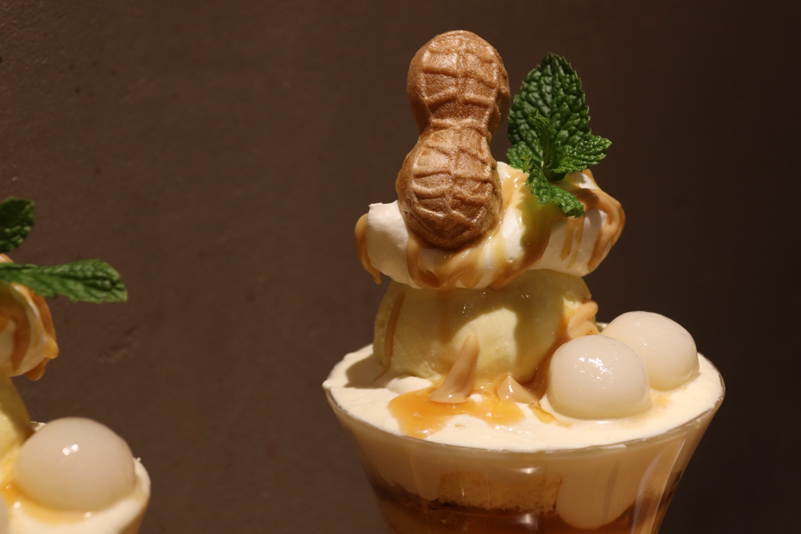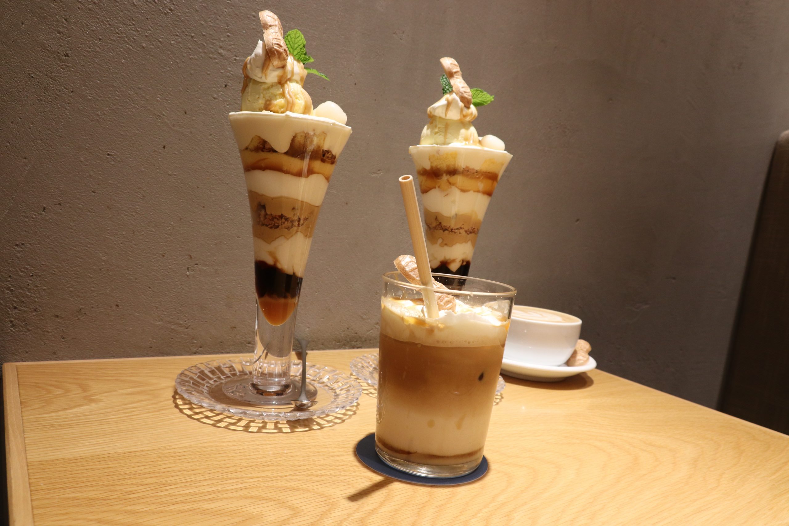 生クリームは言うに及ばず、スポンジケーキ、ティラミスクリーム、バニラアイス、白玉、コーヒーゼリーと下層に進んでも飽きない構造になっており、目も舌も最後まで楽しませる工夫が施されている。最初はキャラメル、次にピーナッツと続き、ケーキやアイスと続くので、甘いのは甘いが男性でも満足できる内容なのでカップルで同じものをチャレンジしてみる価値はある。