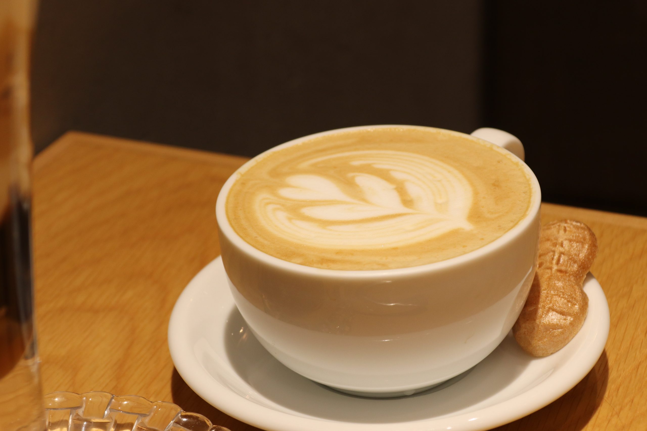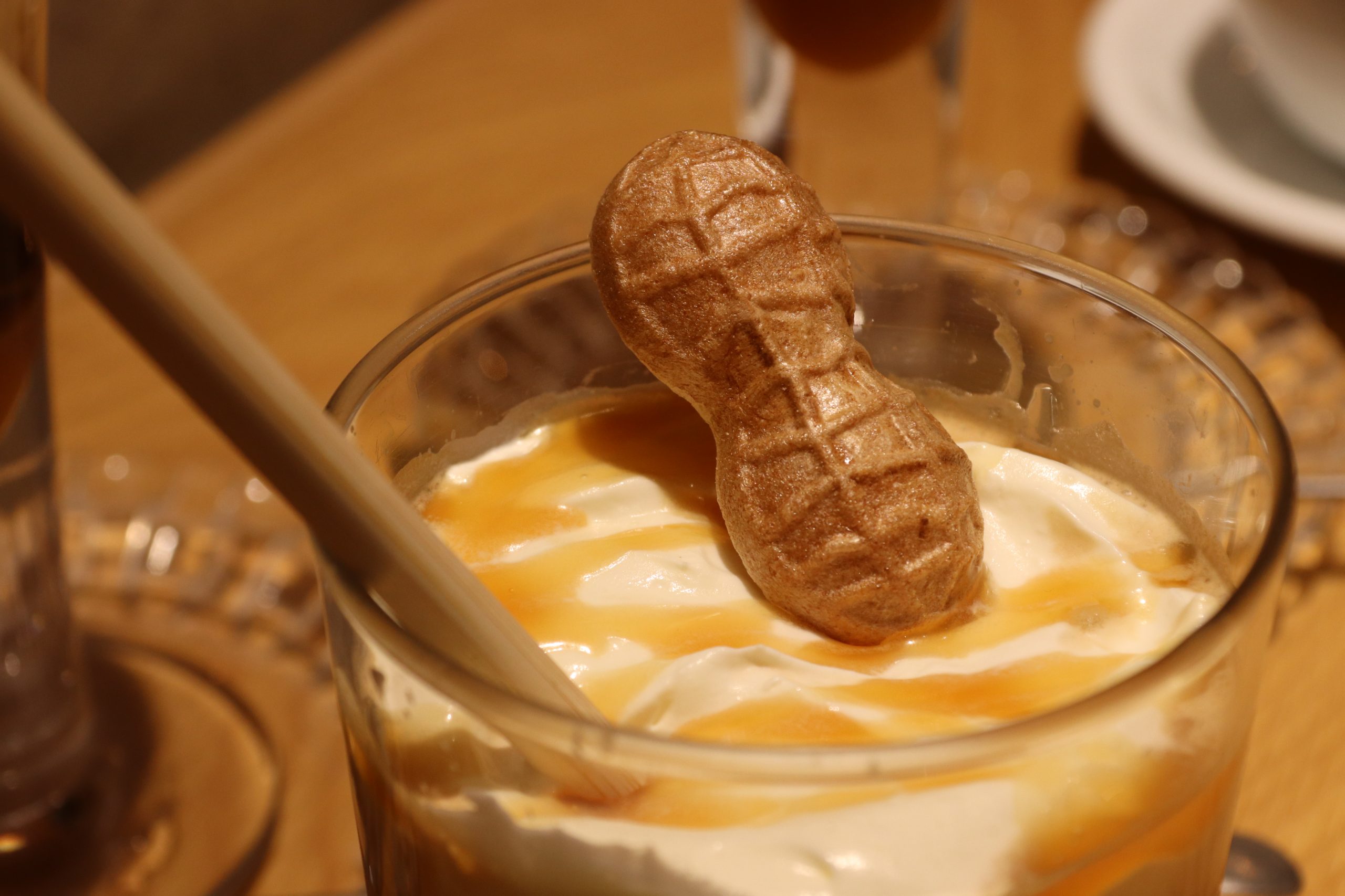 同じシリーズのキャラメルピーナッツラテは、ラテアートも鮮やかな定番のラテだが、ピーナッツ最中がかわいらしい。アイスもホットもあるので、どうせ甘いパフェを食べるのであれば同時注文で自分へのご褒美に甘さを極めたい。