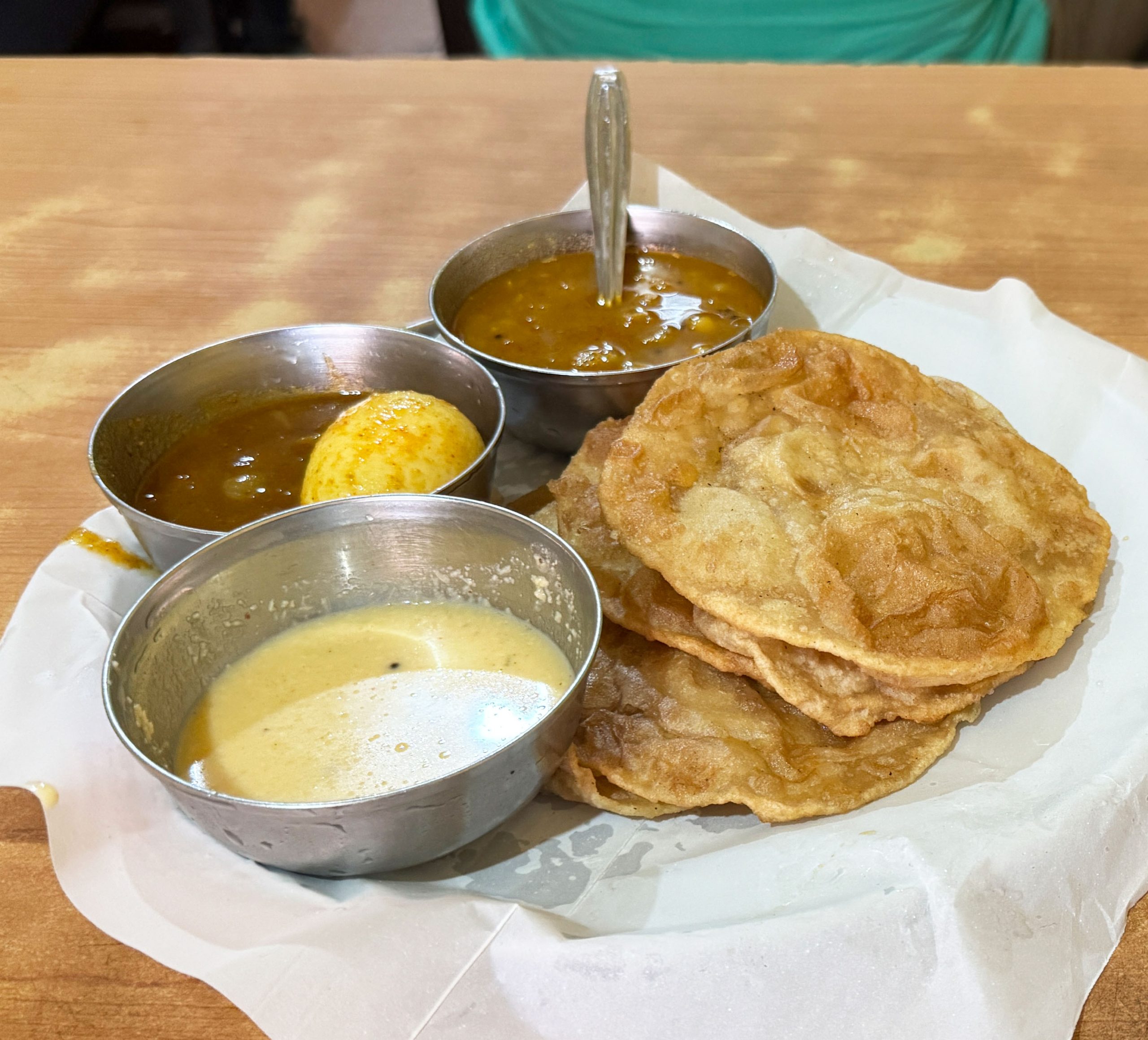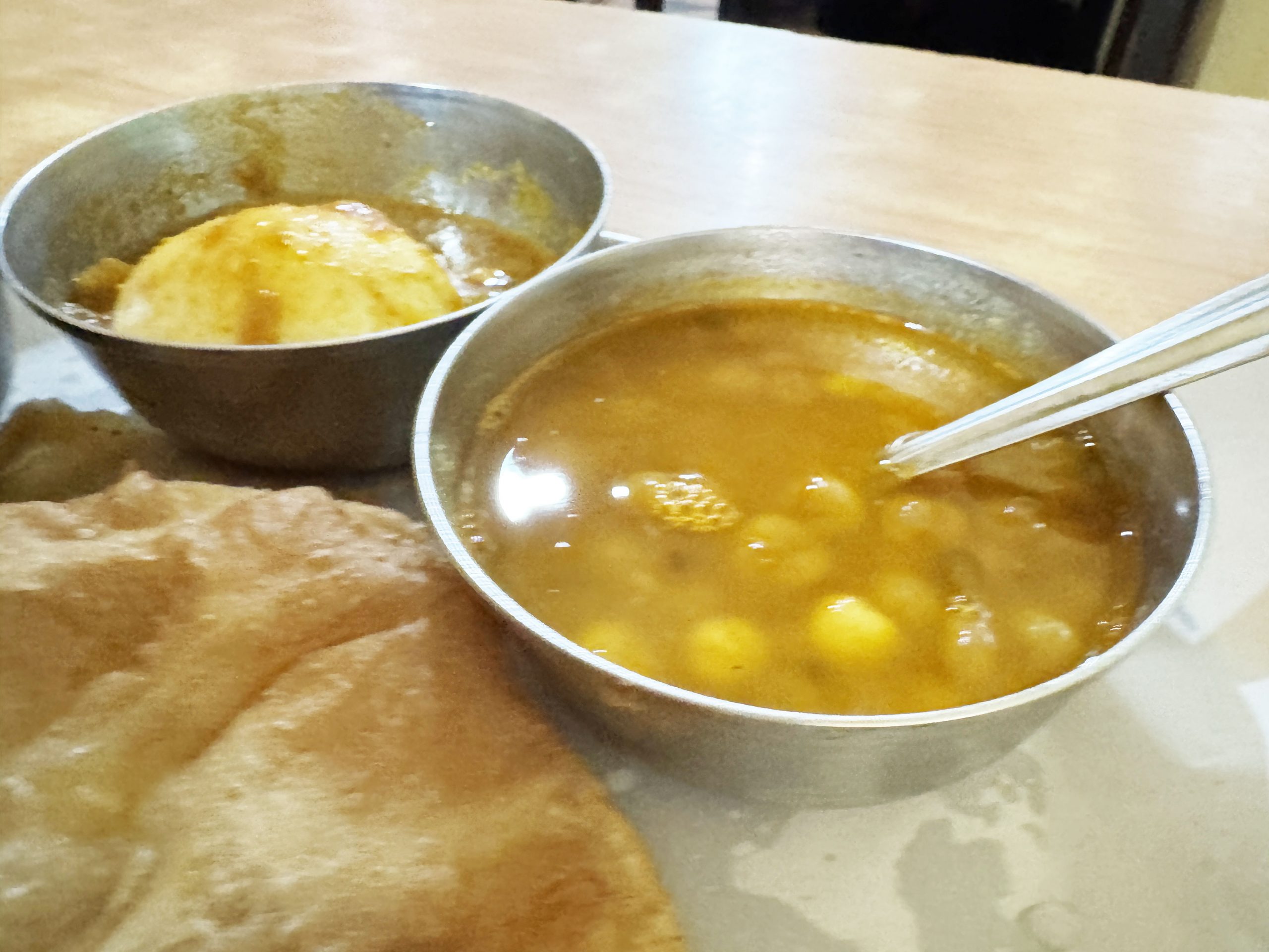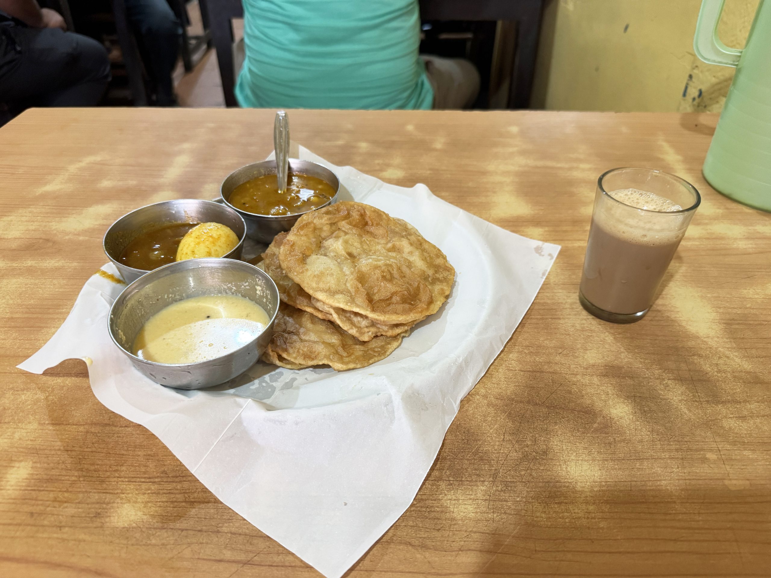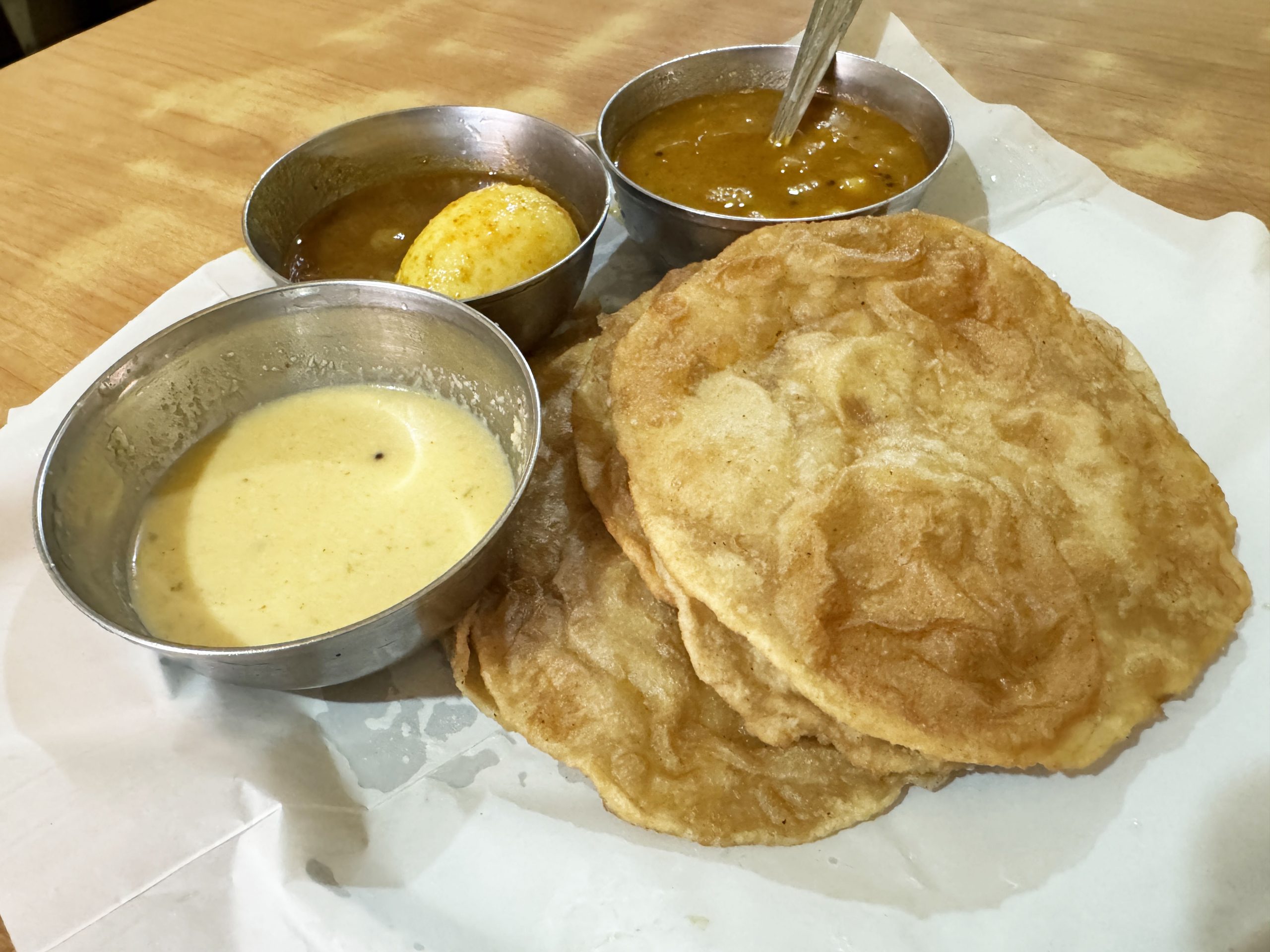 筆者は、プーリというオイリーな揚げパンにカレー煮卵を追加してオーダーしました。飲み物はチャイ。オーダー時、何をどう注文すればいいかわからなくても、なんとなく伝えれば、なんとなく店員さんが察してくれるので、なんとなくカレーは出てきます。なんとなく。