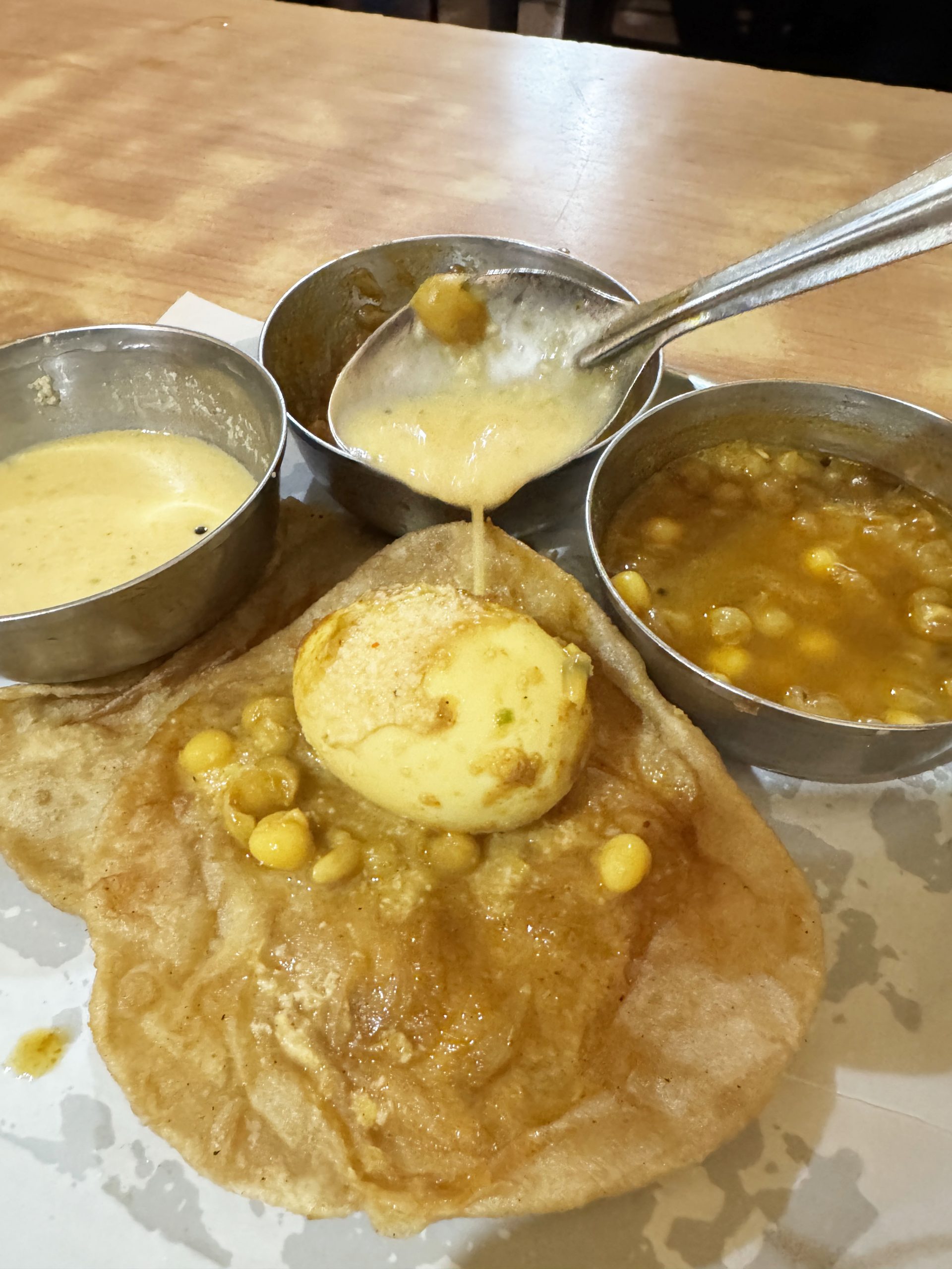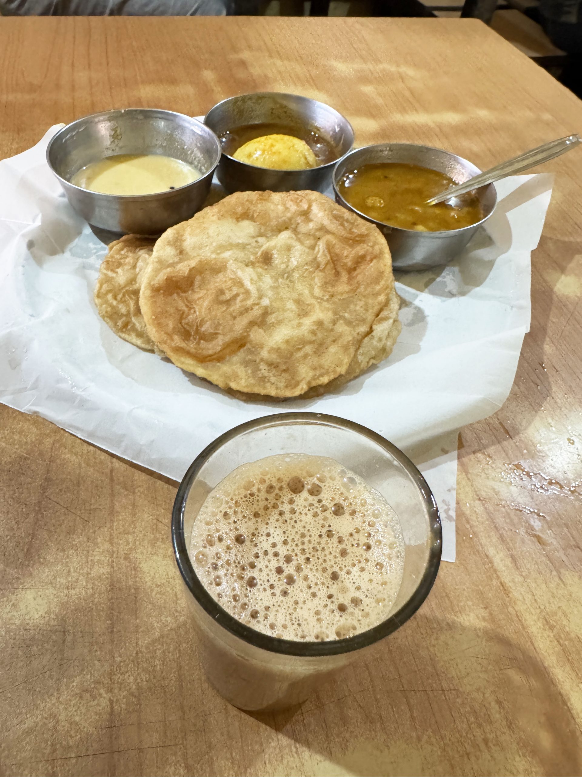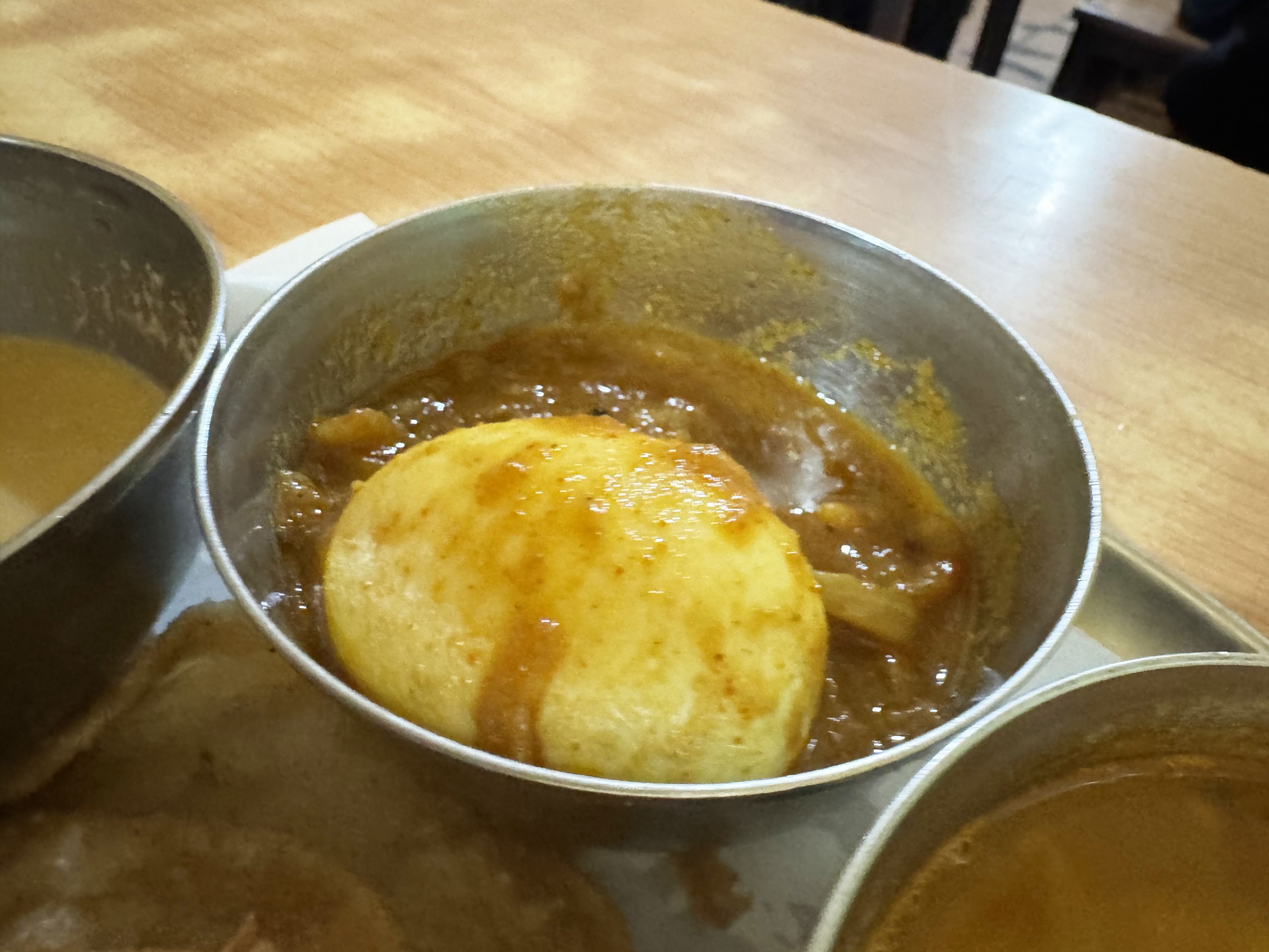 筆者は、プーリというオイリーな揚げパンにカレー煮卵を追加してオーダーしました。飲み物はチャイ。オーダー時、何をどう注文すればいいかわからなくても、なんとなく伝えれば、なんとなく店員さんが察してくれるので、なんとなくカレーは出てきます。なんとなく。