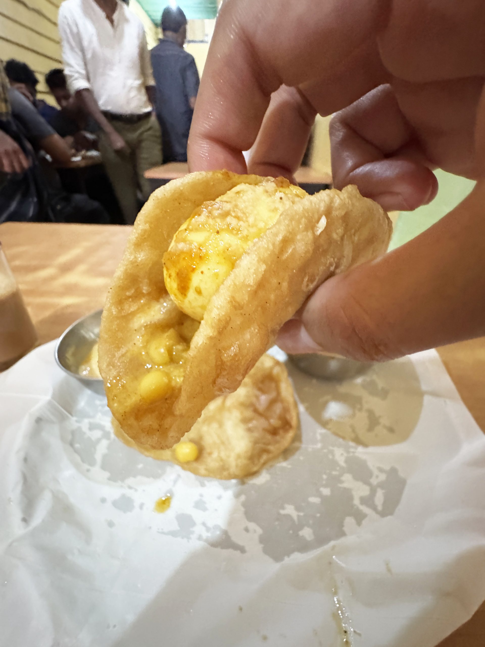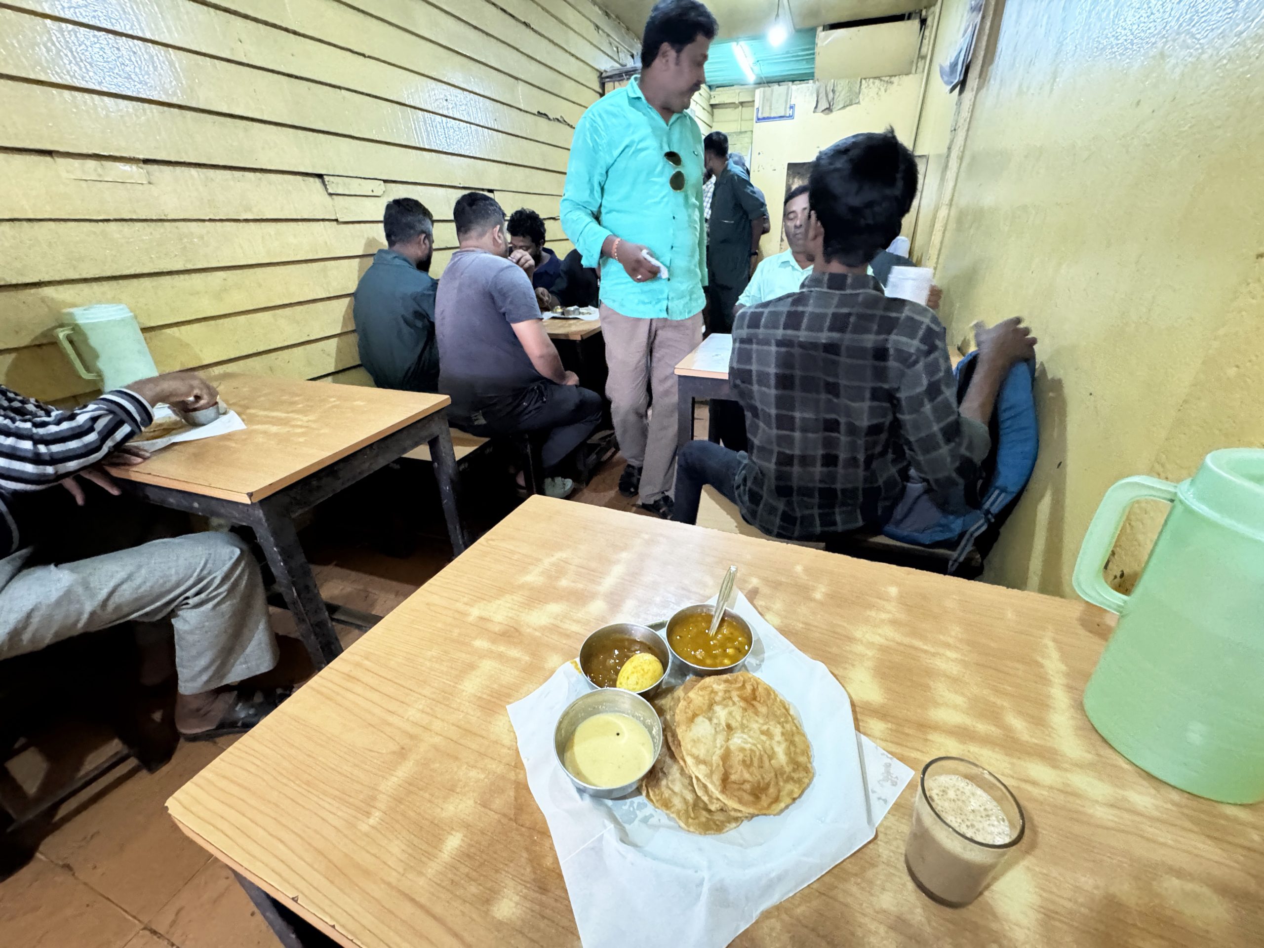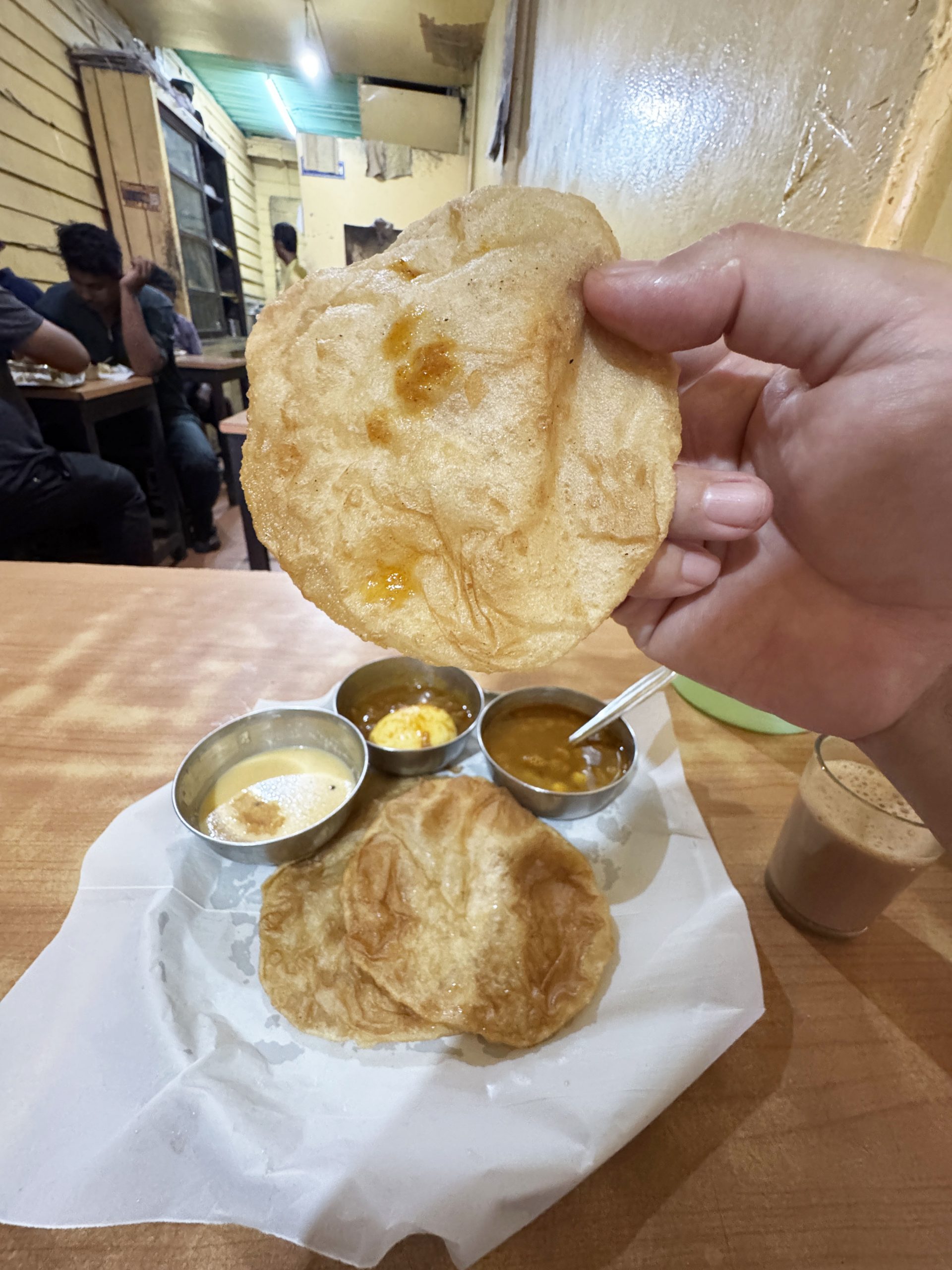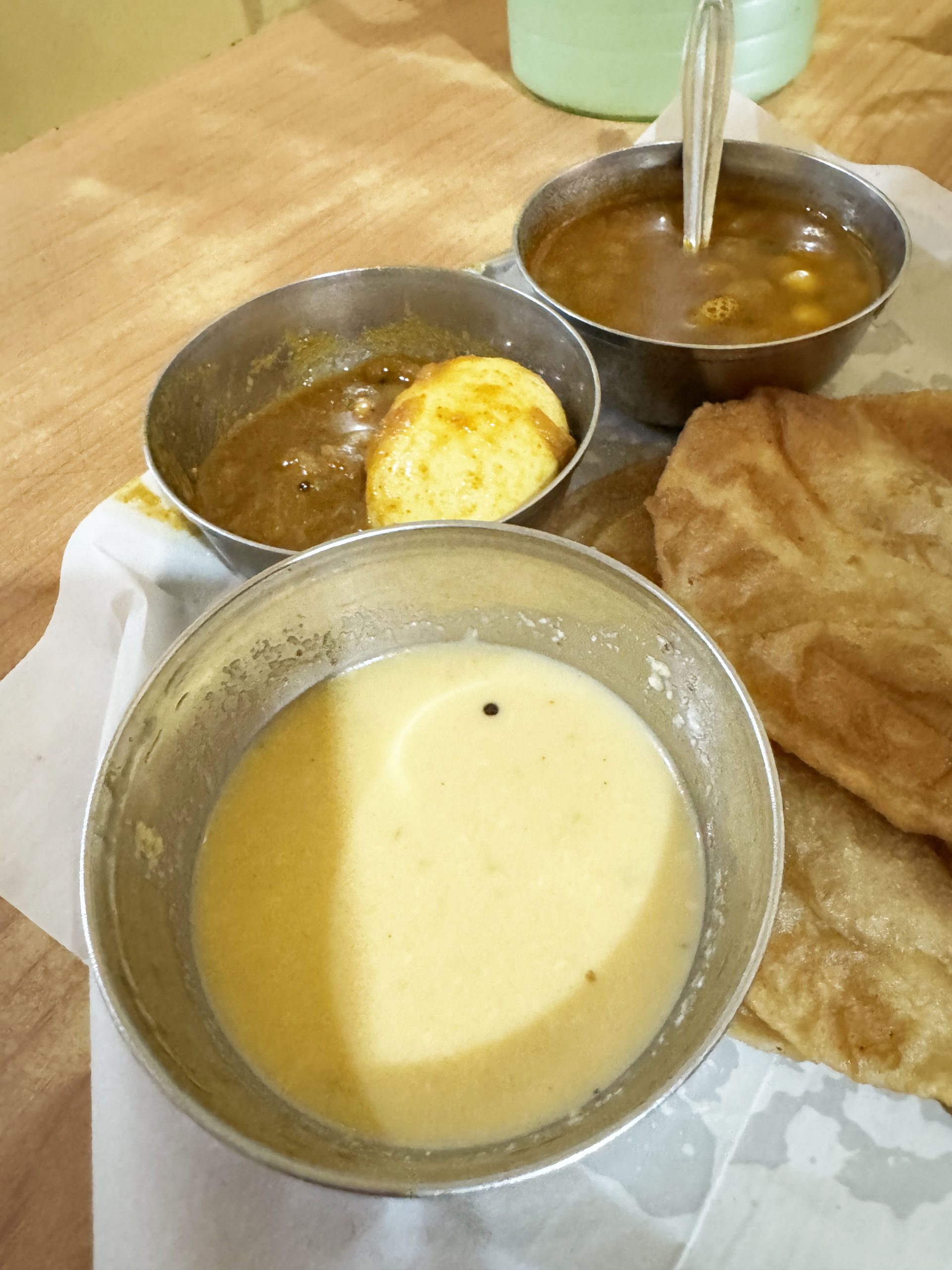 筆者は、プーリというオイリーな揚げパンにカレー煮卵を追加してオーダーしました。飲み物はチャイ。オーダー時、何をどう注文すればいいかわからなくても、なんとなく伝えれば、なんとなく店員さんが察してくれるので、なんとなくカレーは出てきます。なんとなく。