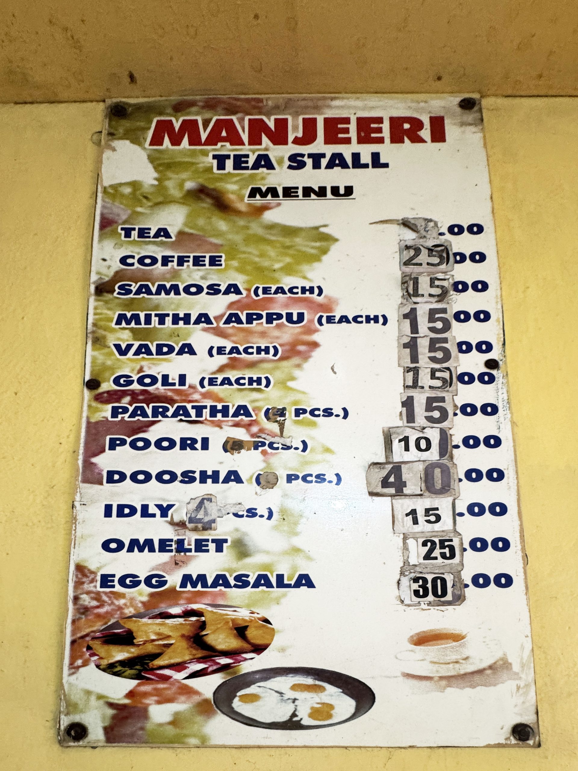 メニューが壁に貼られているのですが、ようやくここで店名が登場します。Manjeeri Tea Stallという店名の下に、ズラリとドリンクとパンの名称が並んでいます。複数あるインドパンからひとつを選び、それを主食としてカレーセットを食べるお店です。