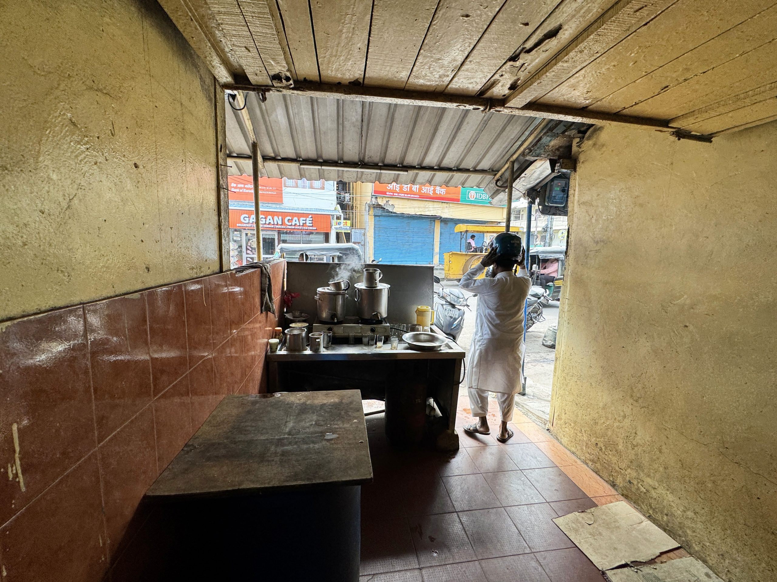 店内に入ると、せまい長方形のフロアにテーブルが設置されています。かなり狭いし、テーブルも少ないので、基本的に相席になります。入口にはチャイ職人がいて、チャイをオーダーするとチャイ場から持ってきてくれます。フードは奥の厨房で作られています。