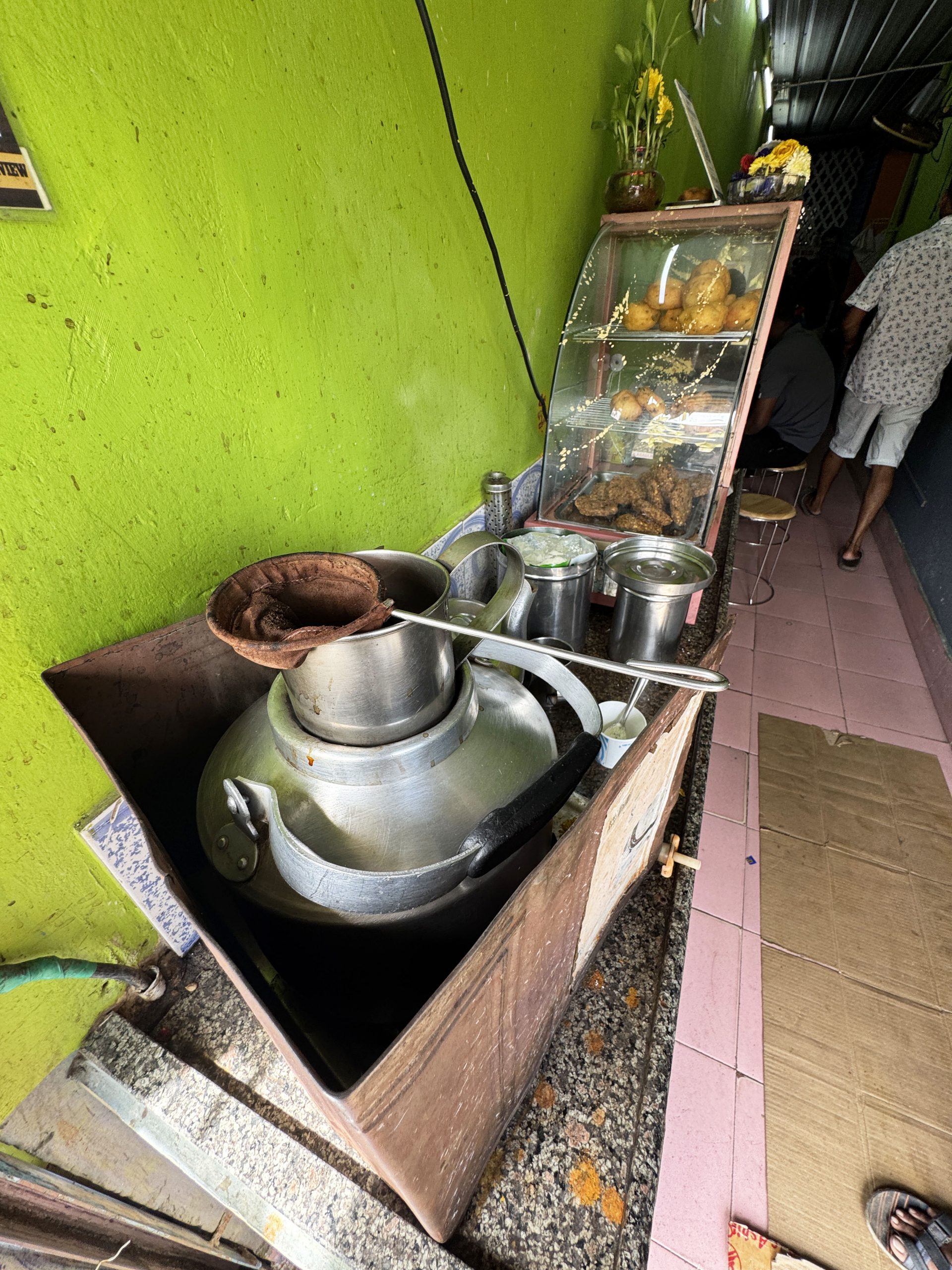 お店の入口には、チャイ職人のチャイ場があります。このタイプの大衆食堂を見つけると、たとえ満腹でも立ち寄りたくなるほど、チャイがおいしいパターンが多いです。このタイプの大衆食堂はいっぱいあるのですが、どこもだいたいチャイうまいです。