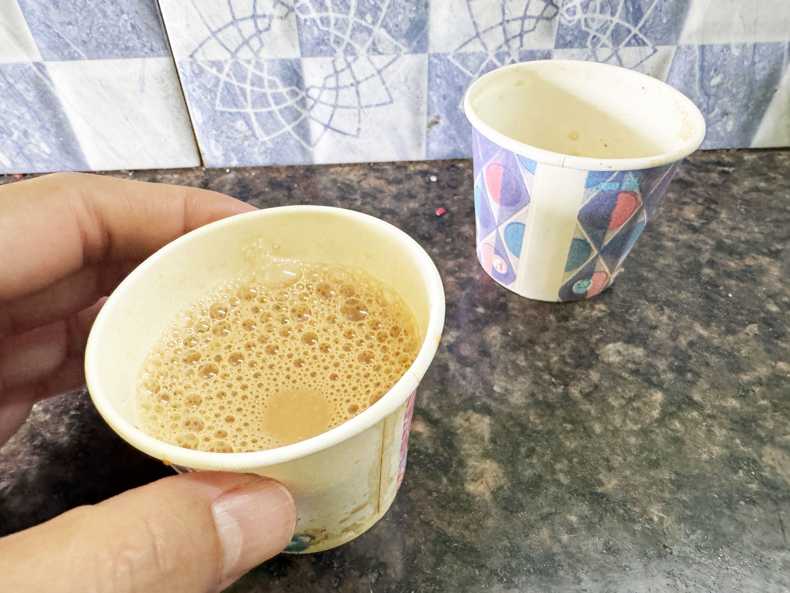 さっそくチャイをオーダー。……しかし、この日は、チャイ職人いなかった! 代わりに店主が淹れてくれることに。「手抜きされるのでは」と、失礼ながら不安に思っていたのですが、それは杞憂でした。店主、しっかり手間暇かけて注いでくれました。チャイの注ぎ方、手抜きなし。