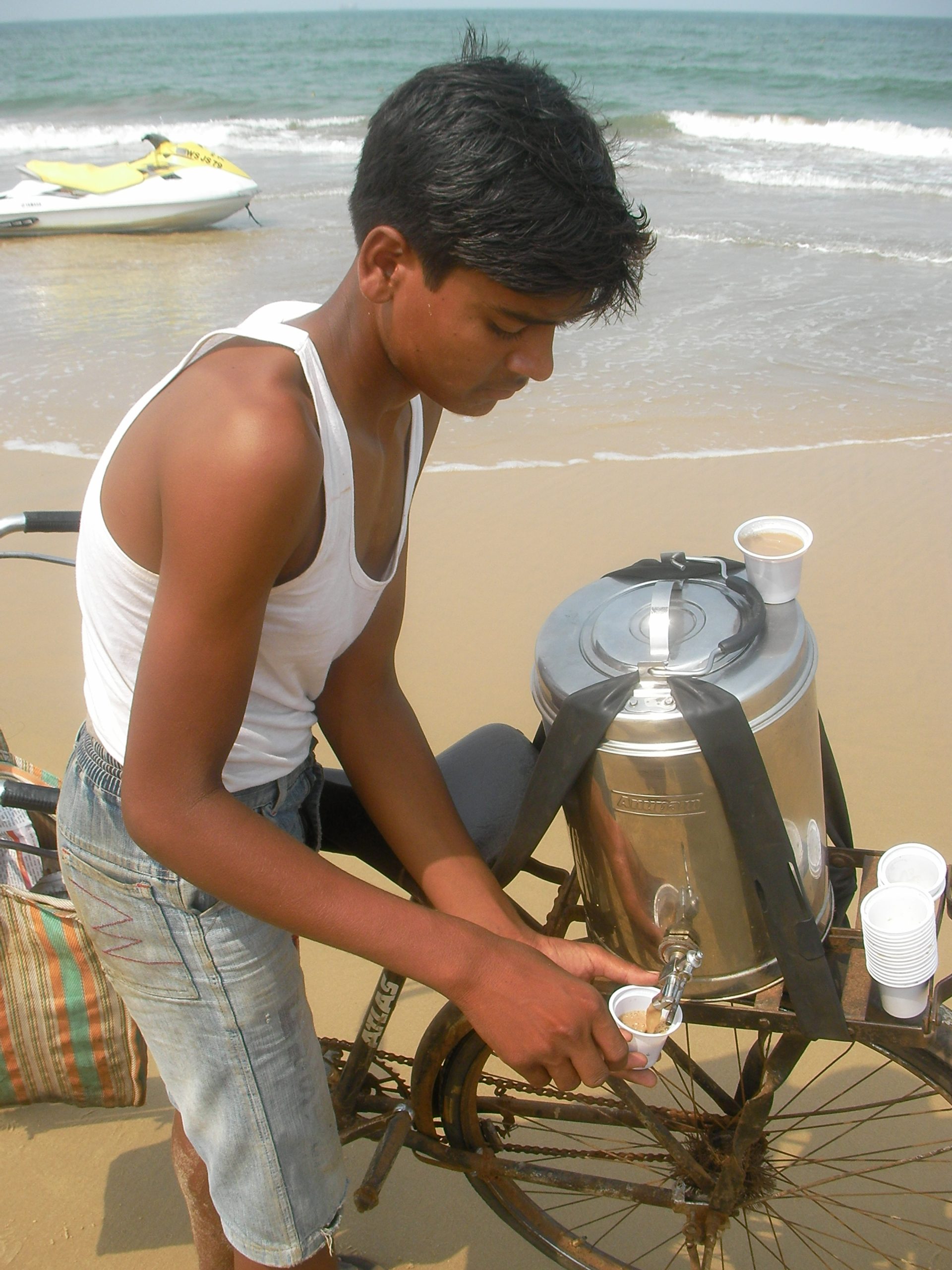 駅にポットと紙コップを持ち込んでチャイを売ってるおじさん。