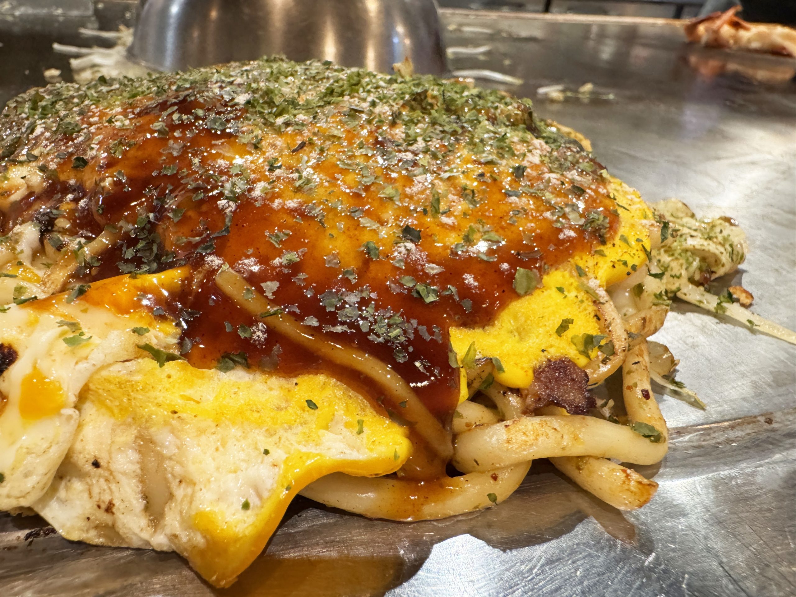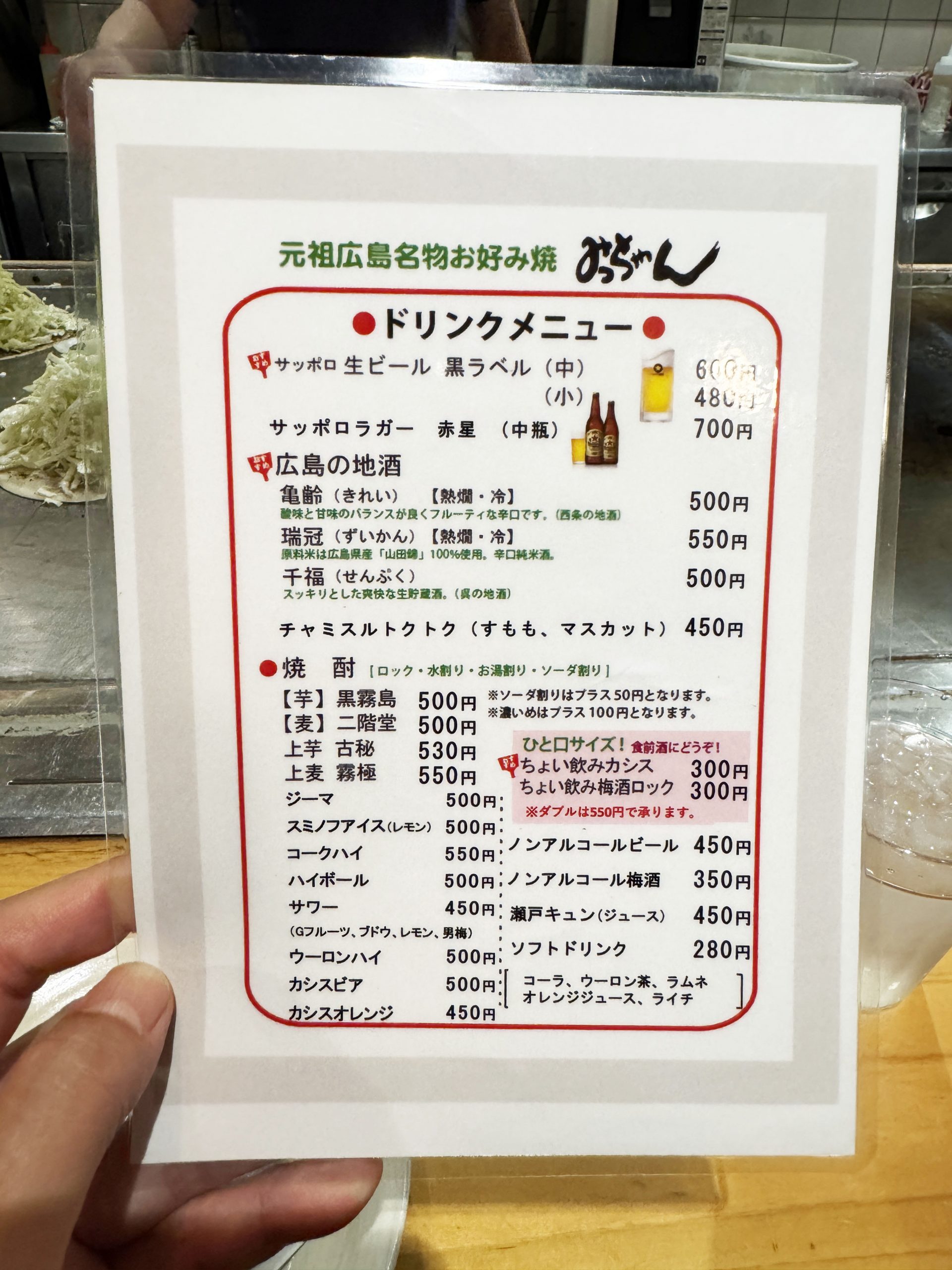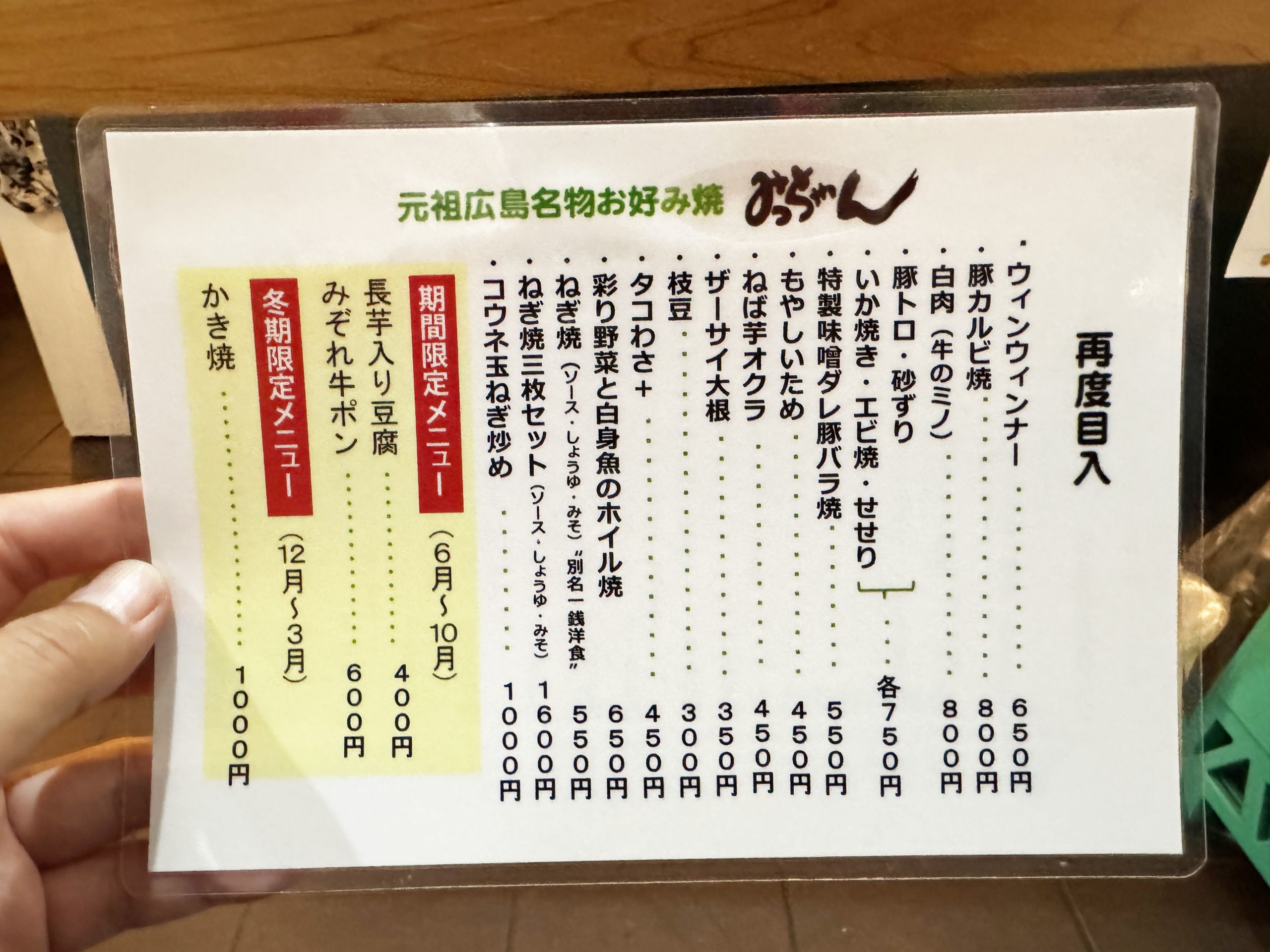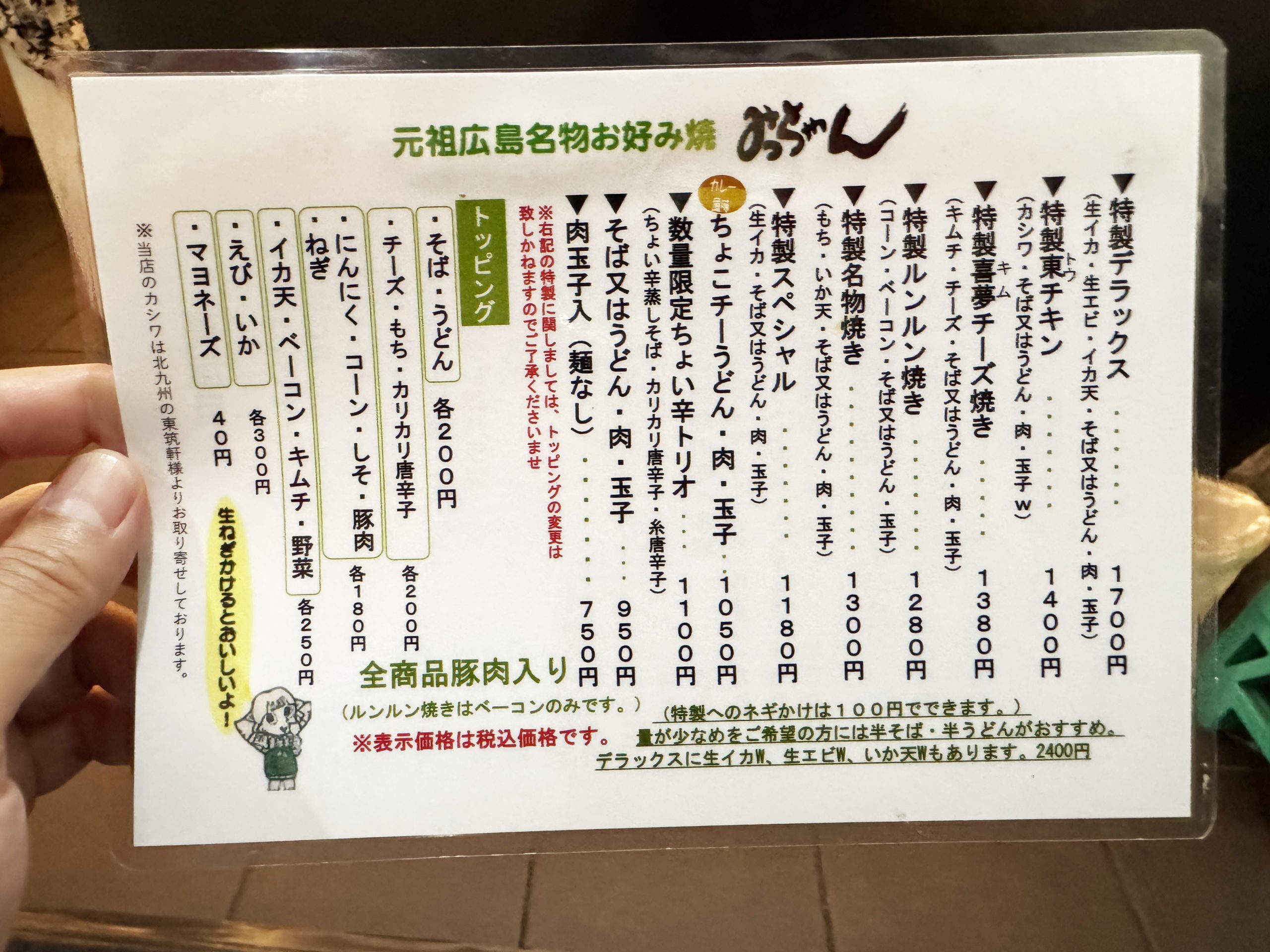 店内に入るとカウンター席とテーブル席があり、筆者はカウンター席に着席。メニューにはさまざまなお好み焼きがありました。うどん入りもある! いつもはそばにしているから、今回はうどんにしよう! ということで、うどん入りのお好み焼きをオーダー。お皿で出すか、鉄板に置いたまま食べるか聞かれたので、鉄板で食べたいと伝えました。