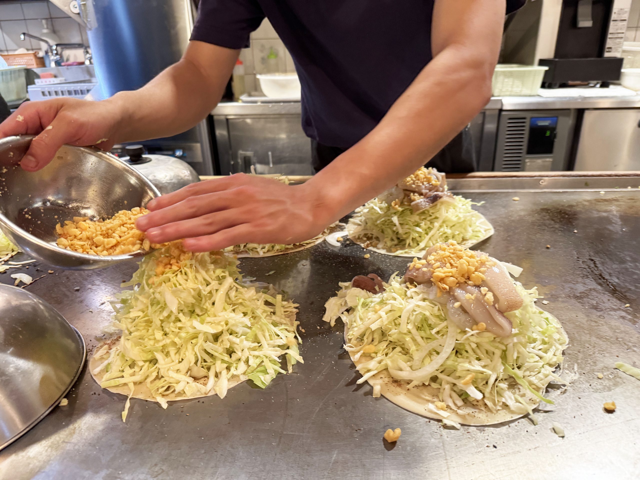 目の前でお好み焼きを作るようすを見ることができます。かなりダイナミックに、そして丁寧に作られていきます。具が盛られていくようす、見ているだけで楽しいです。
