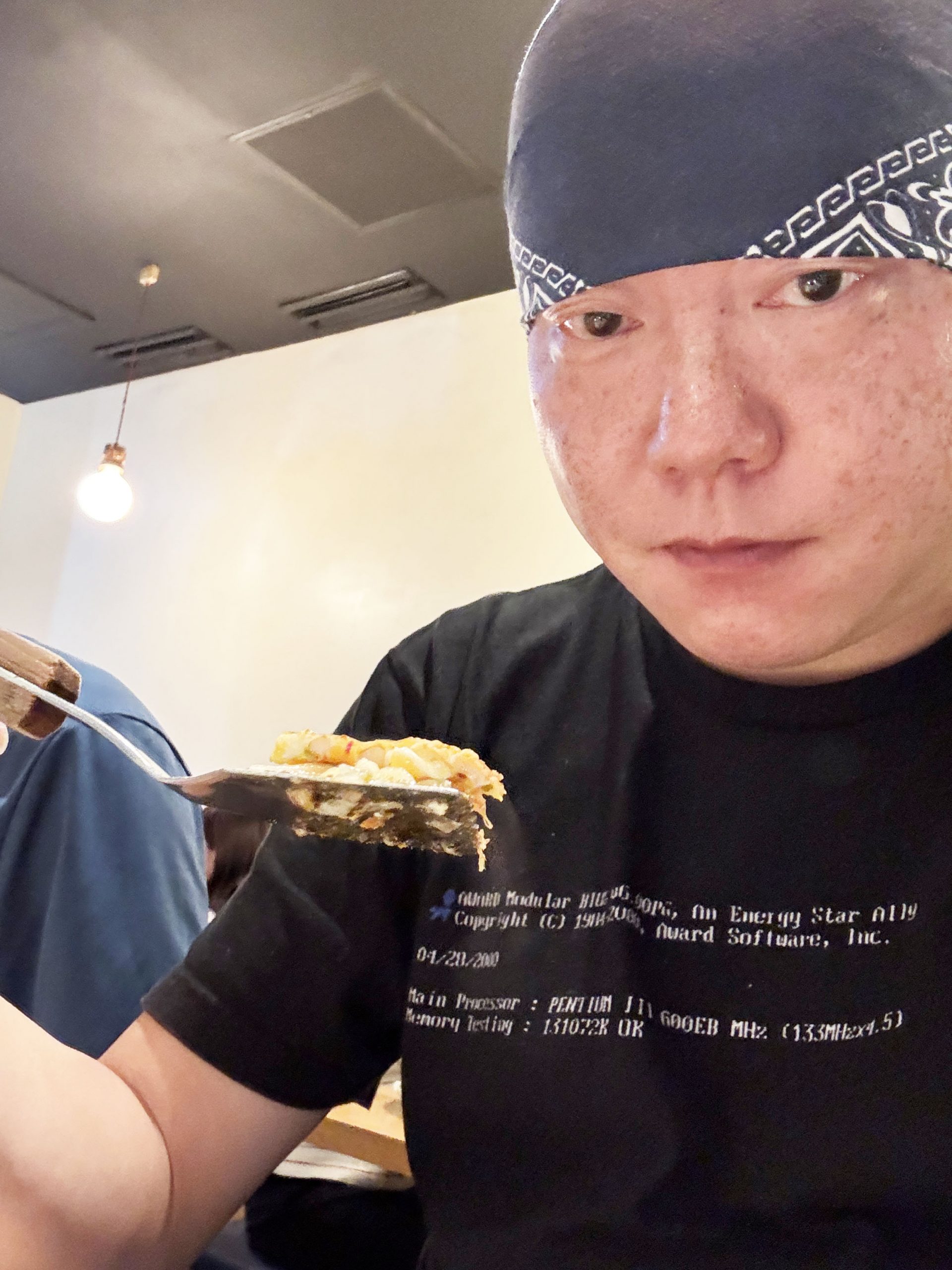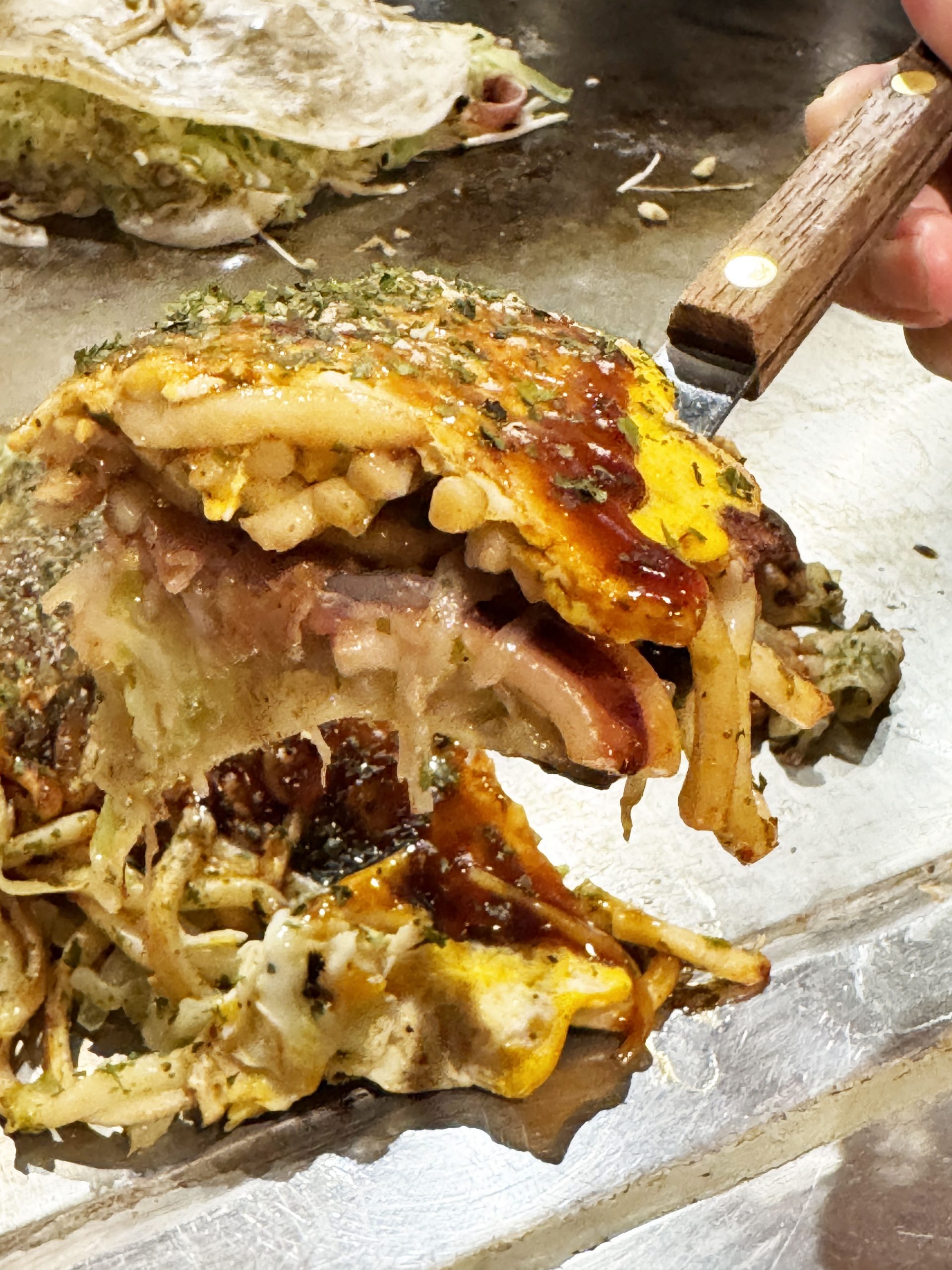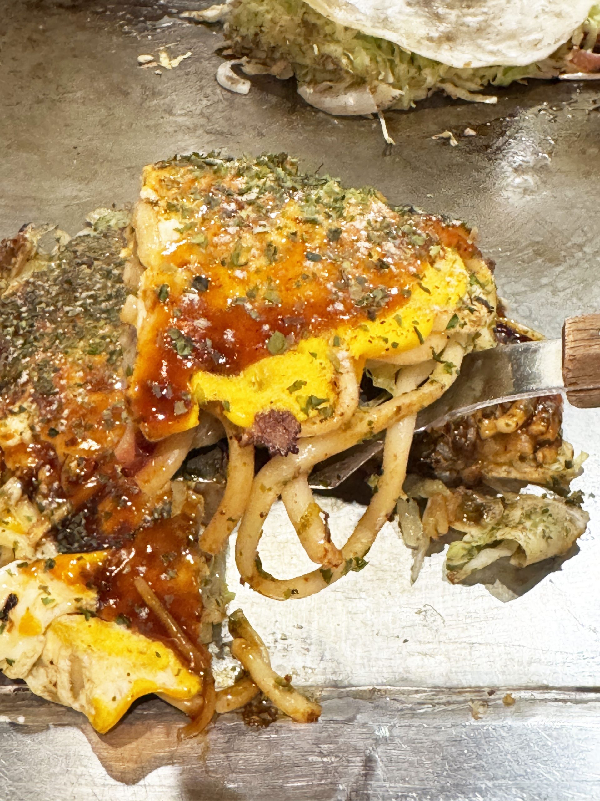 ということで、ヘラでお好み焼きをすくい取り、端から少しずつ食べていきます。