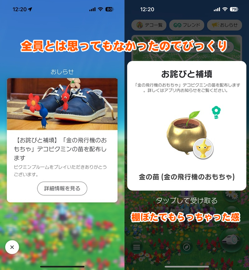 先日より全プレイヤーを対象に“金の飛行機のおもちゃ”を身に付けたデコピクミンの苗が配布を開始。