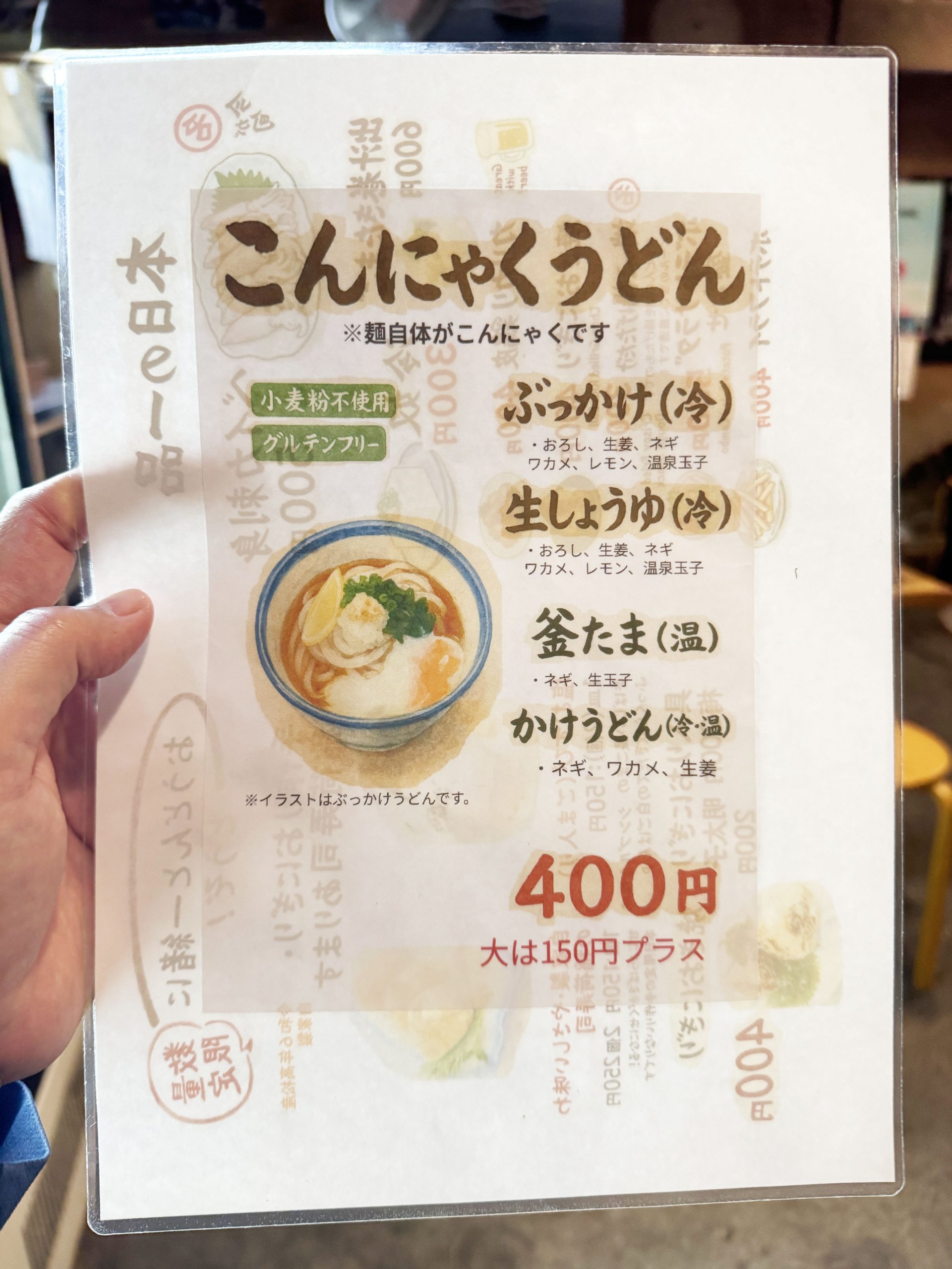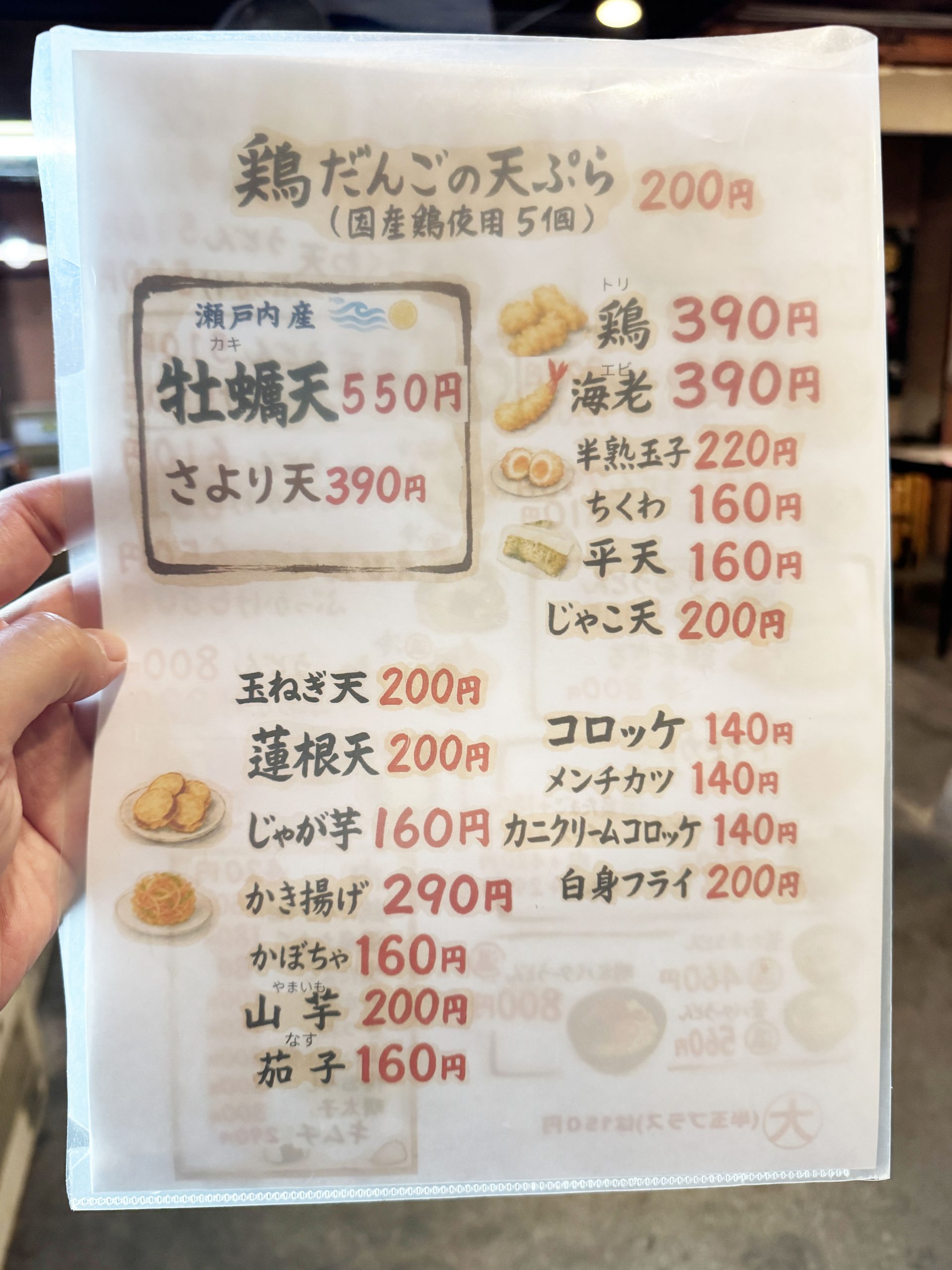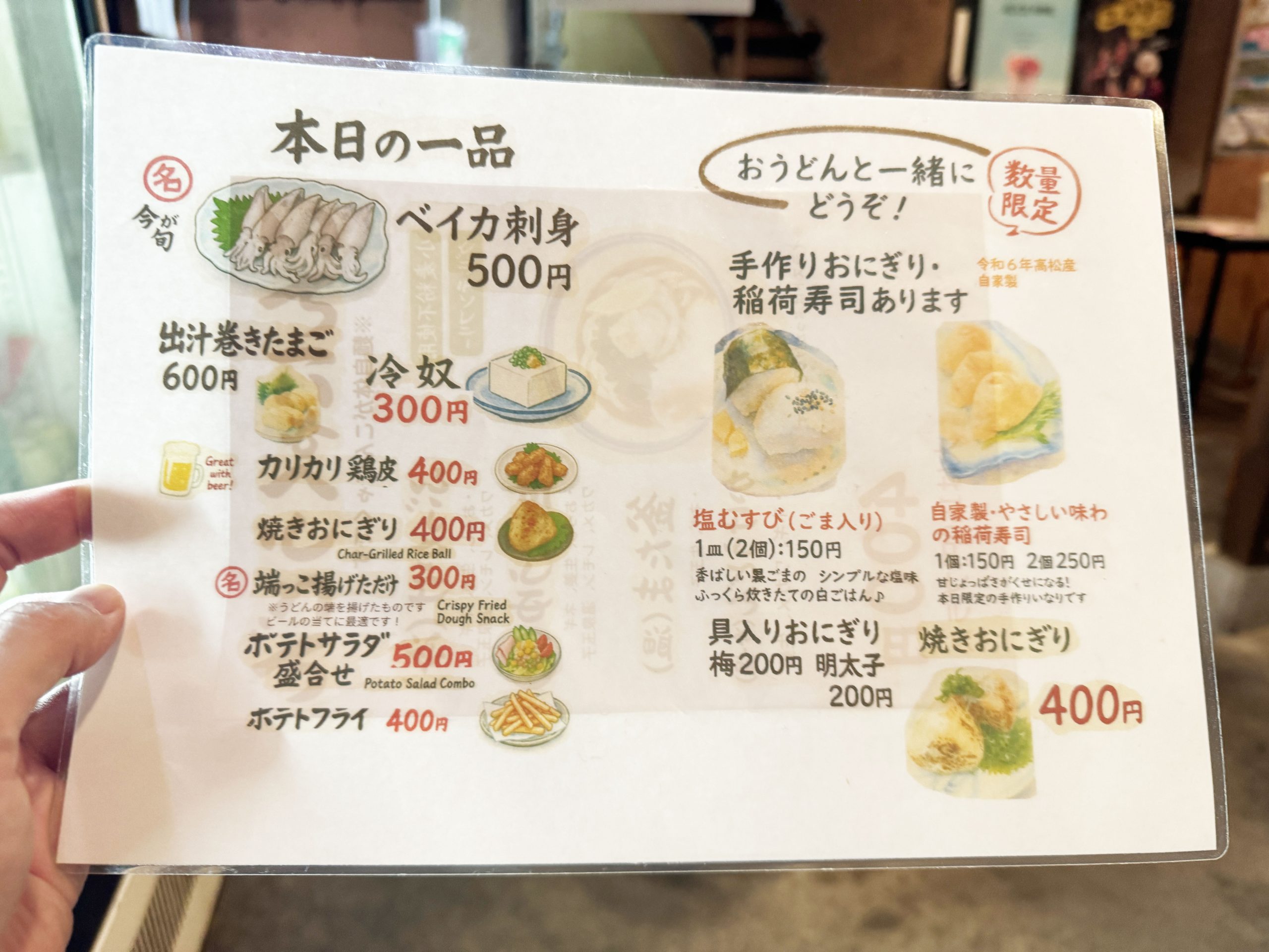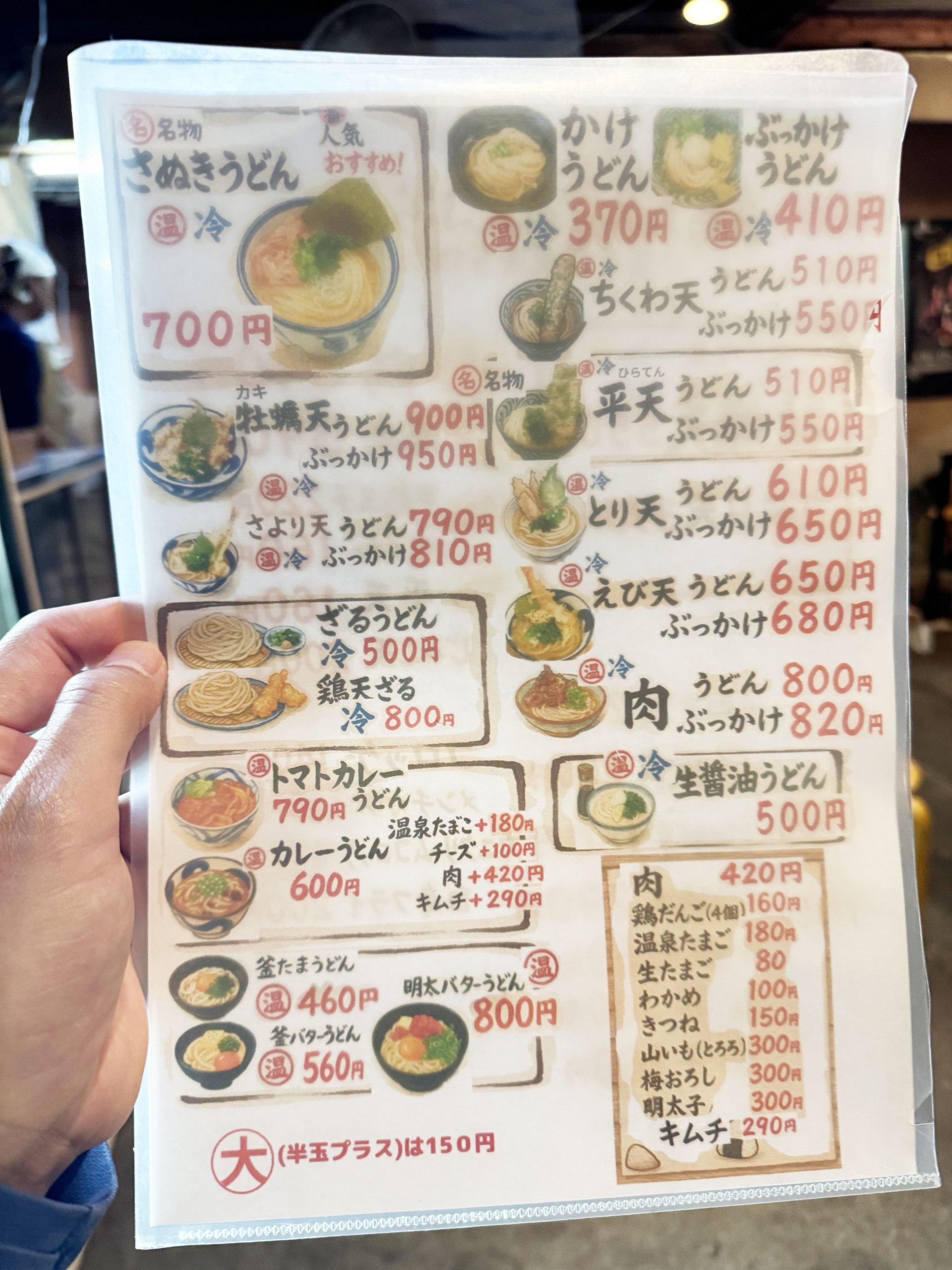 メニューを見てみると、けっこう多くのうどんラインナップ。かけうどんから釜玉うどんまでいろいろありました。なにより揚げ物の種類が豊富なのも嬉しいですね。