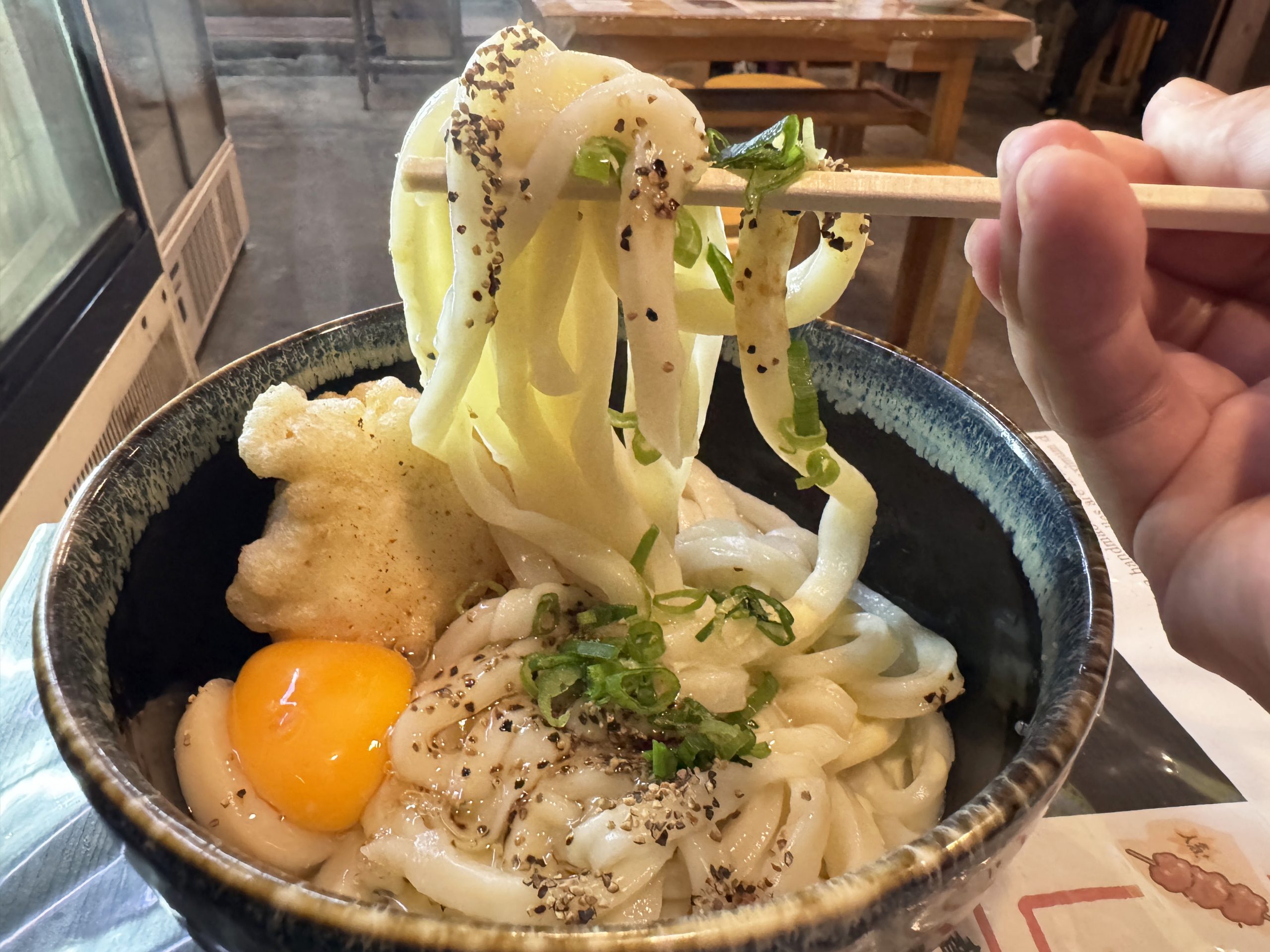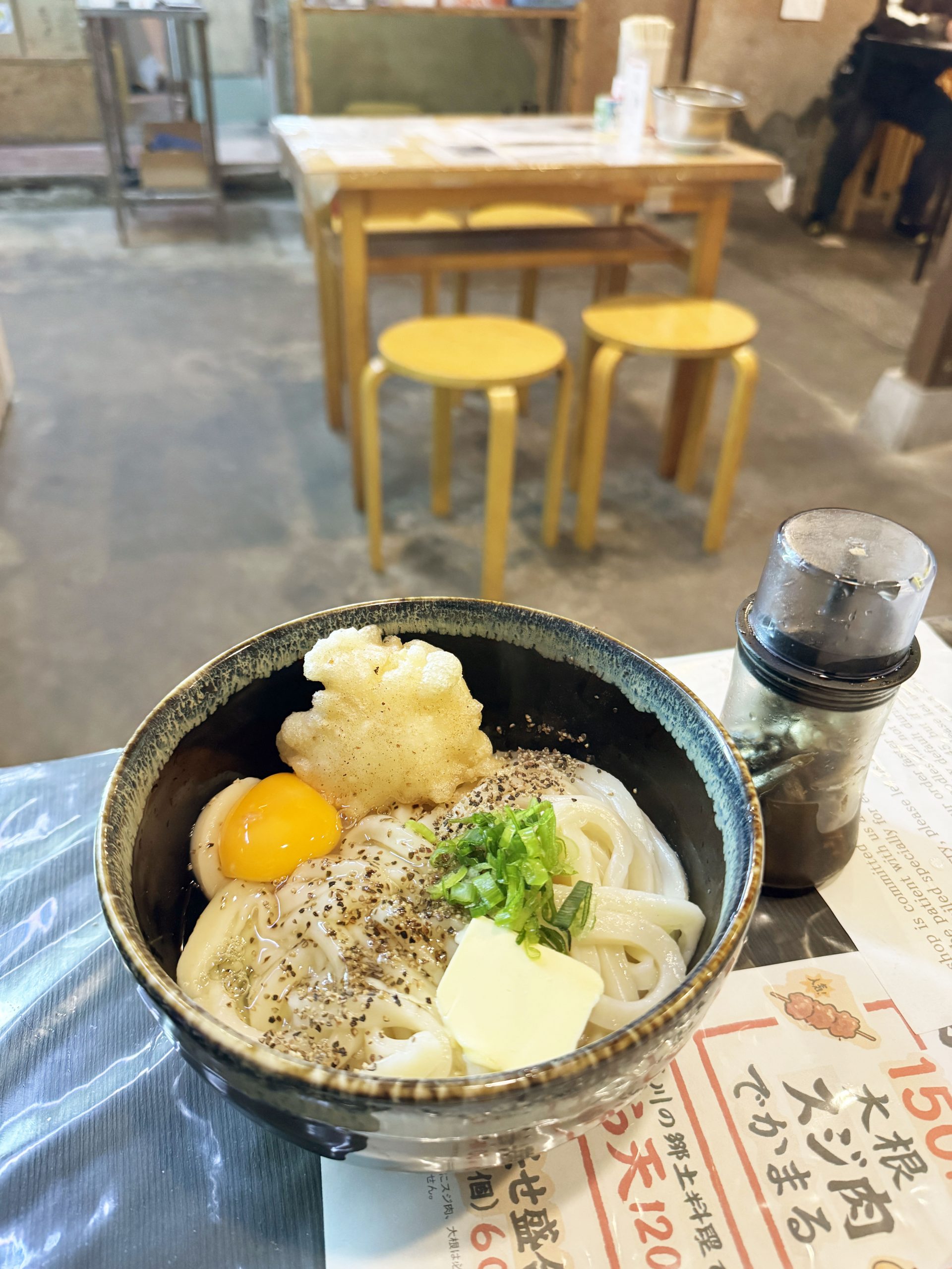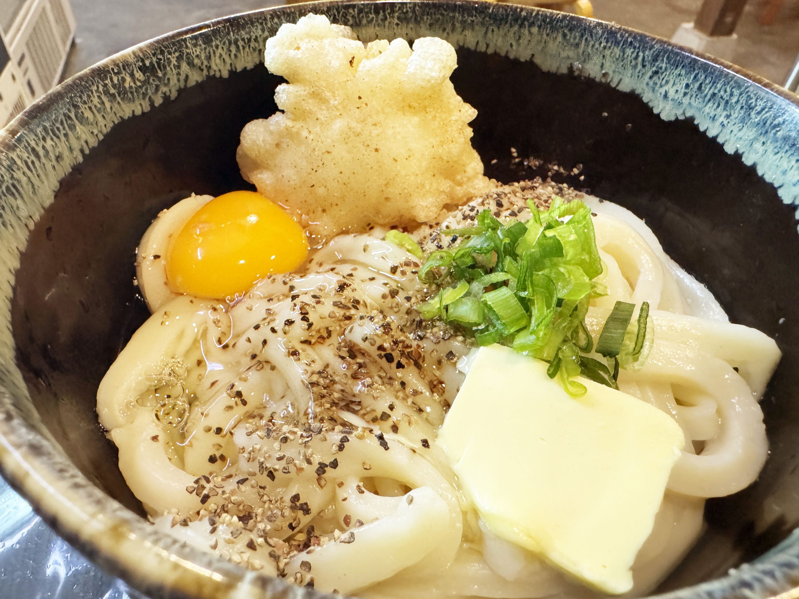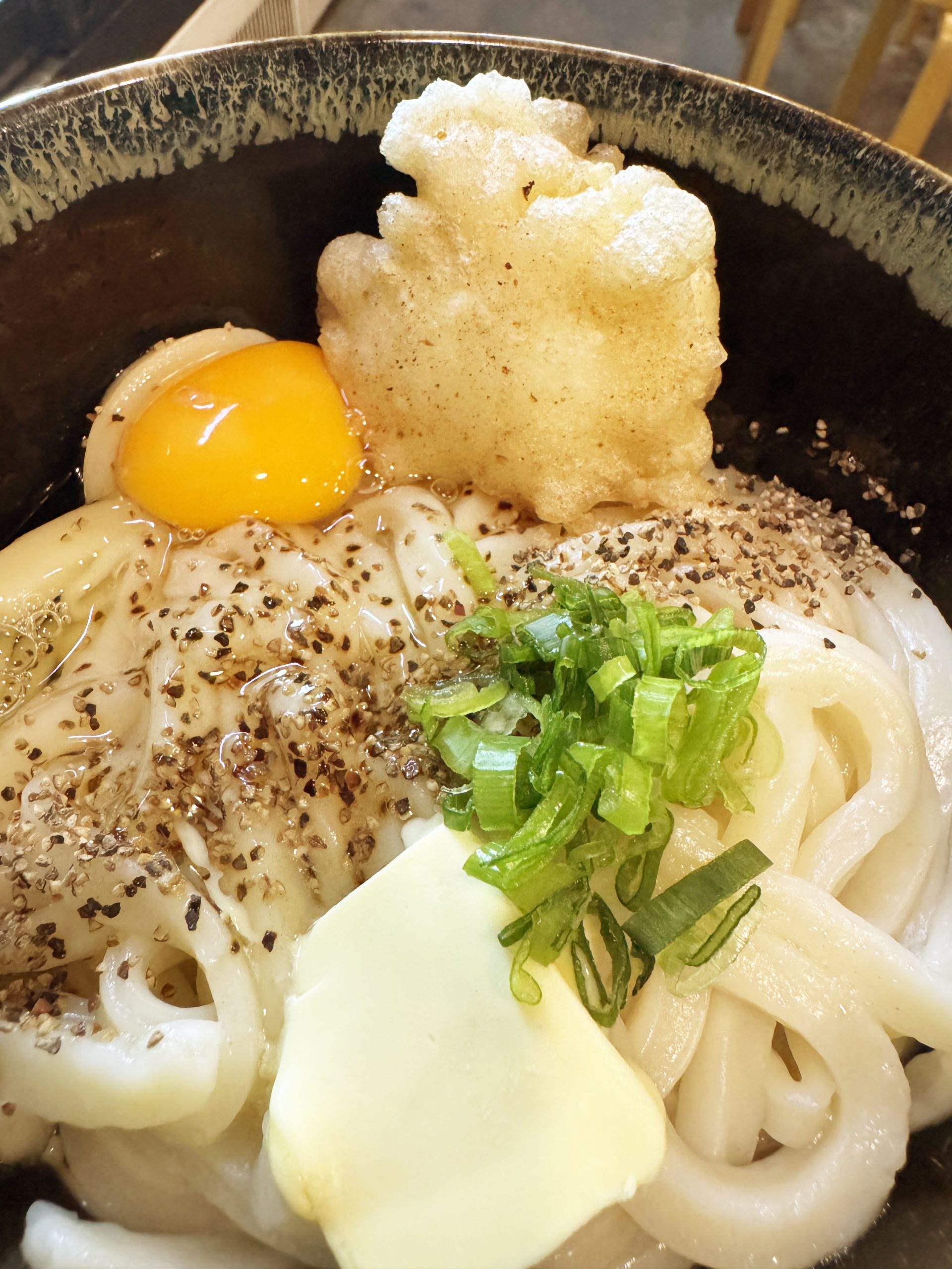今回オーダーしたのは「釜バターうどん」に鶏天をトッピングしたもの。定番のうどんは食べたいけれど、バターの魅力も楽しみたい。なんなら、バター味のうどんと一緒に鶏肉も食べたい。そんなワガママの具現化。