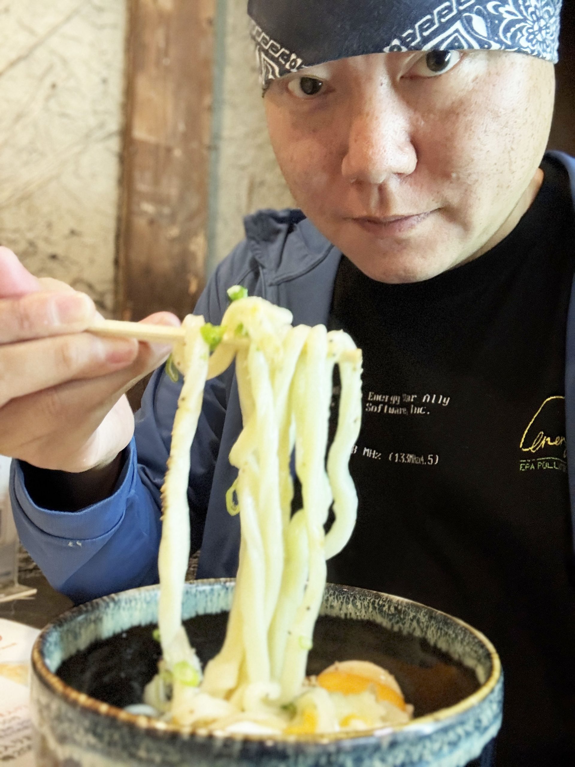 さっそく食べてみたのですが、期待を裏切らない、うンまいうどんでした! 極太のうどんは、食べるとモチッ! ただのモチッ! ではなくて超モチモチッ!! そこにバターの芳醇なテイストが合流。さらに卵黄の強いコク、たまりません。