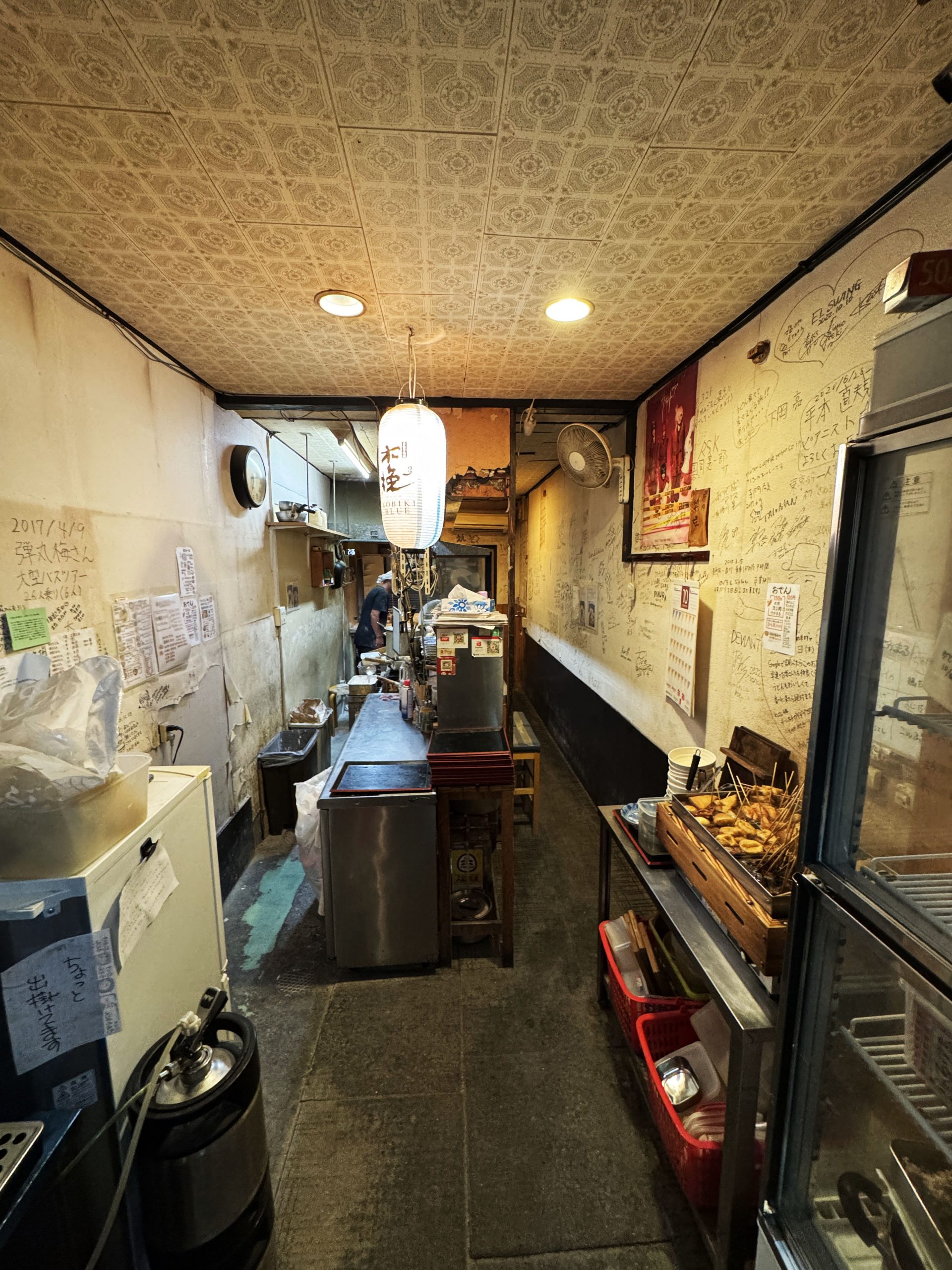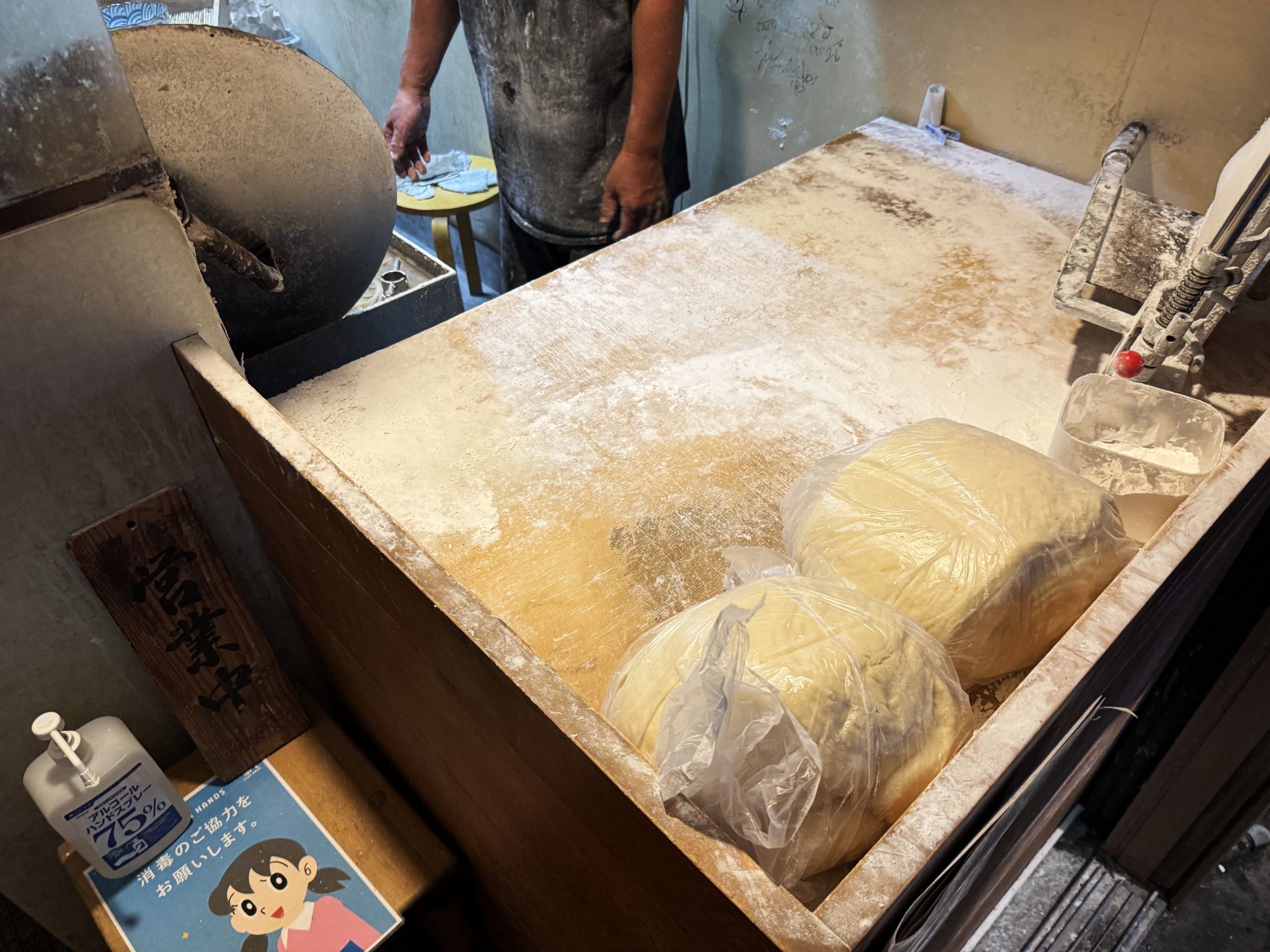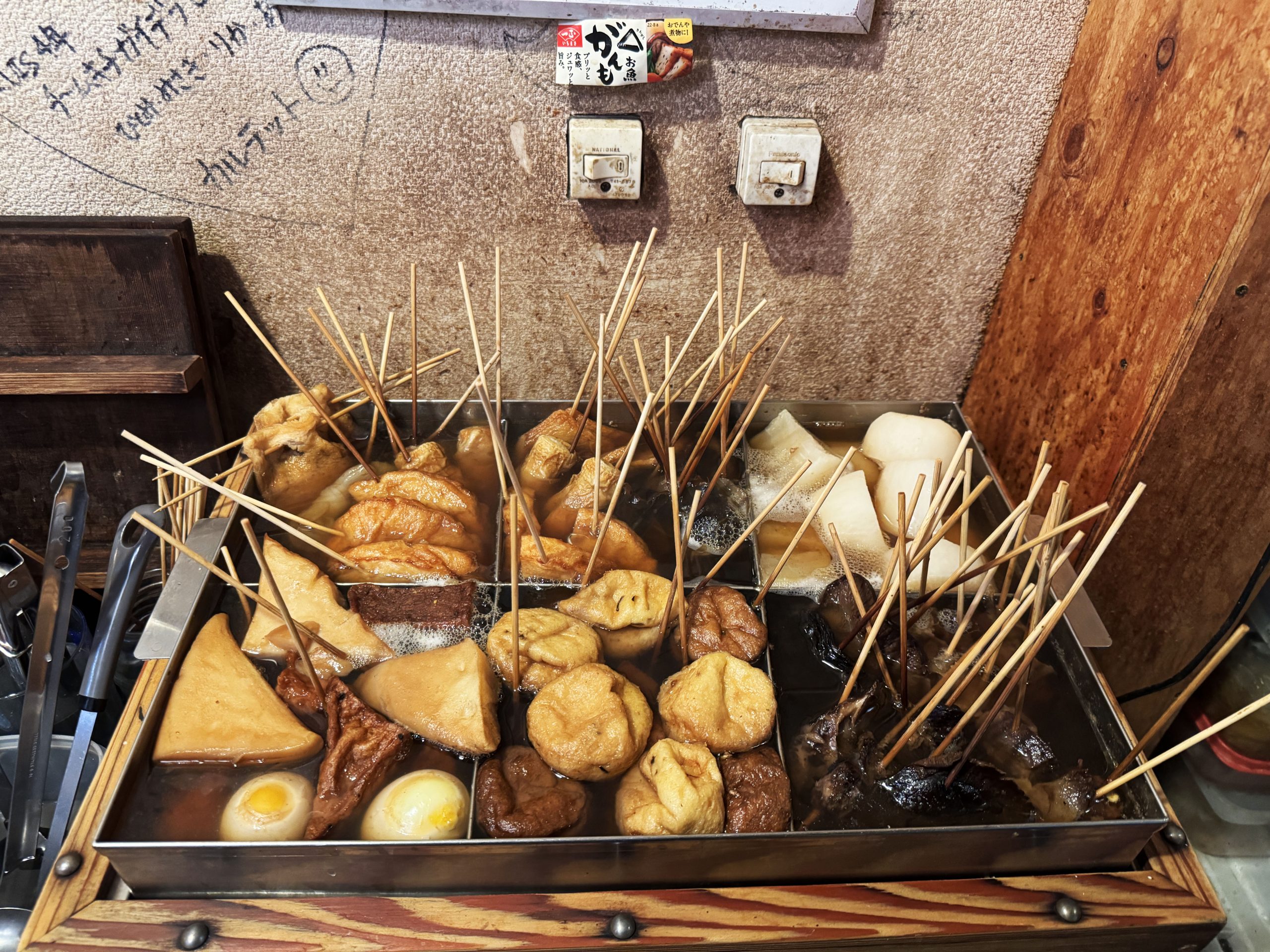 お店の入口にはうどんを打つ場がありました。本格的! 店員さんにお願いして撮らせてもらいました。入店時からワクワクが止まりません。そして、おでんもありました。これは、なんていうか、もう、ビジュだけで優勝です。食べたい、おでん……。