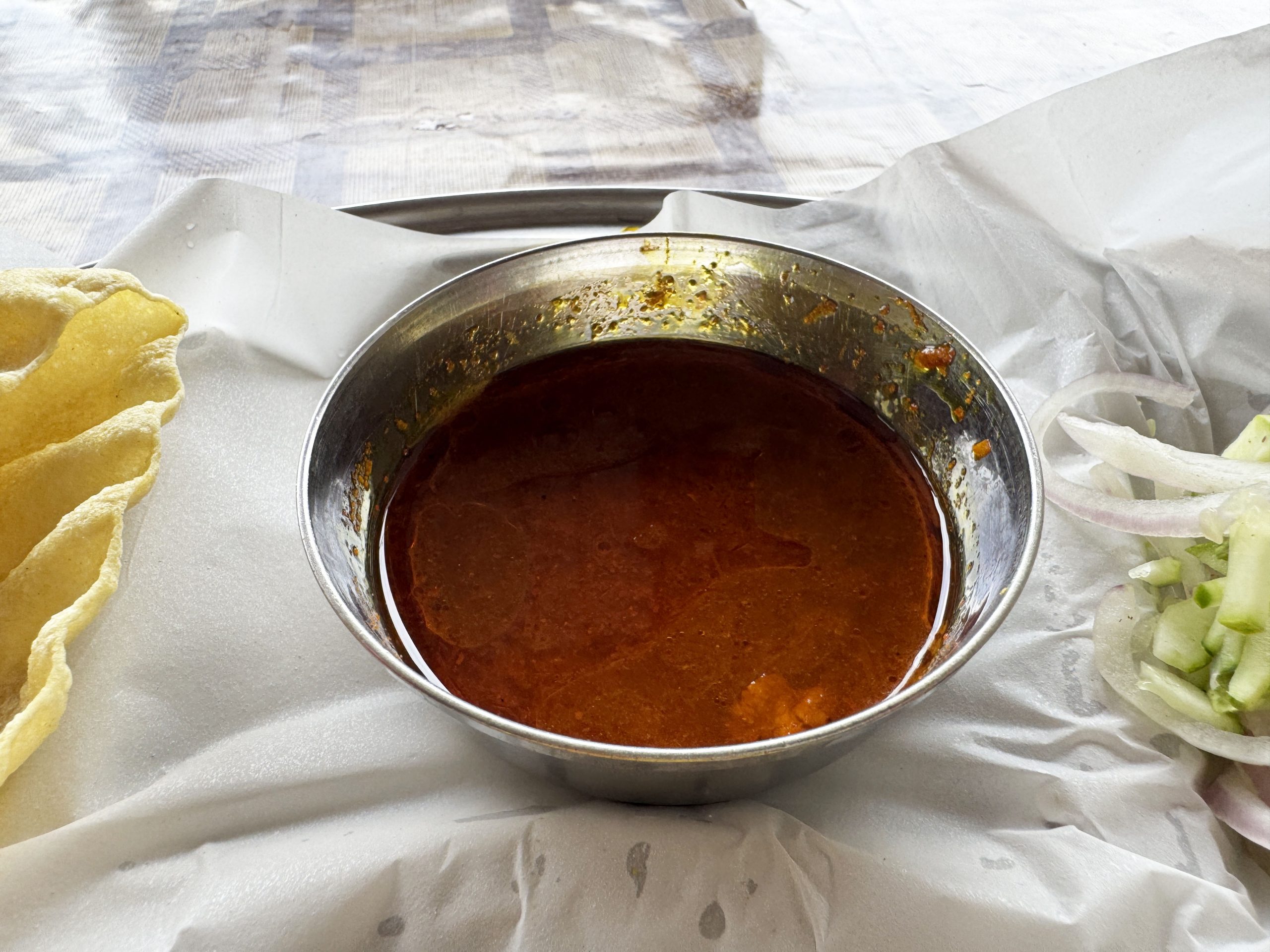 でも、数年前、インドにあるビリヤニがおいしいと評判の大衆食堂に行ったら、ビリヤニにインドカレー的なモノがついてきたことを思い出しました。あれ、なんとなくビリヤニにかけて「おいしい」と思っていたけど、インドカレーだったのか、それともサンバル的なスープ?