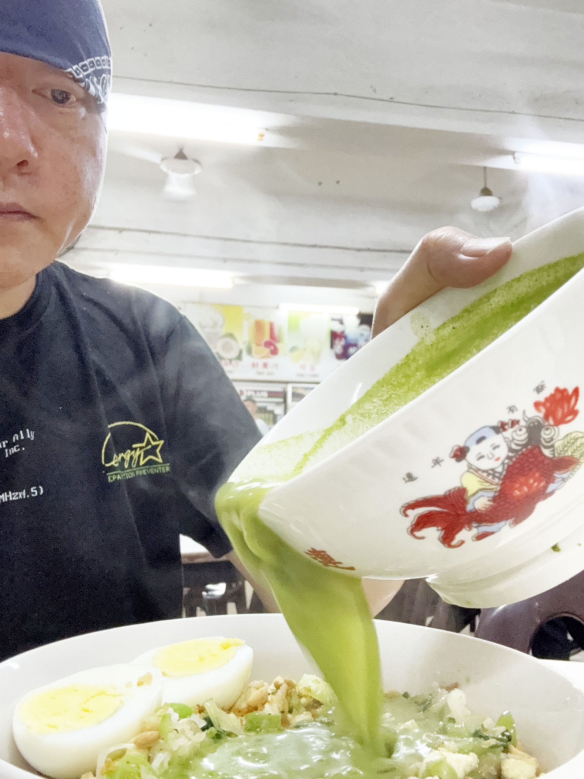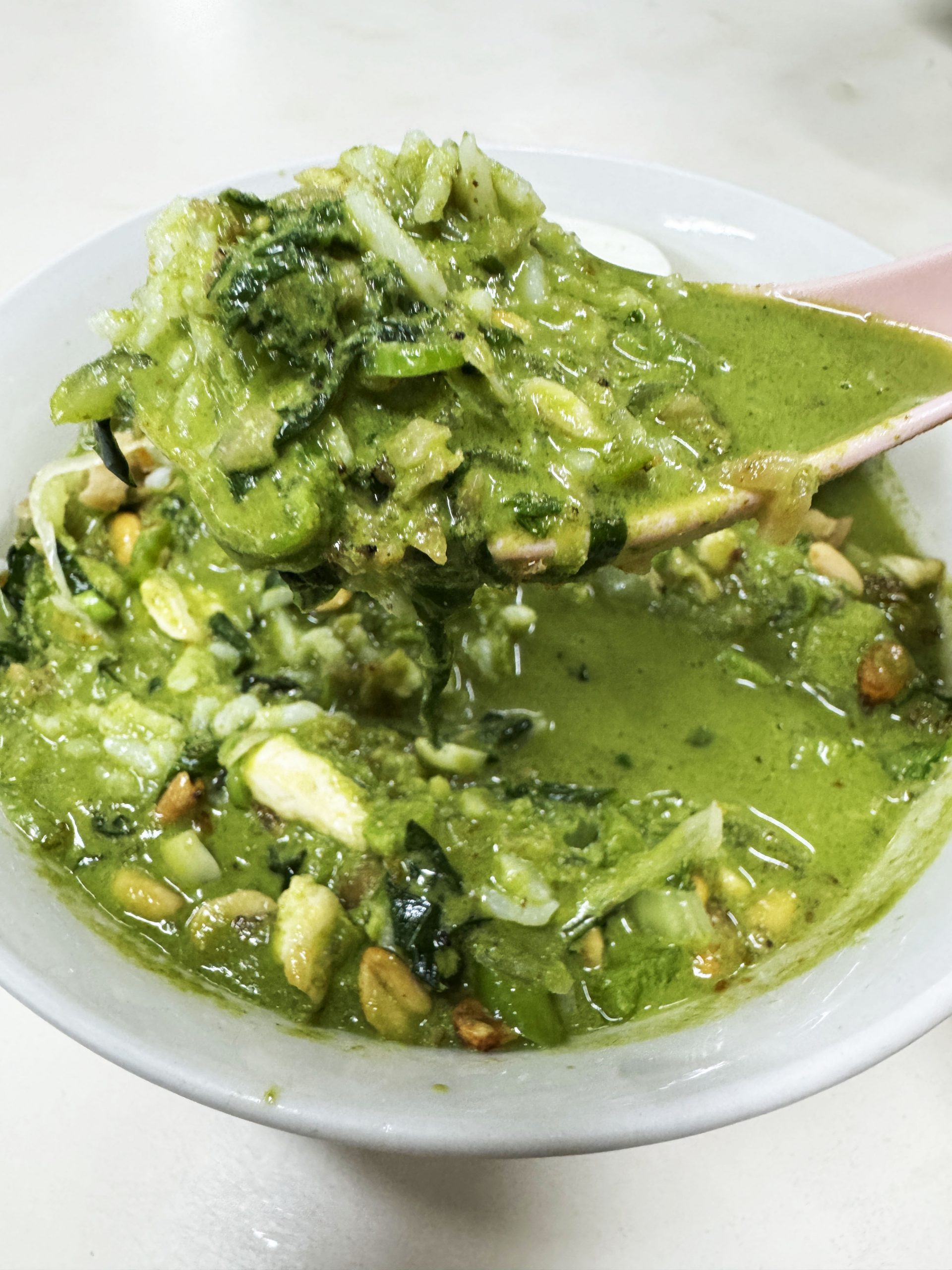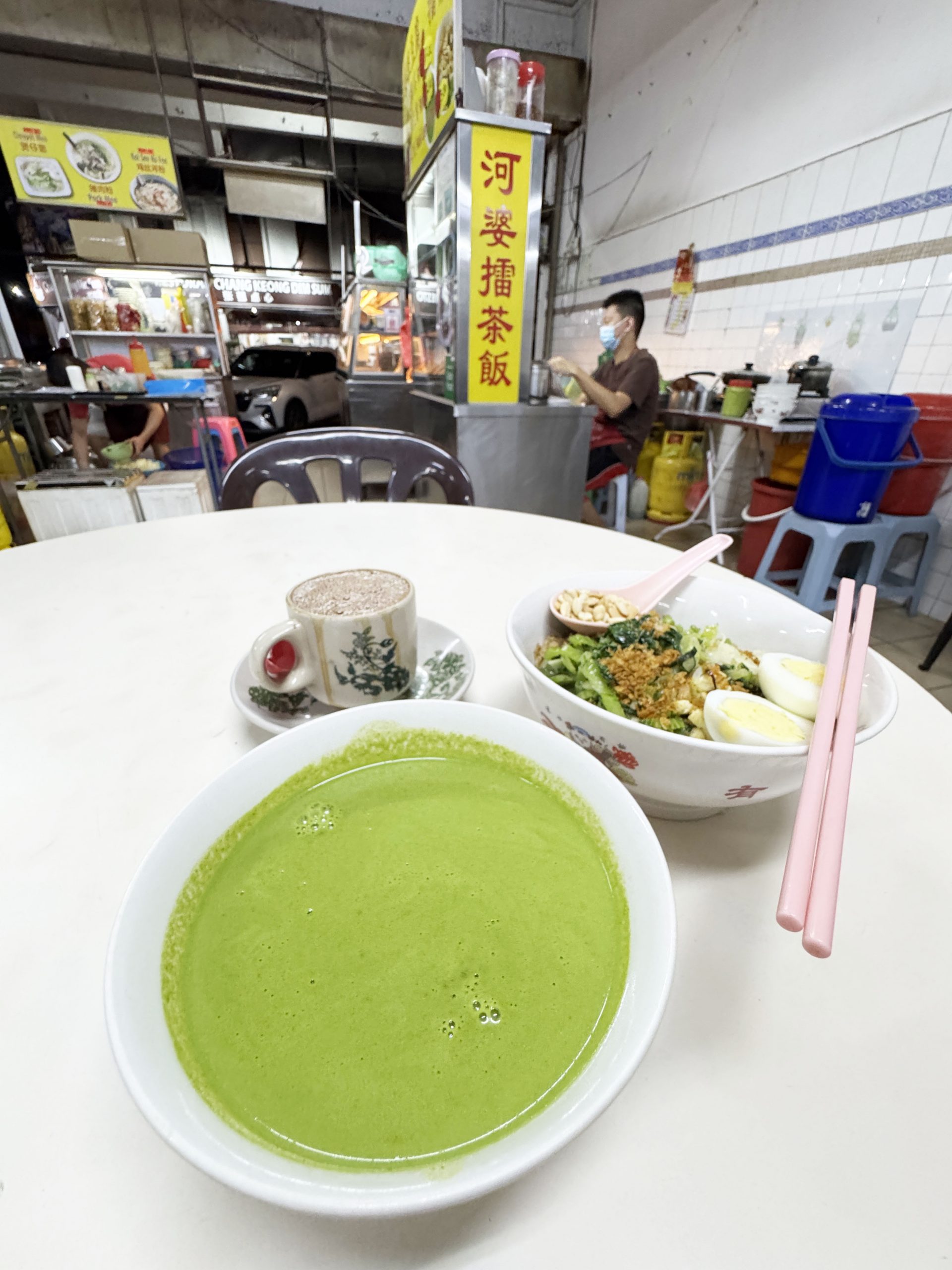 マレーシアや周辺地域では定番ともいえるお茶漬け的な料理があります。それは「雷茶」(レイチャ)。茶葉、茶、バジル、ミント、胡麻、ピーナッツ、ハーブなどで作った緑色の汁を穀物等にかけて食べる料理です。