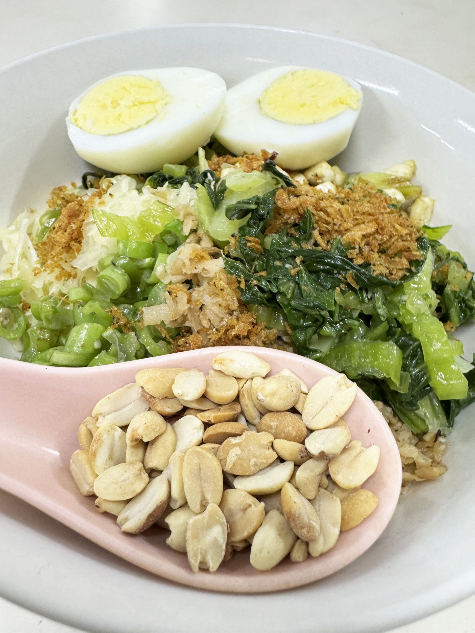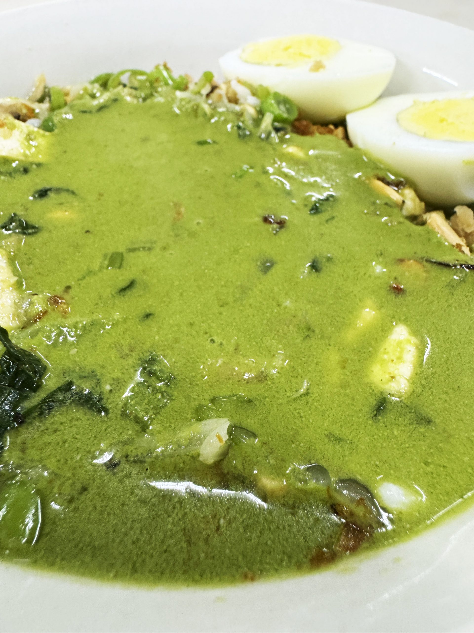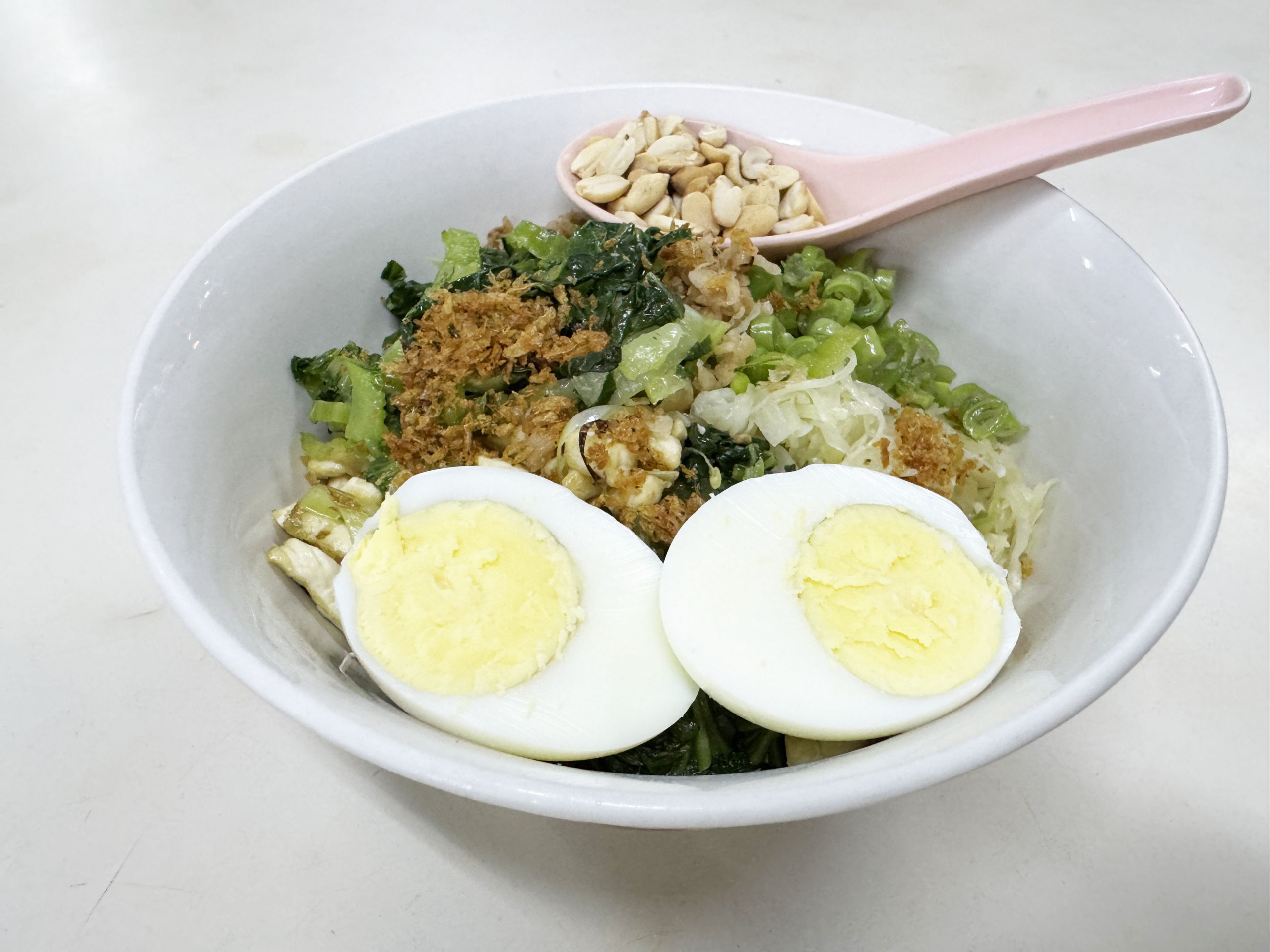 緑色の汁がかなり印象的な料理ですが、緑色の汁だけでは完成となりません。ピーナッツなどの穀物、葉野菜、大根、インゲン、玉子、フライドオニオンなどが入った丼に、緑色の汁をかけて完成です。