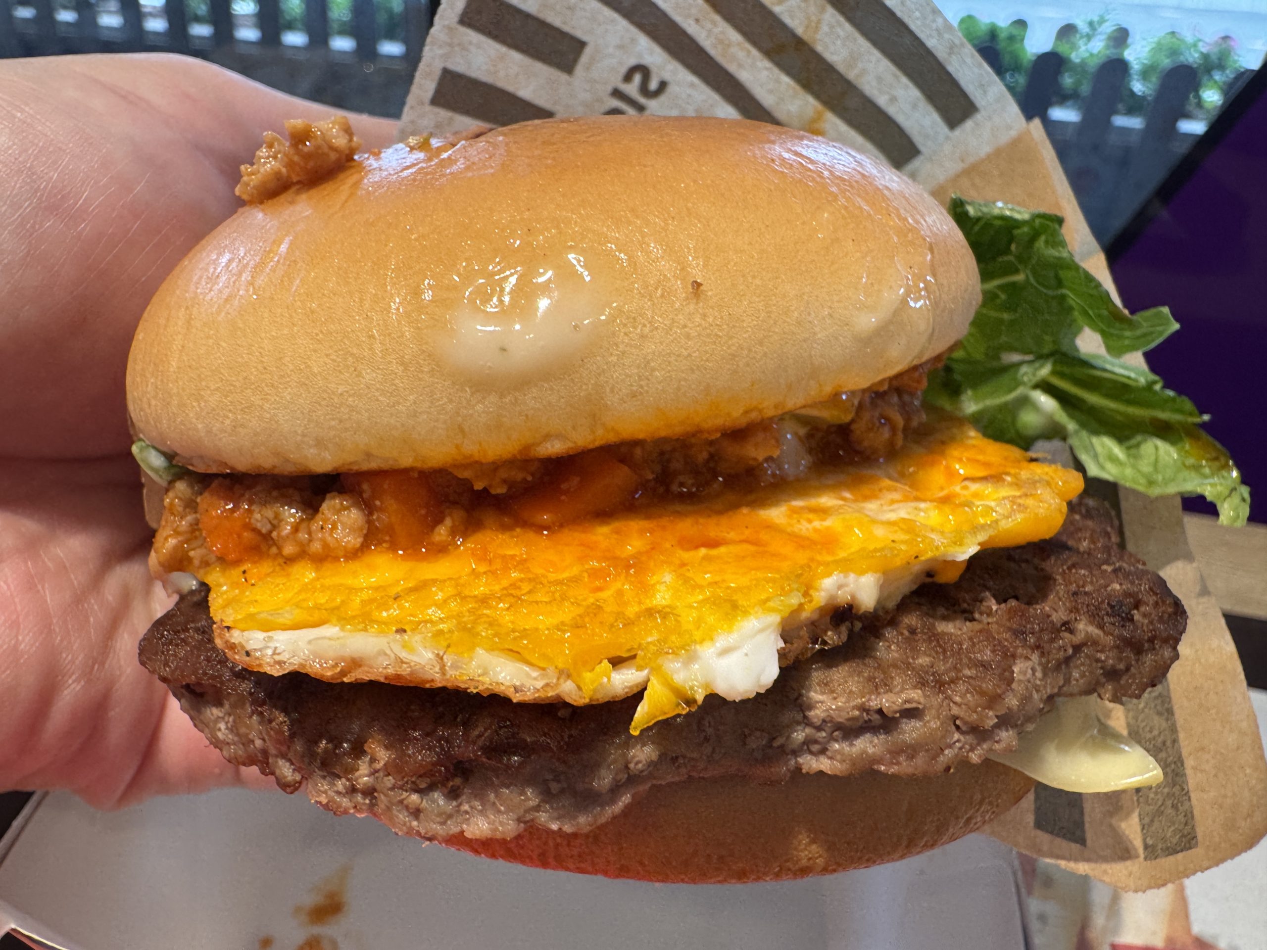 実際にボロネーゼ・アンガス・エッグバーガーを食べてみたのですが、かなり、本格的。とてもリッチな食べ応えのあるバーガーに仕上がっています。