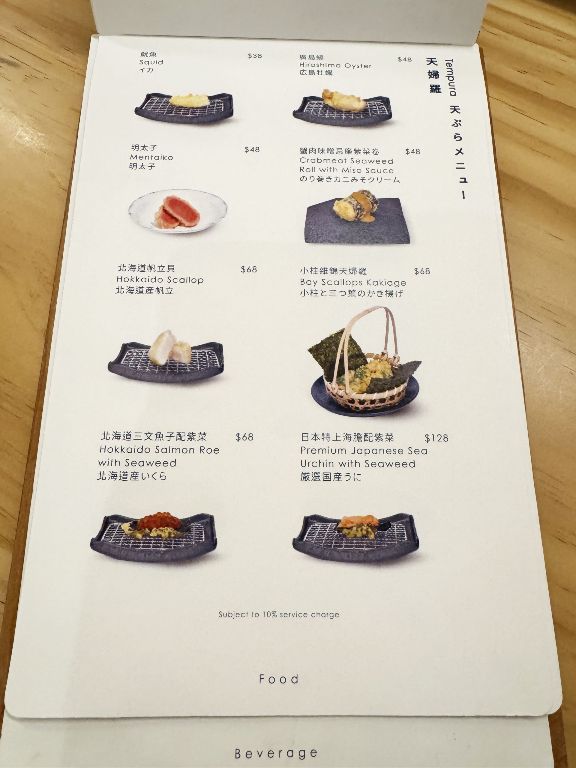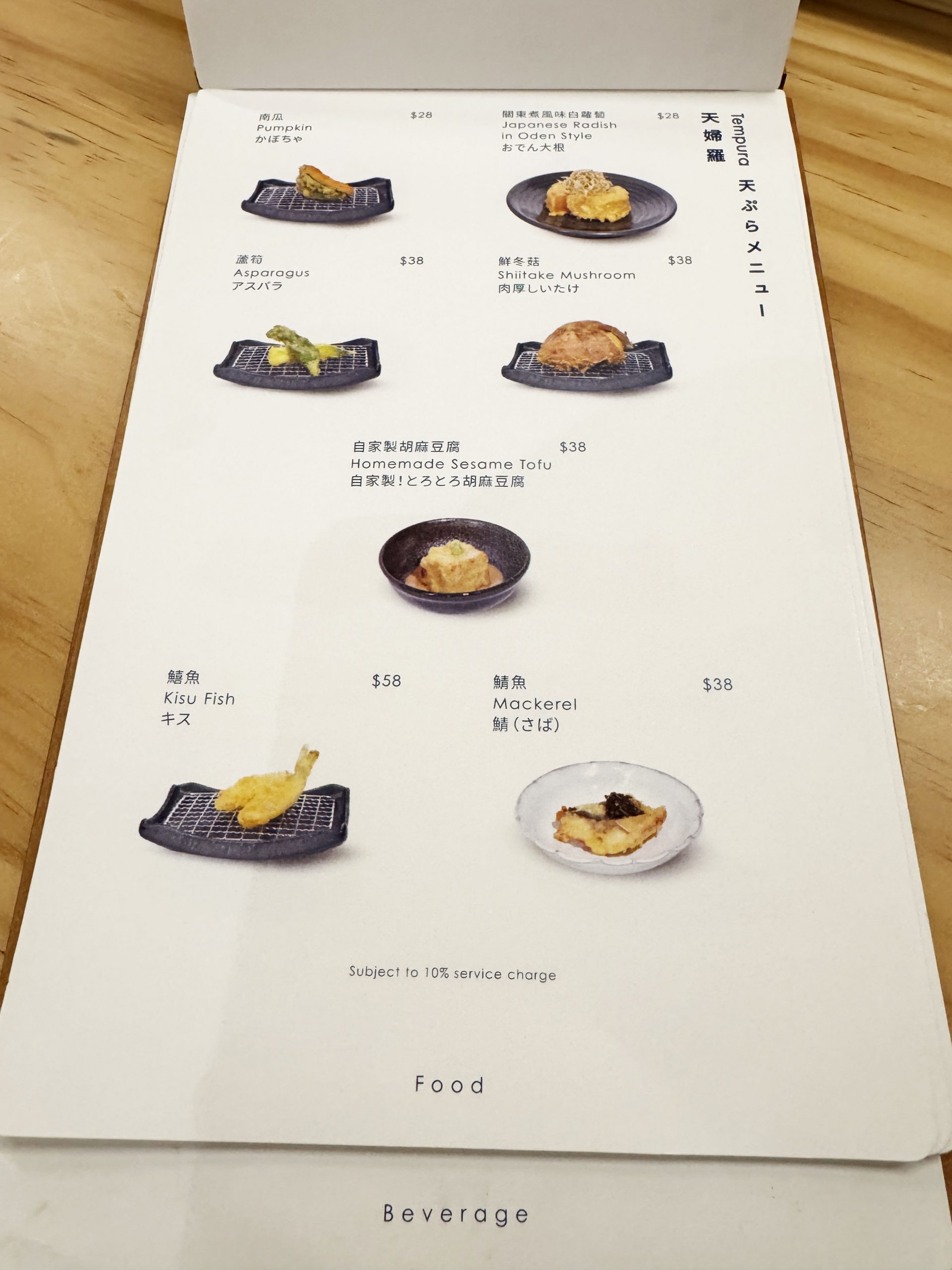 着席。メニューを見てみると、かなり天ぷらの種類が豊富。そして一品料理もたくさんありました。いちご、ミカン、リンゴ、餅天ぷらのアイス添えなど、スイーツ系の天ぷらが多くてワクワクします。