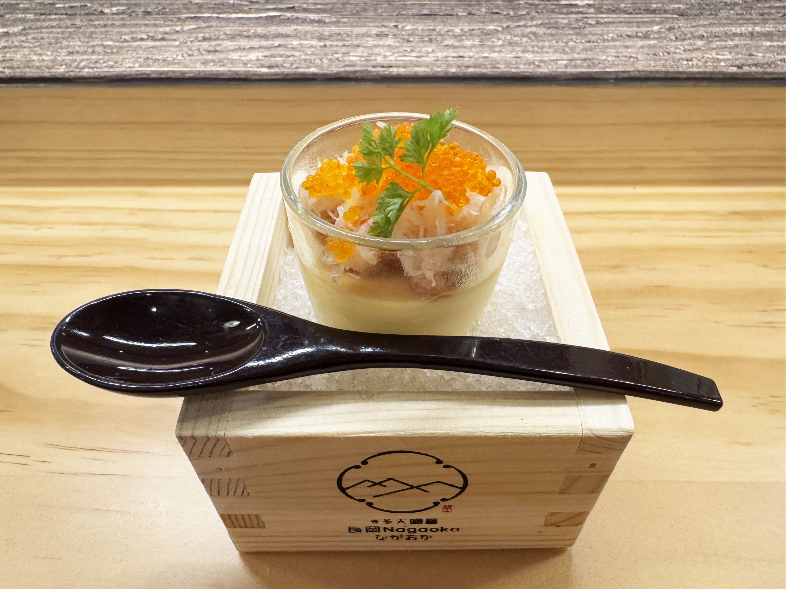 やってきた蟹プリン。プリンの上に蟹がのっているのですが、酒枡に入っていて、雰囲気が和風です。単にガラスの器で出されるより気分がアガります。嬉しい。