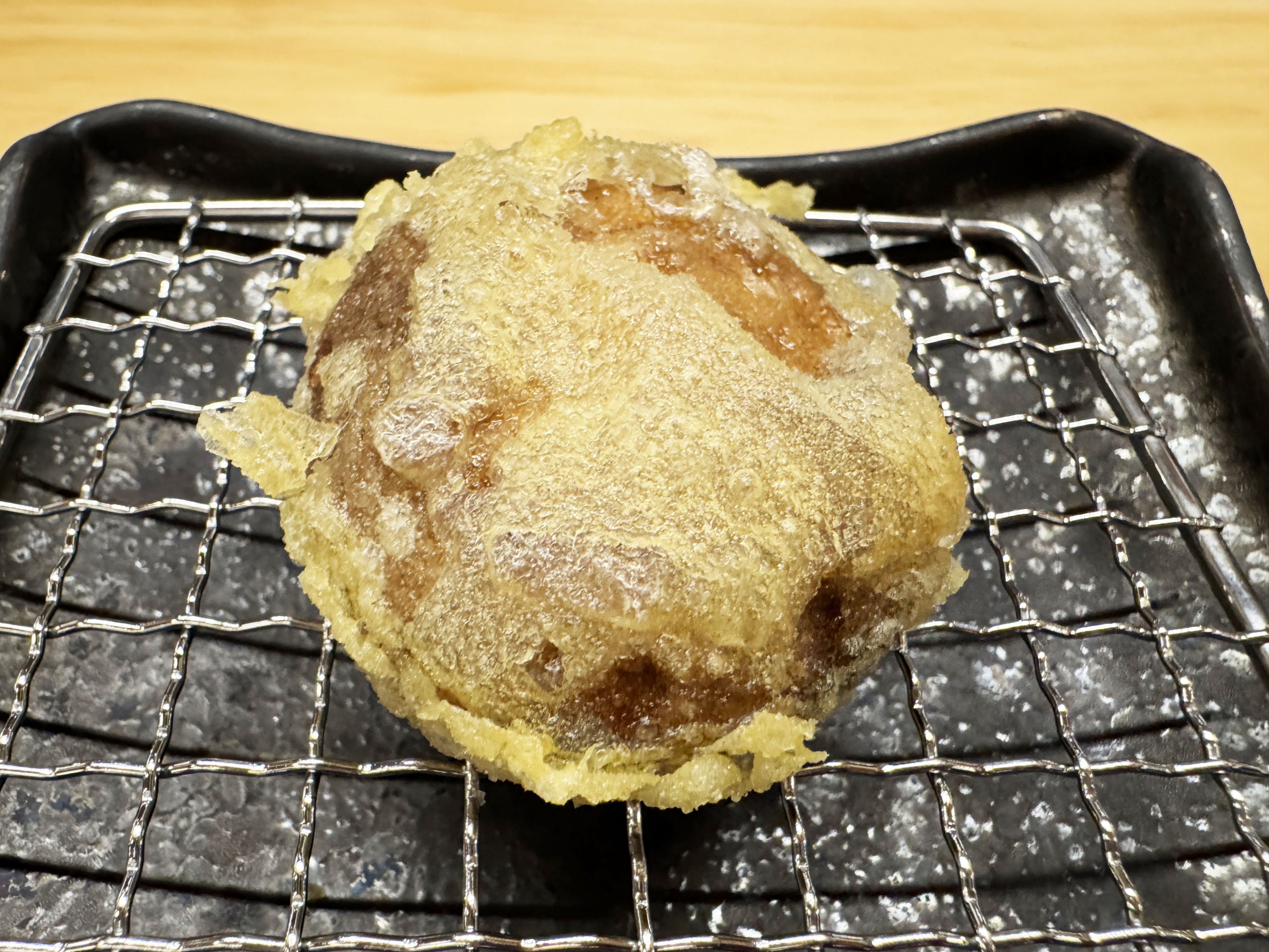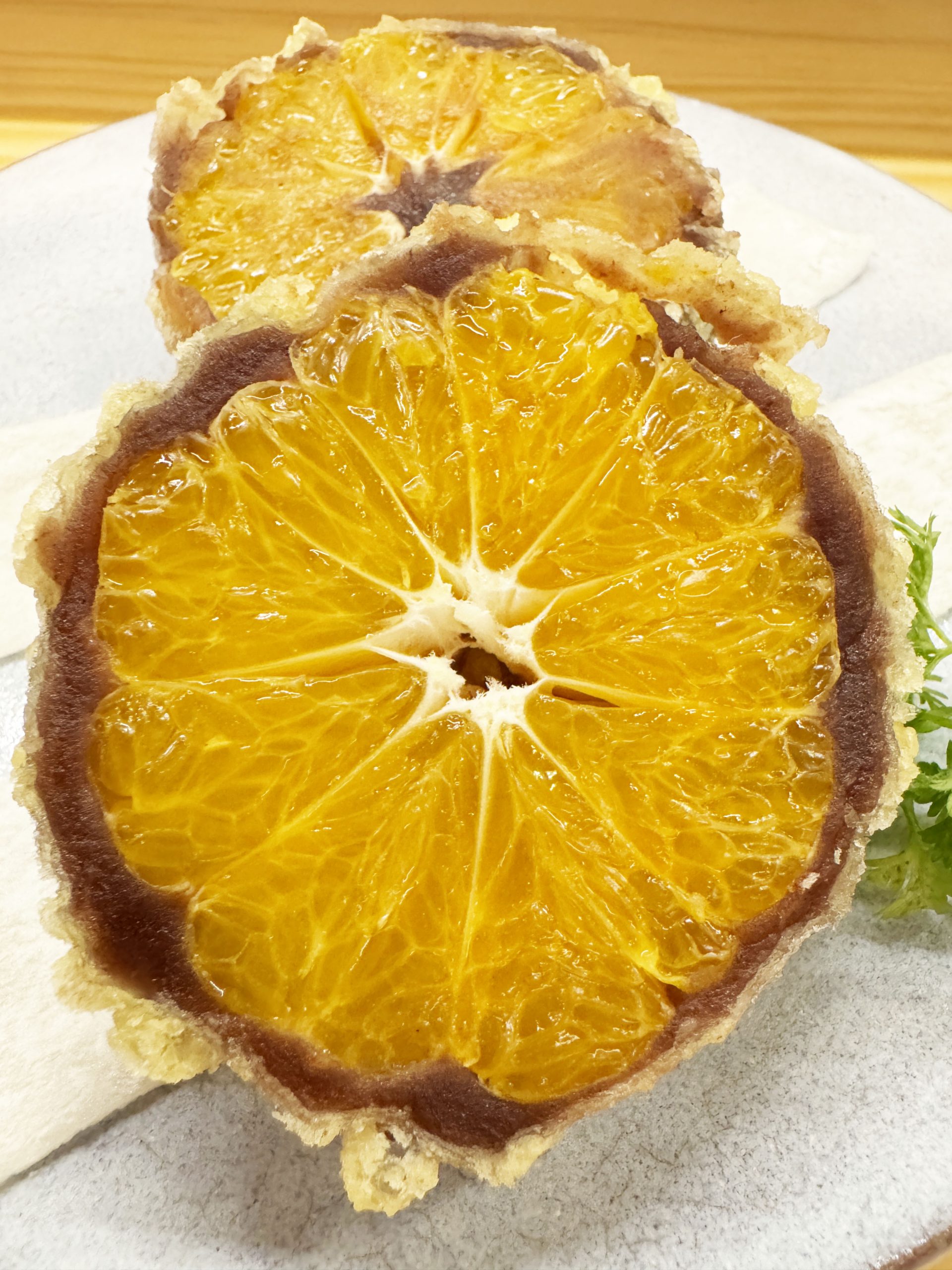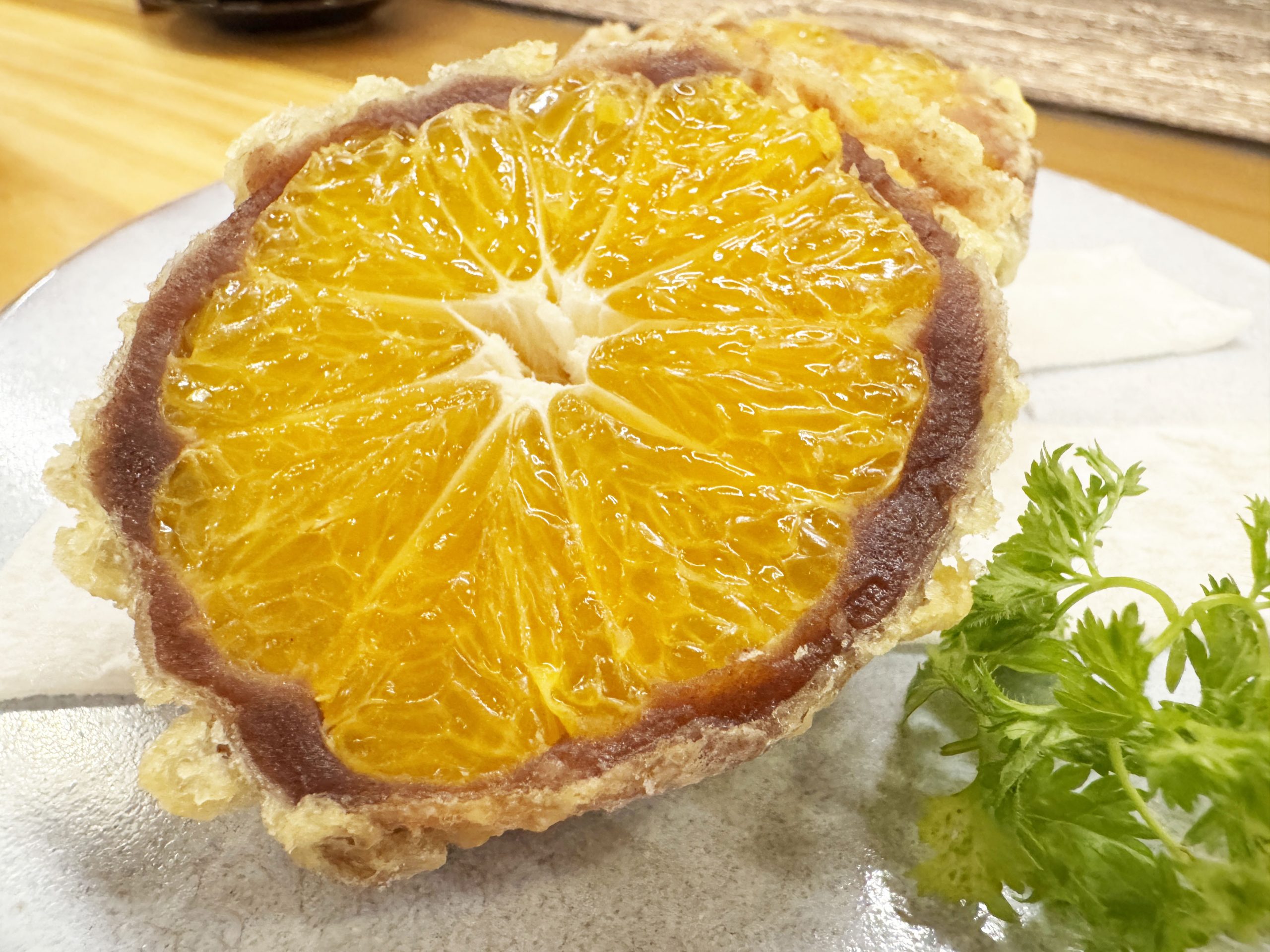 ミカンの天ぷらは、みかん1個が半分にカットされてまるごと天ぷらになっていて、これが秀逸でした。餅(求肥的なもの)に包んで、指でつまんで食べます。餅のおかげで、揚げ油が指につきません。