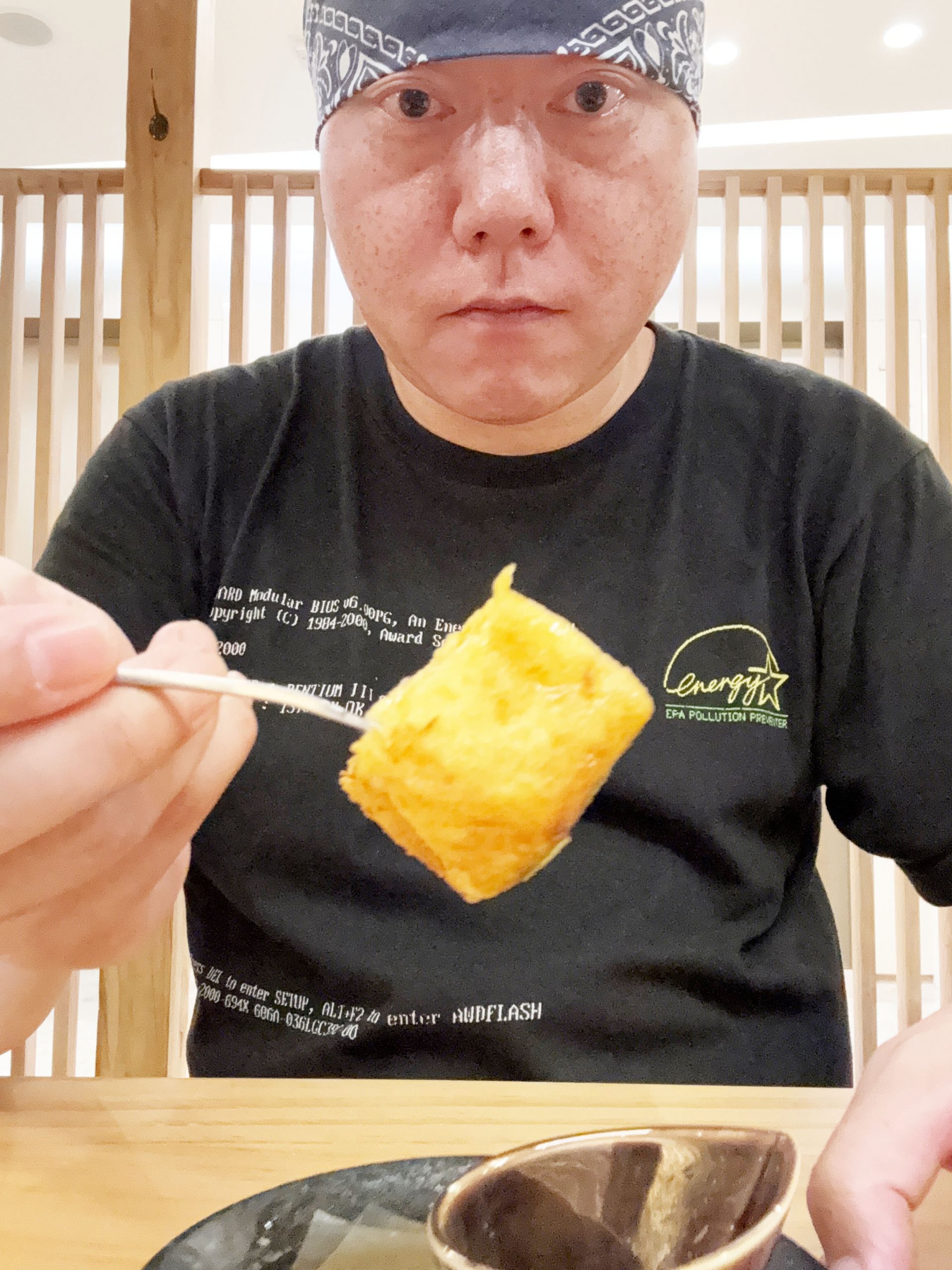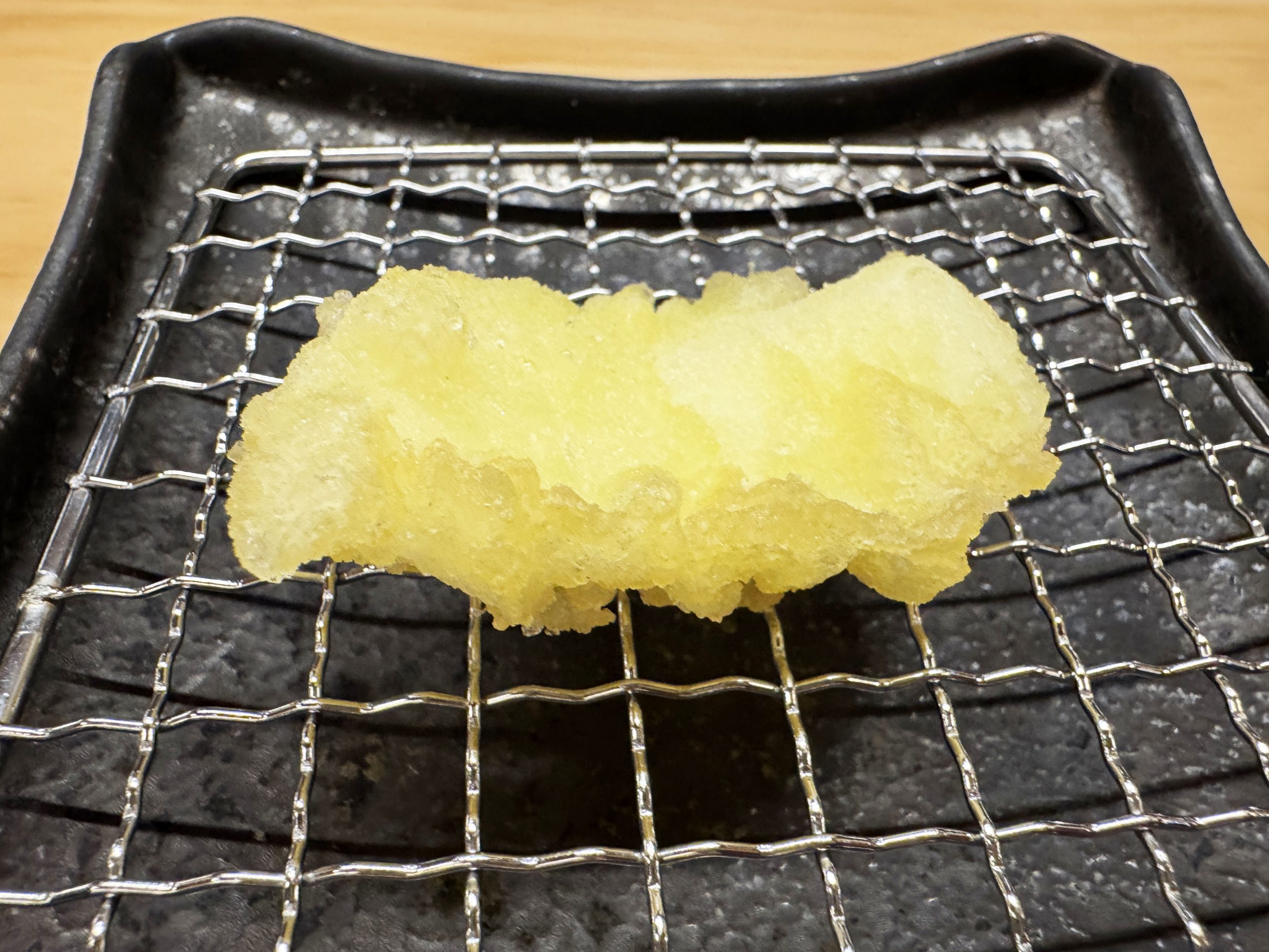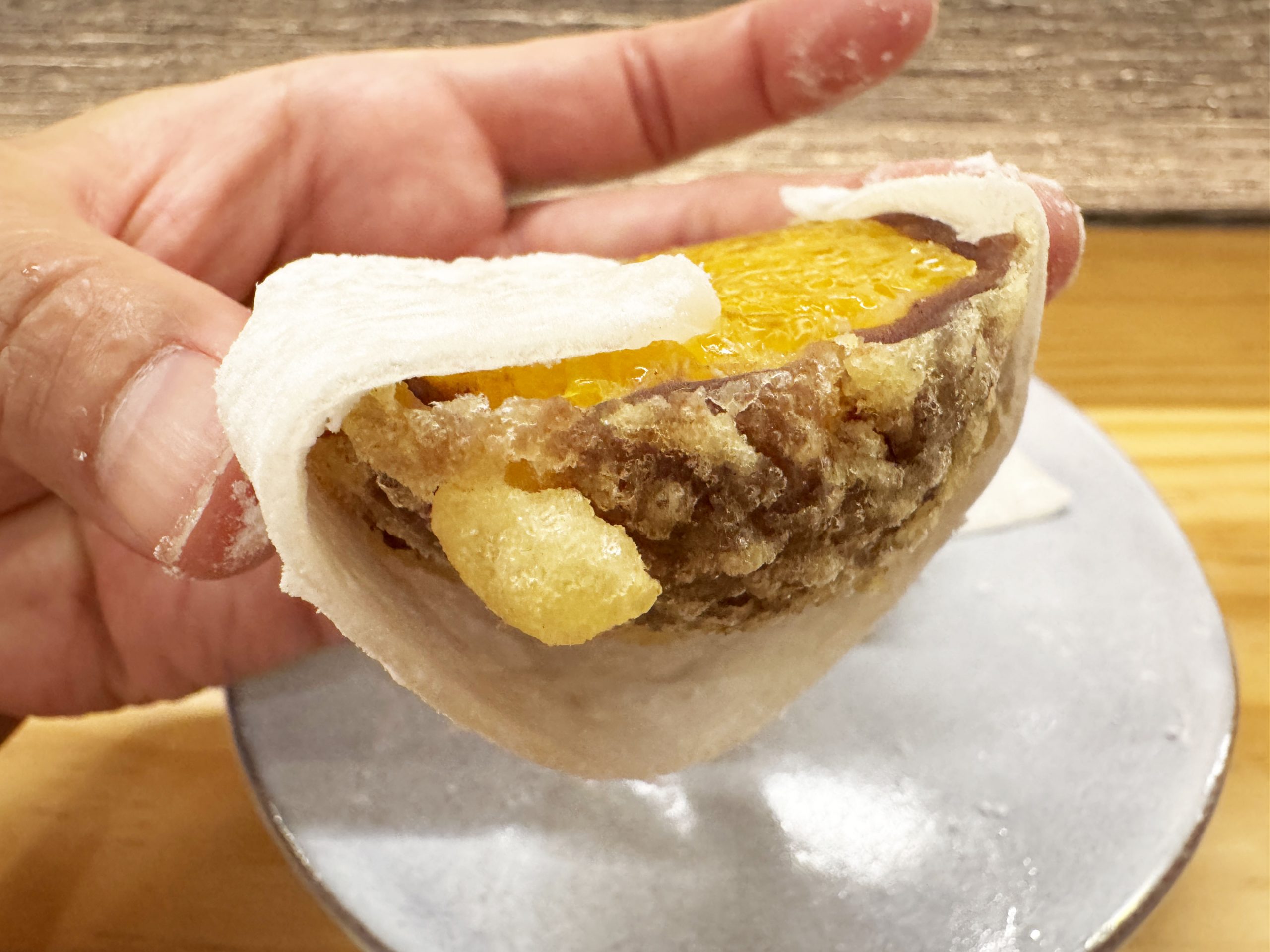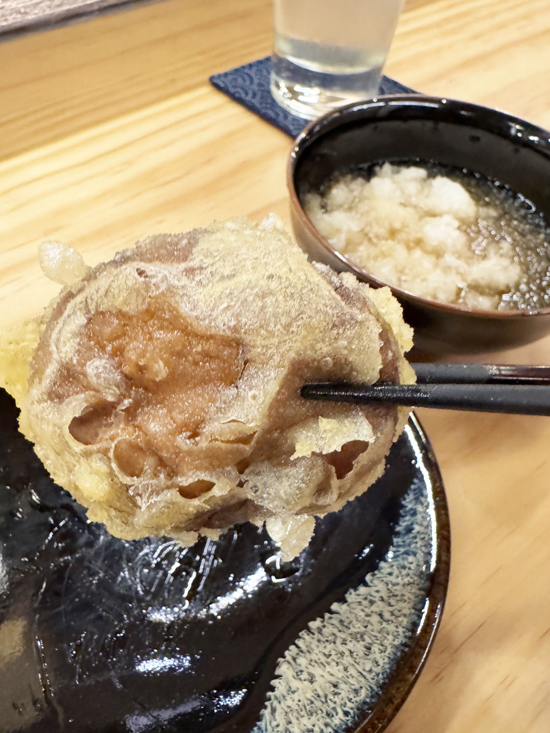 ミカンの天ぷらは、みかん1個が半分にカットされてまるごと天ぷらになっていて、これが秀逸でした。餅(求肥的なもの)に包んで、指でつまんで食べます。餅のおかげで、揚げ油が指につきません。