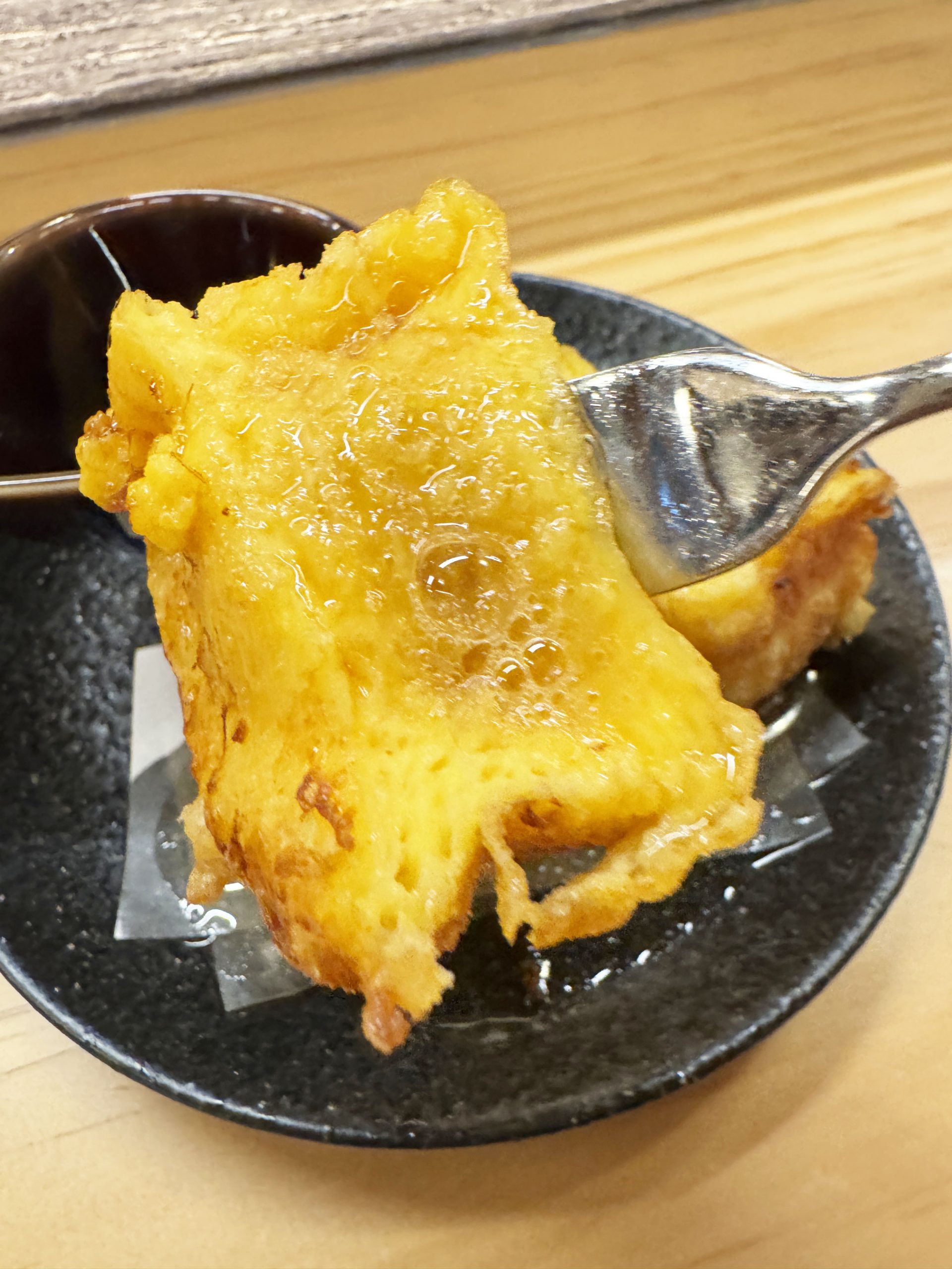 フレンチトーストの天ぷらは、なかなかの個性派。パンが揚げ油を吸収しているのでオイリーではあるものの、キリッと強めのドリンクとともに食べれば、最高のツマミになりそう。