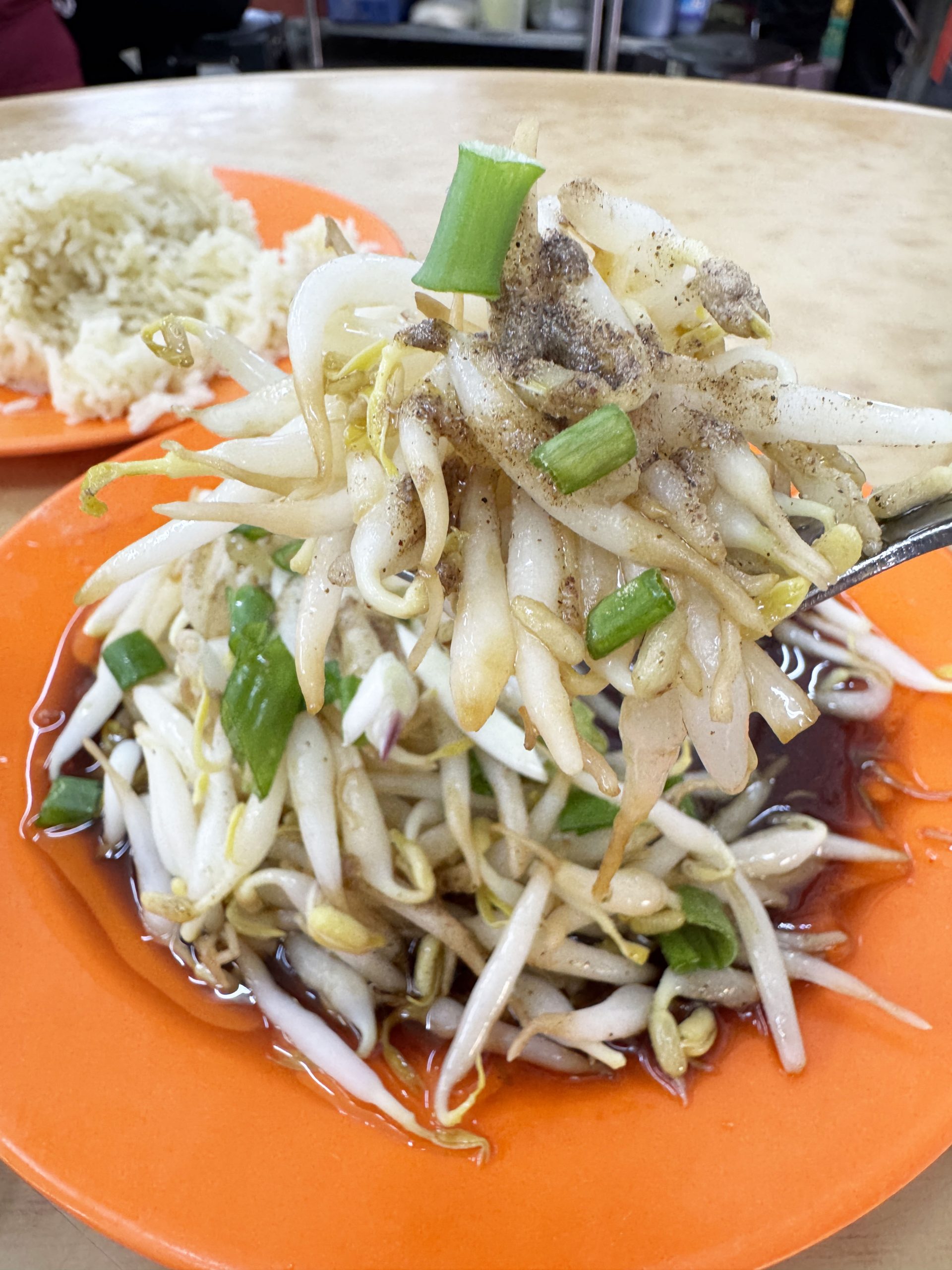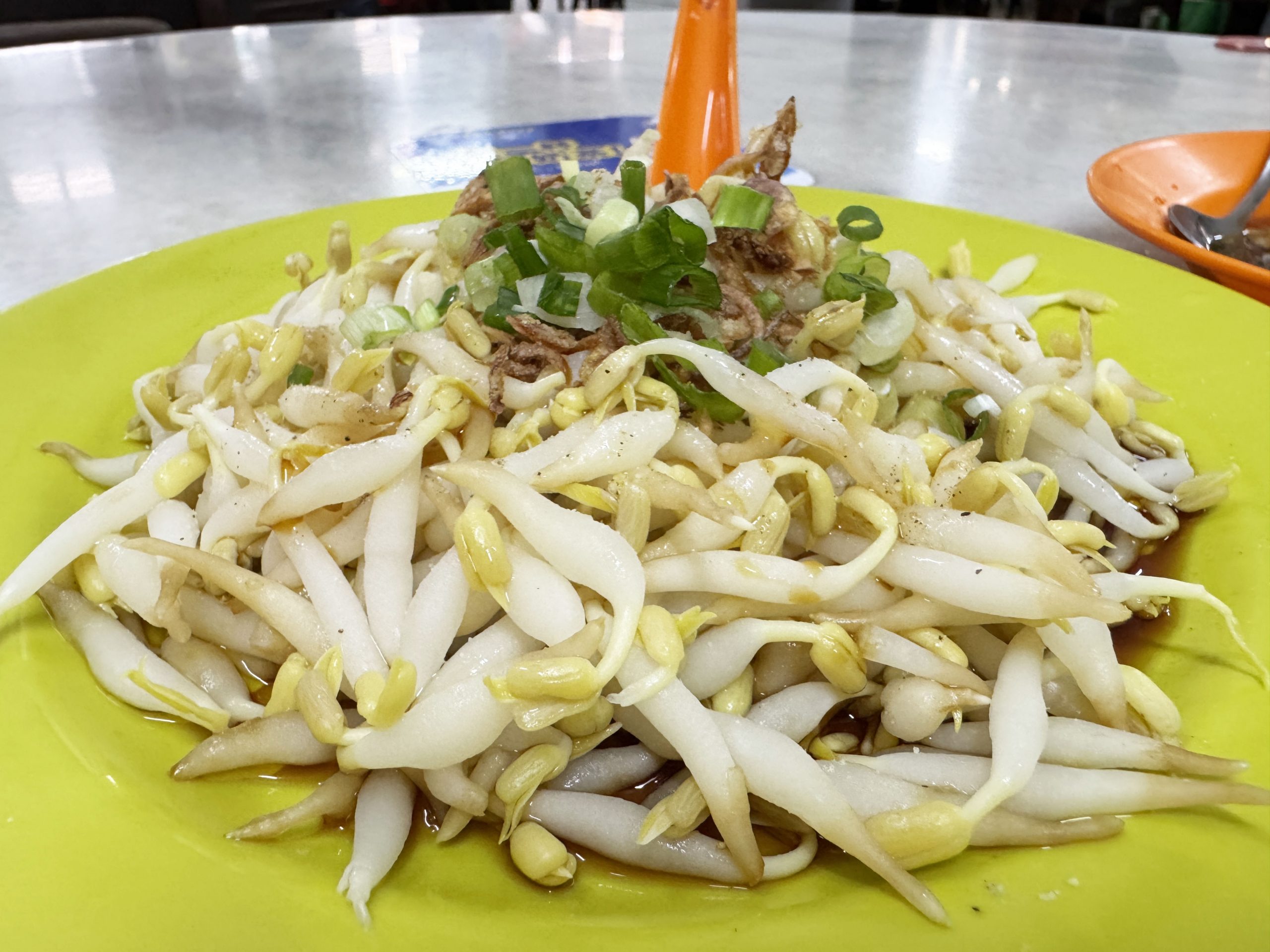 あまりにもシンプルなイポーもやし料理。湯通ししたイポーもやしに、ネギをのせ、醤油、ゴマ油、胡椒で仕上げたもの。ただそれだけなのに超、魅了。