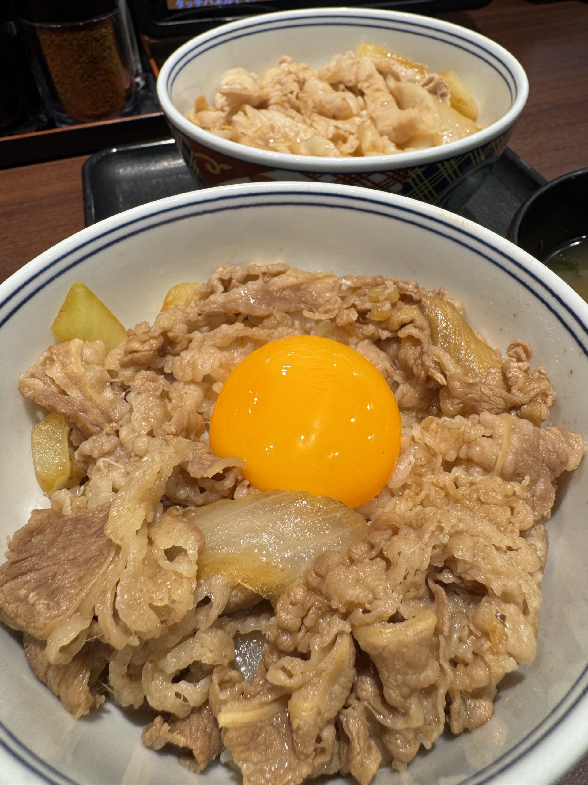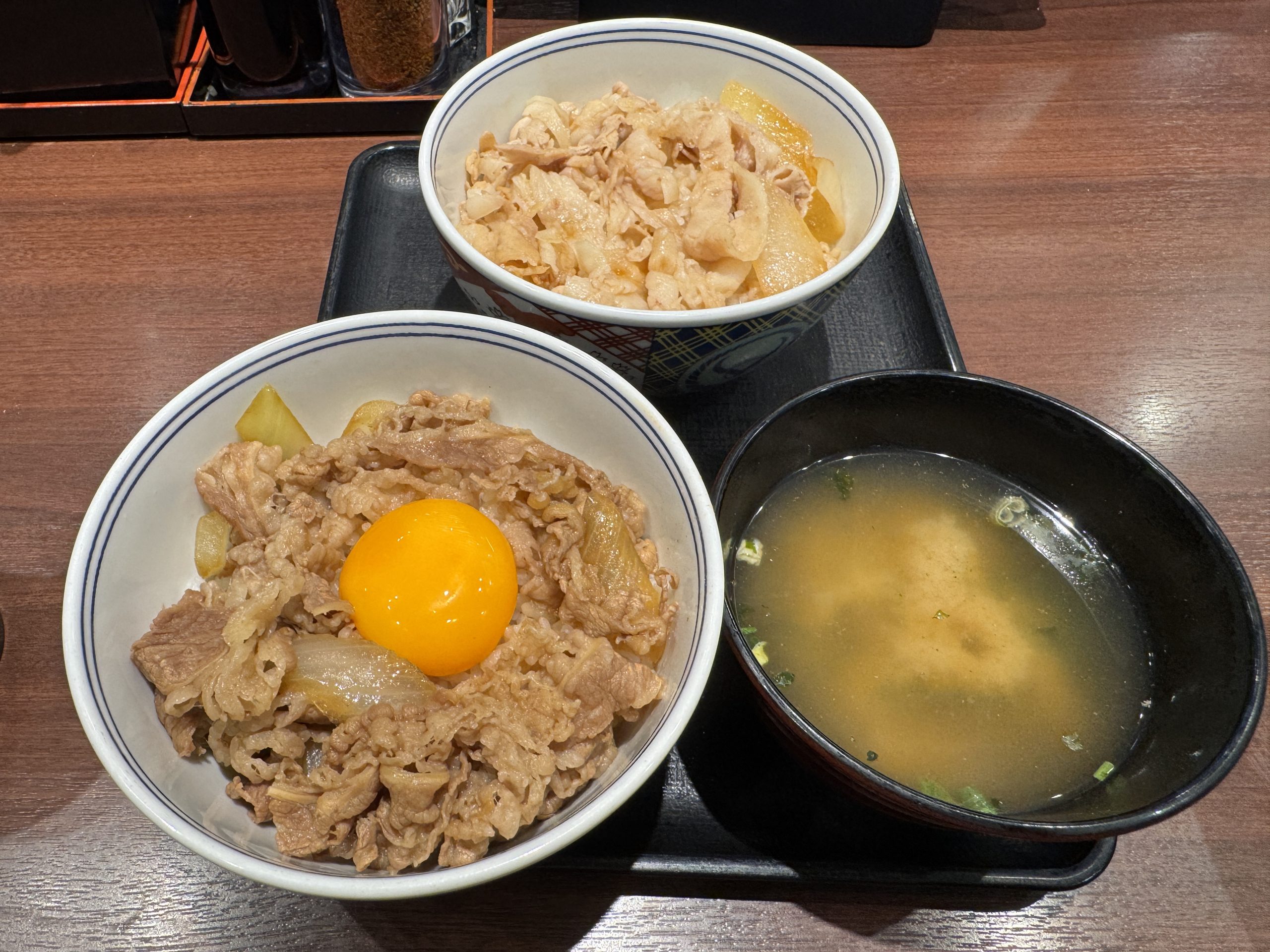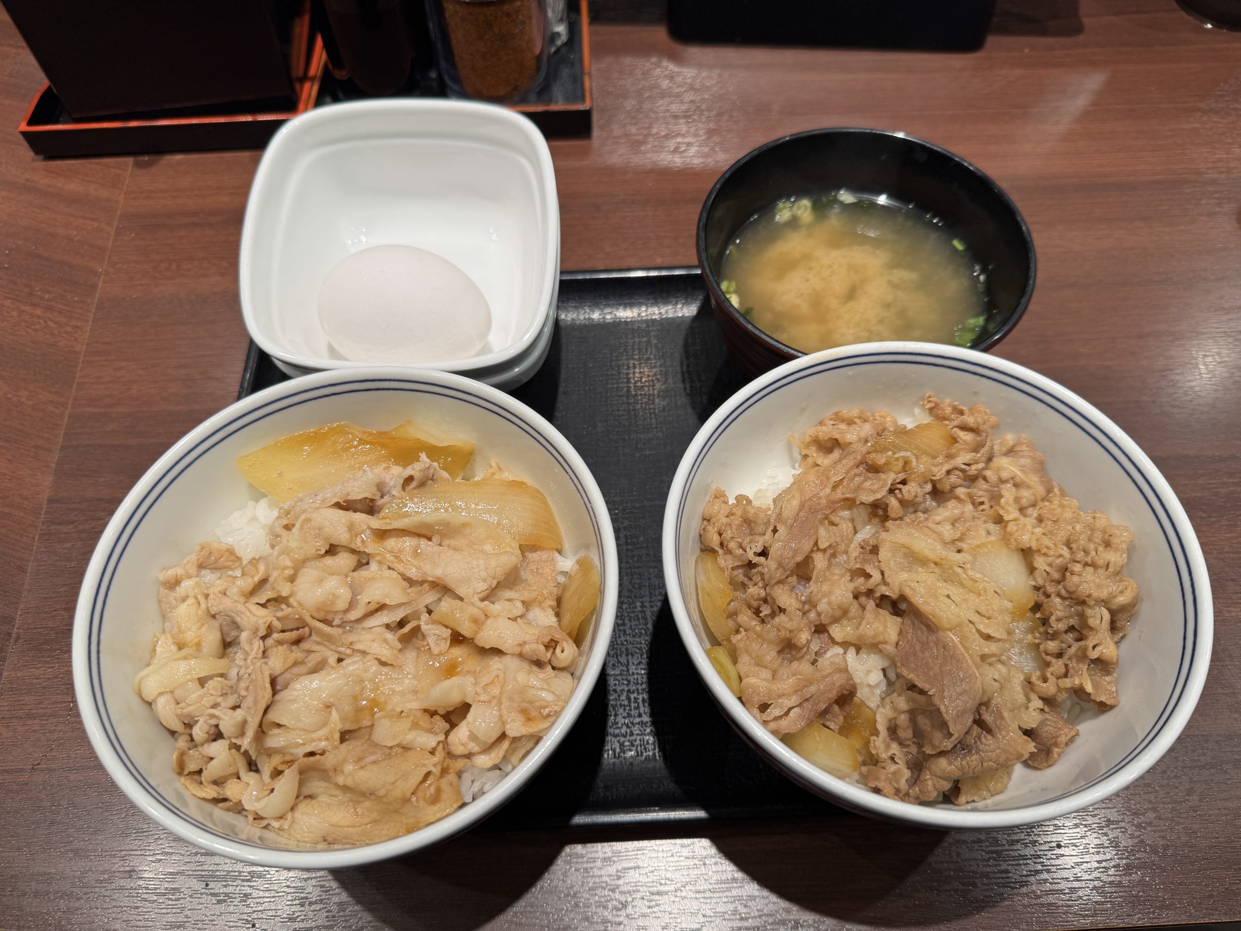 豚丼を販売している店舗を発見し、さっそく税込1111円セットに挑む。牛丼小盛、豚丼小盛、玉子、みそ汁(あおさ入り)をタッチパネルからオーダー。待たずして、すぐにテーブルにやってきた税込1111円セット。
