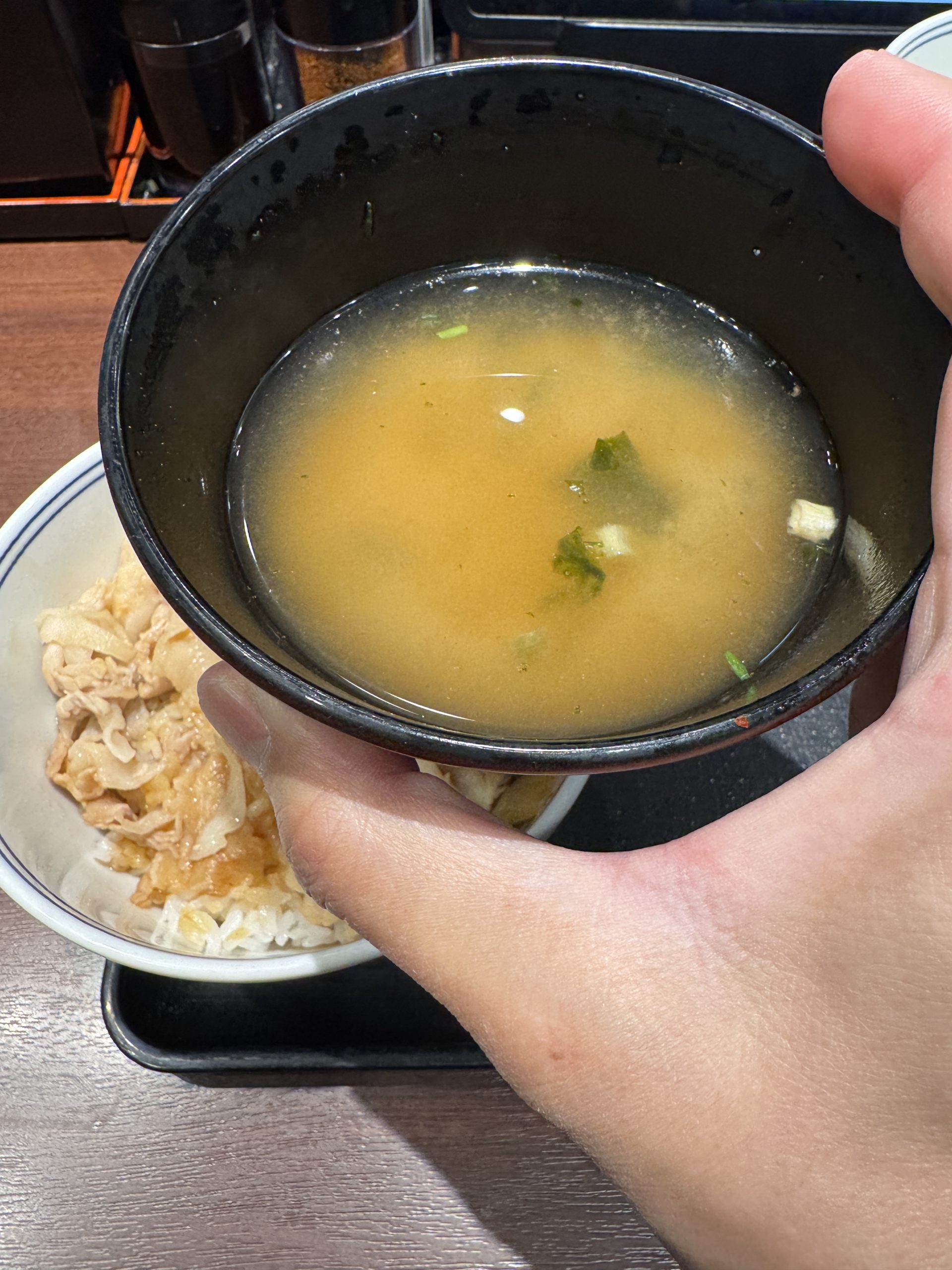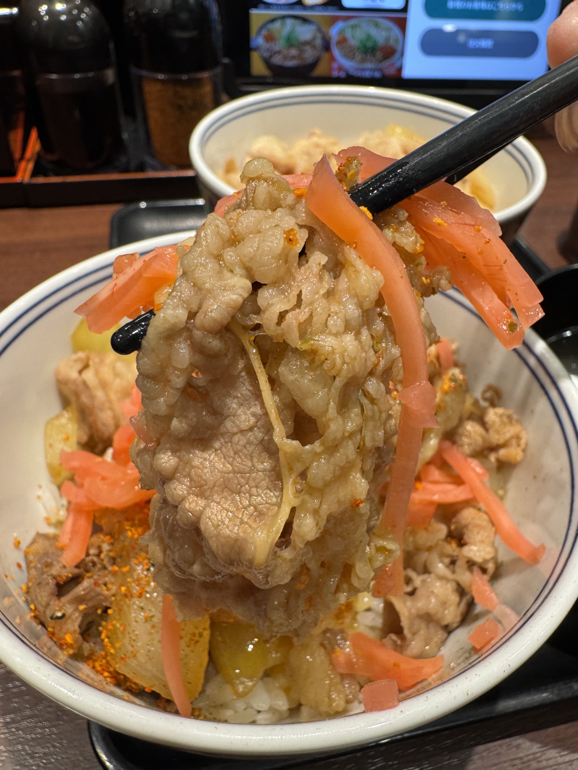 牛丼は七味唐辛子と紅生姜で食べる。うまい、うますぎる。この牛丼の味に関しては、もはや言うまでもなく、うまい。歴史と職人の技が織り成す伝統の味。