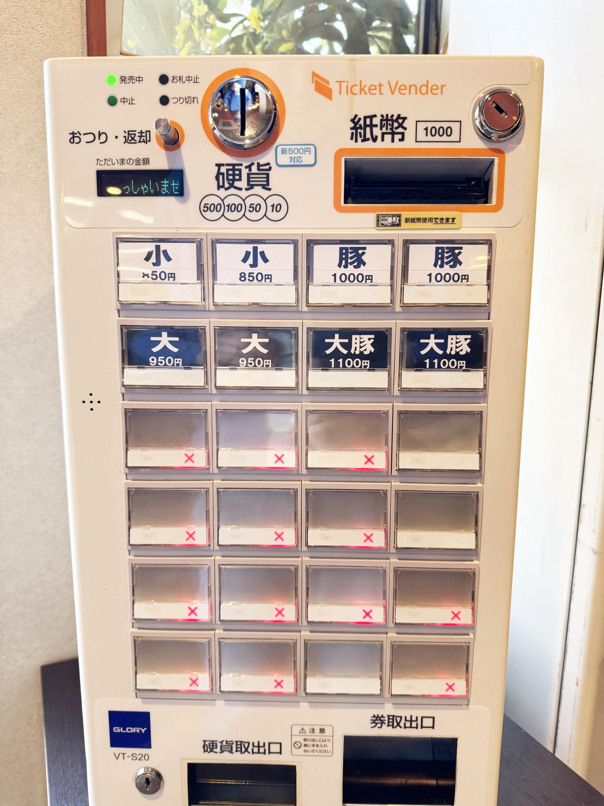 券売機にあったメニューは小ラーメン、大ラーメン、小豚ラーメン、大豚ラーメン。もしかすると、今後、トッピングやサイドメニューなどが増えるかもしれない。今回、筆者がオーダーしたラーメンは、小豚ラーメン+ニンニクマシマシ+アブラマシマシ。