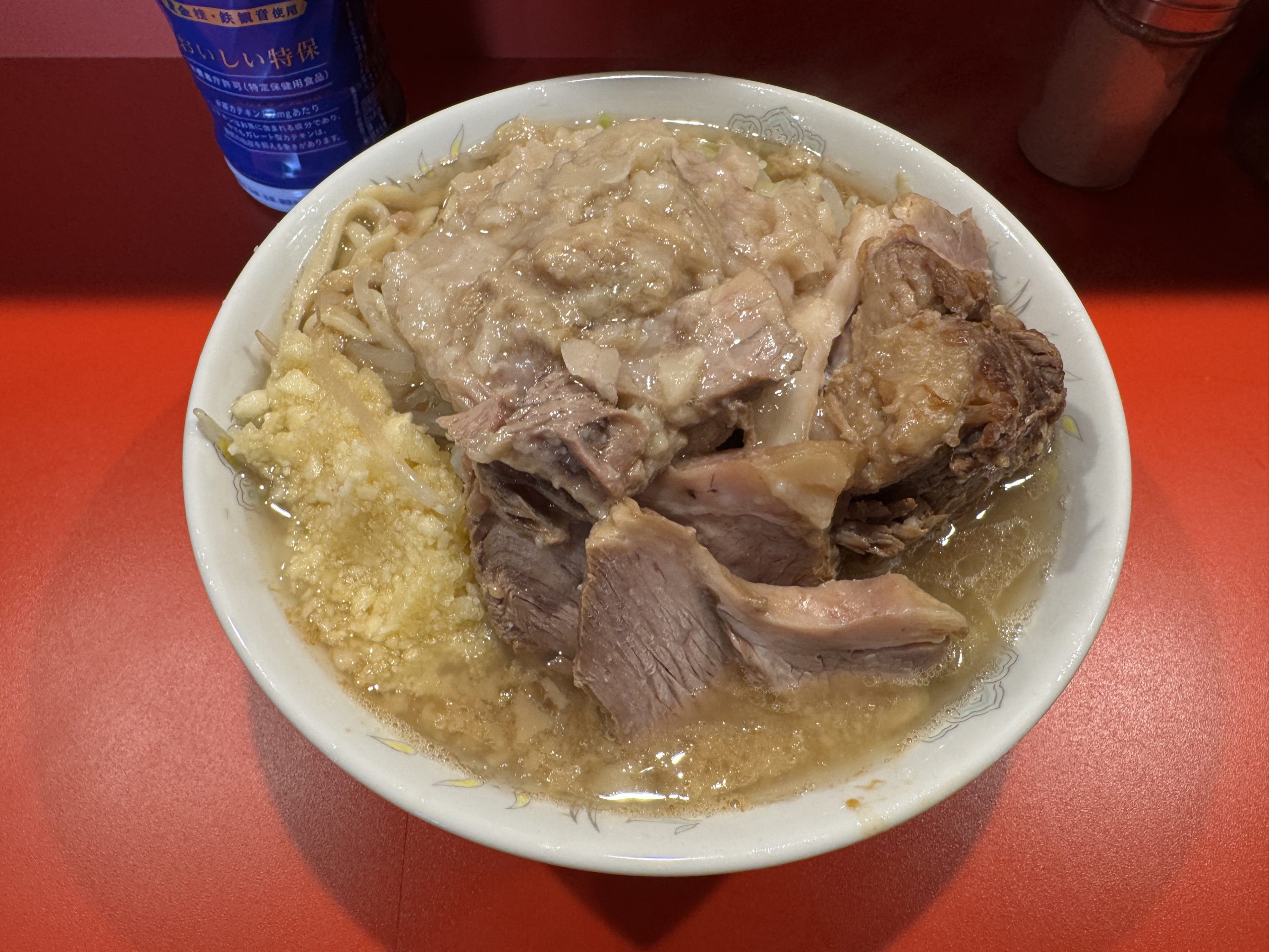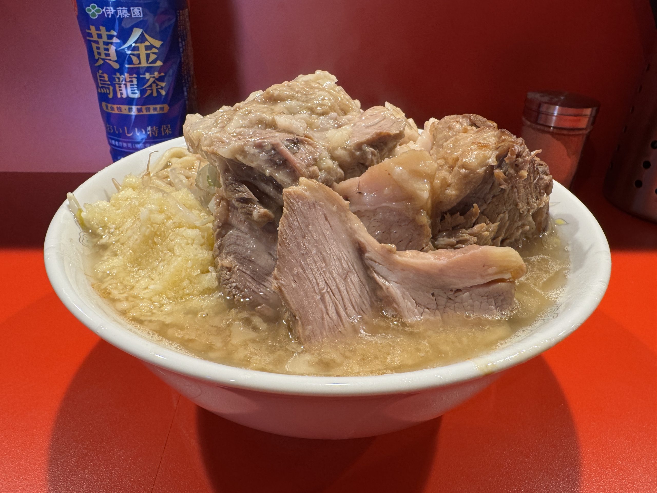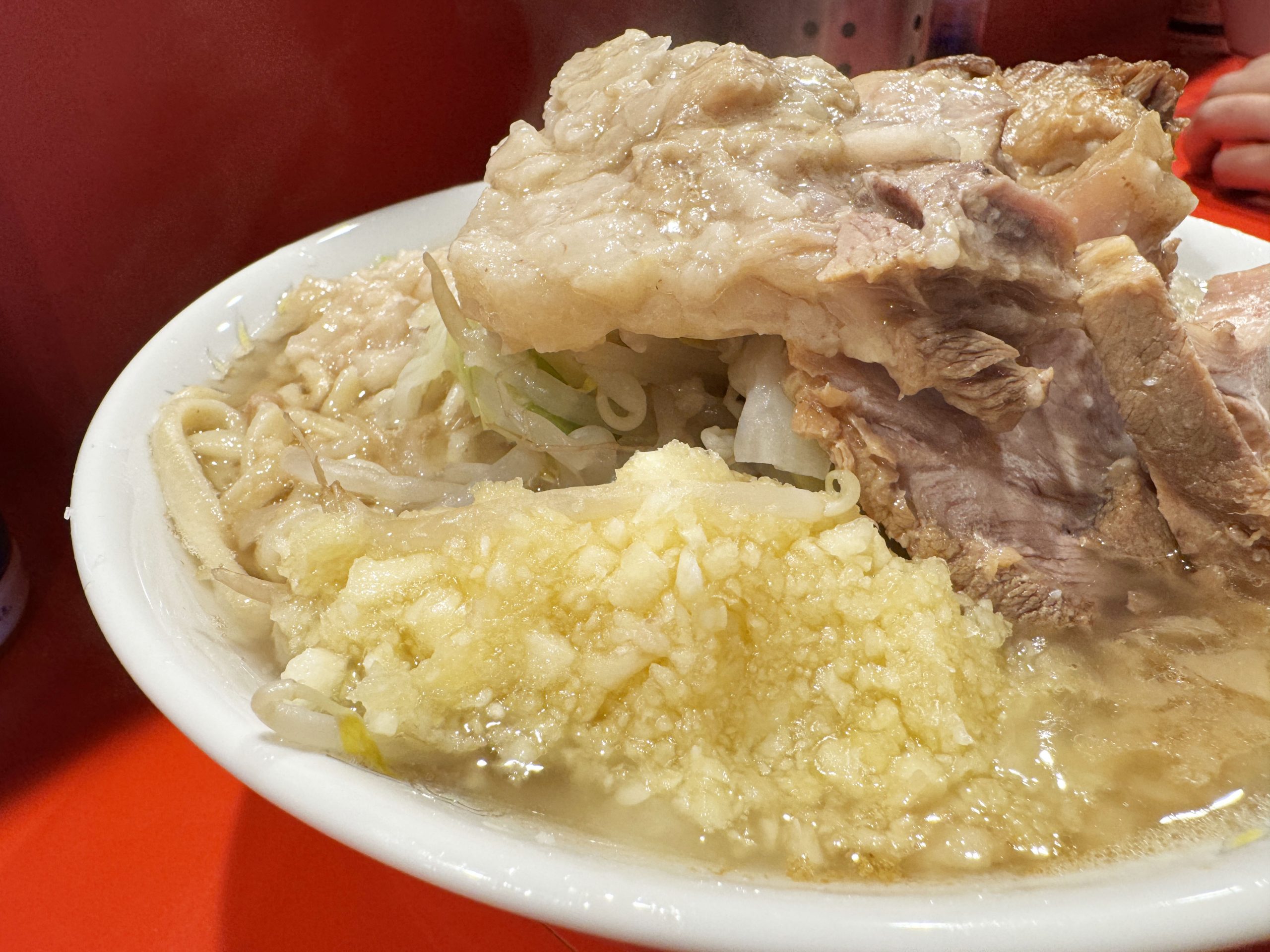 まず、ビジュアルが極まっている。豚、ニンニク、アブラ、極まるほど模範的なラーメン二郎のビジュがそこにある。食べる前から期待度MAXな存在と言えよう。