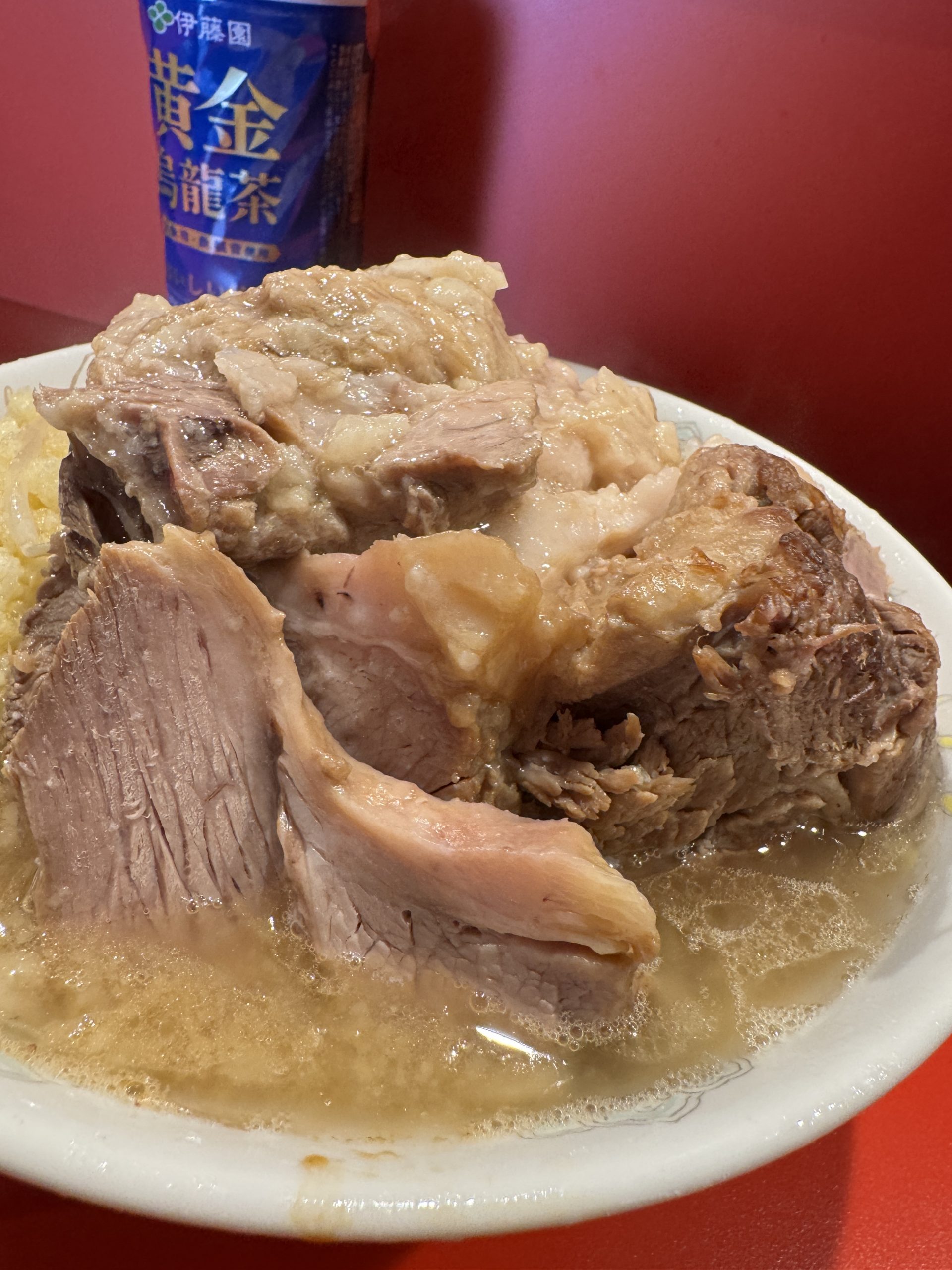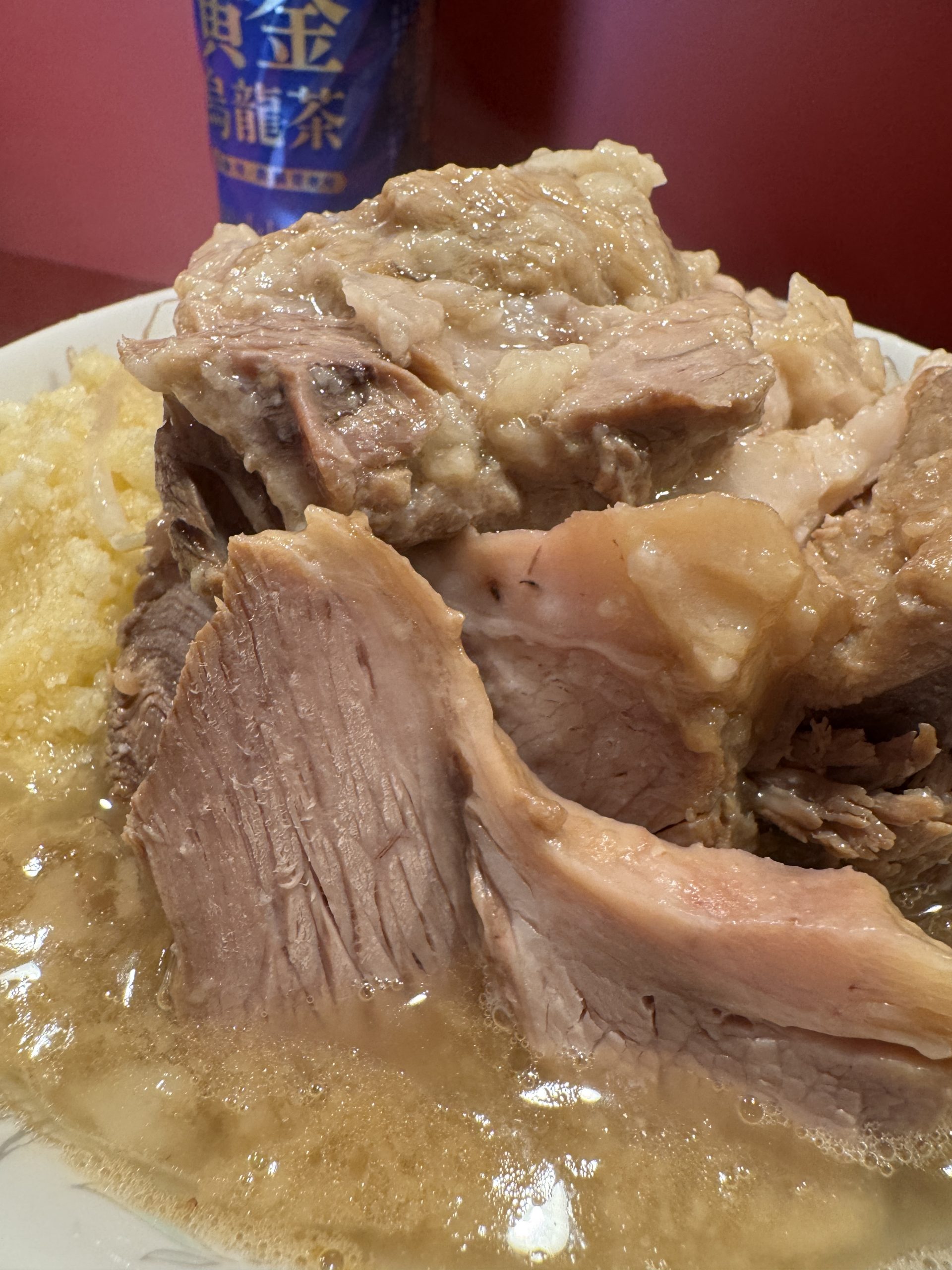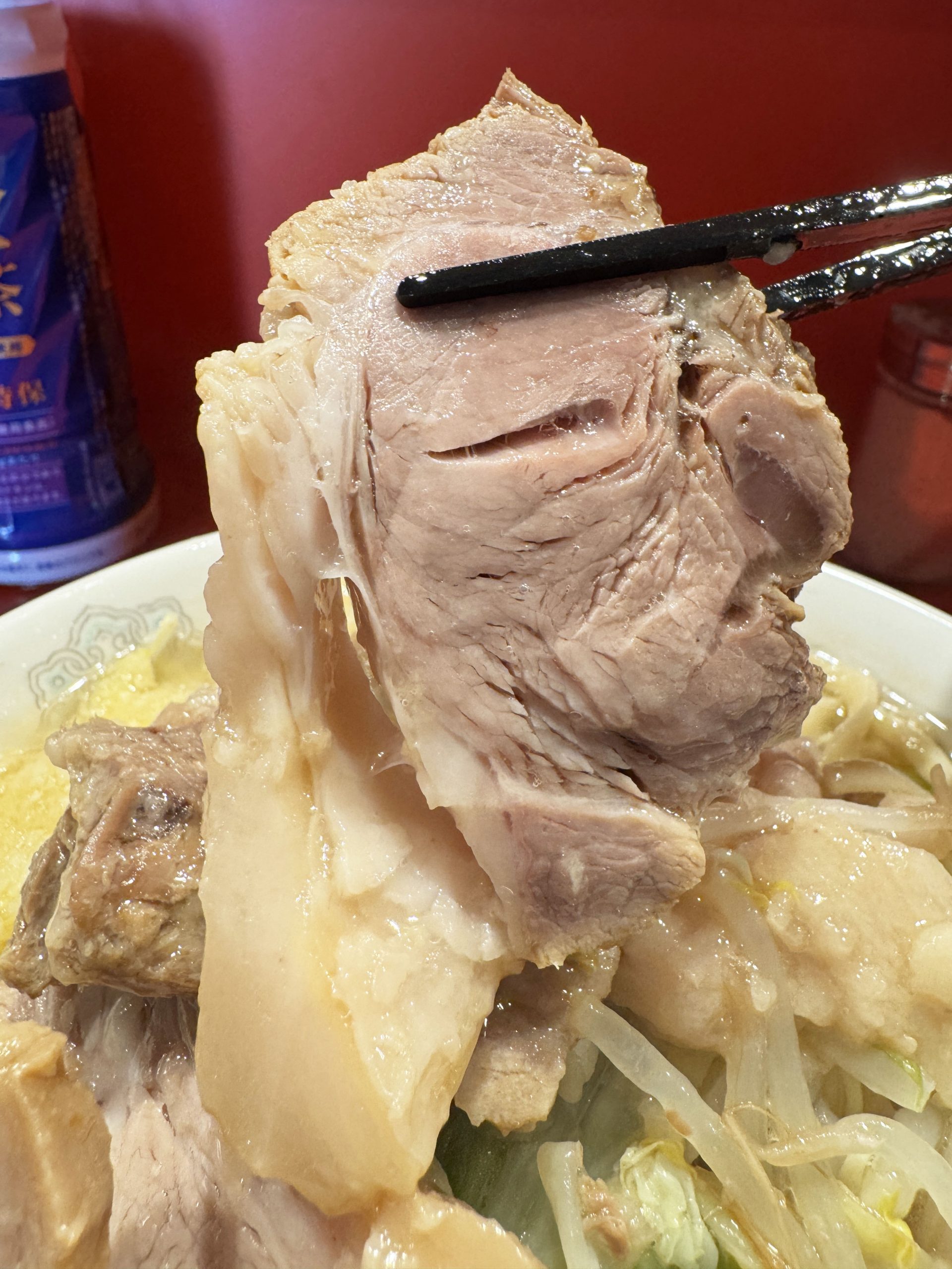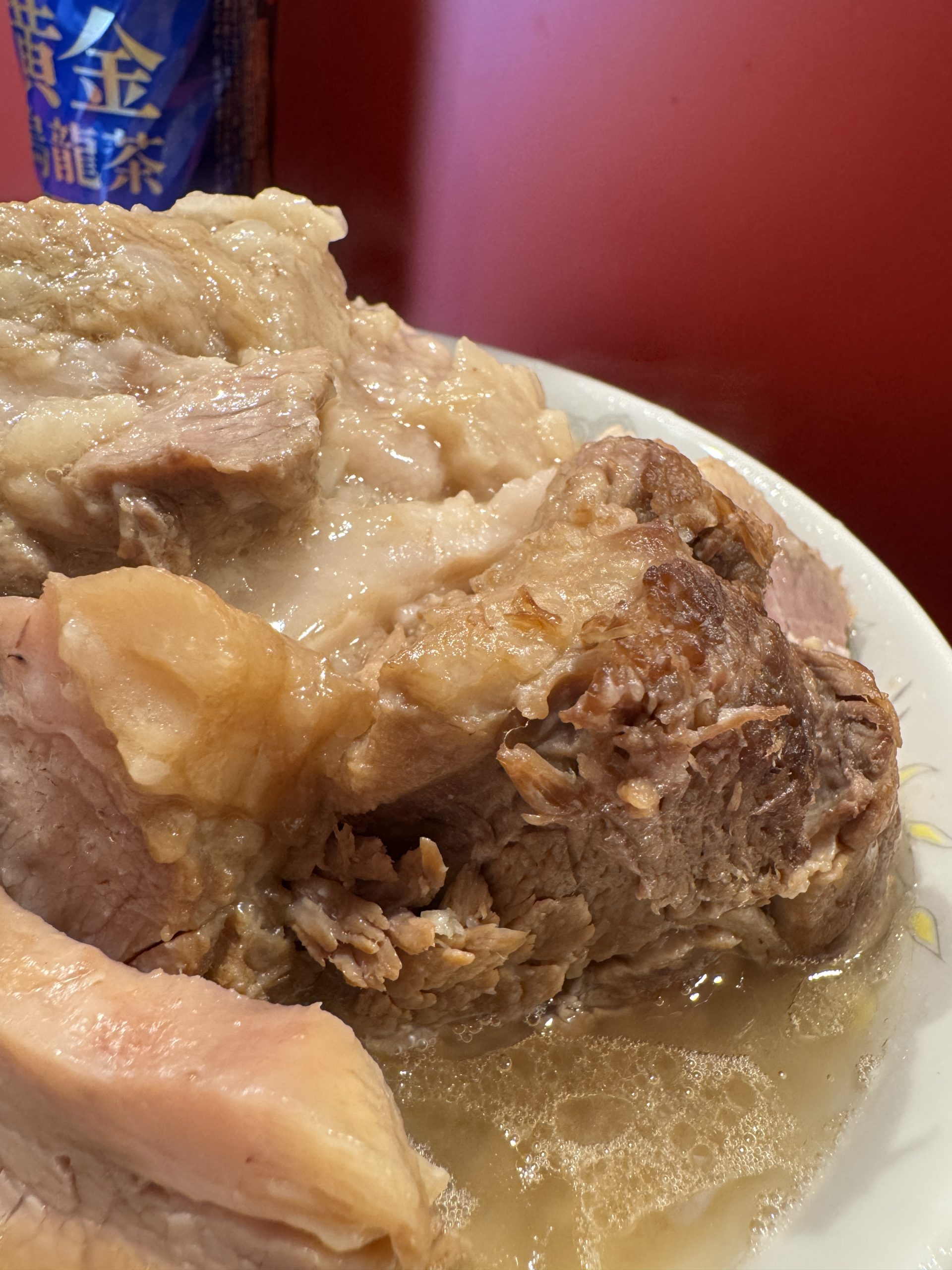 豚温度は低めなので、スープに浸して温めて食べるのもアリ。ラーメン二郎名古屋大曽根店のミルキィ汁をたっぷり吸わせた豚も良き。