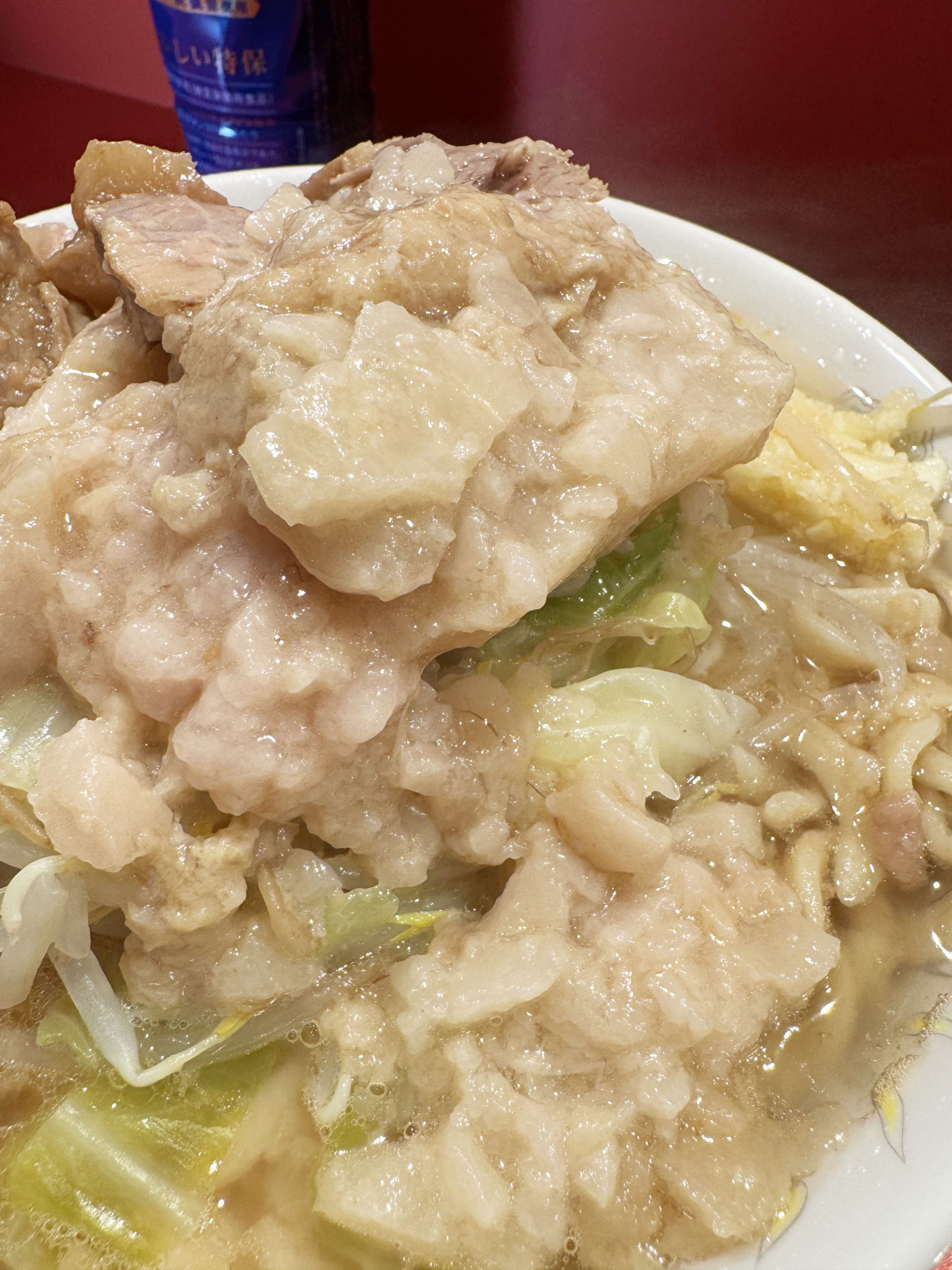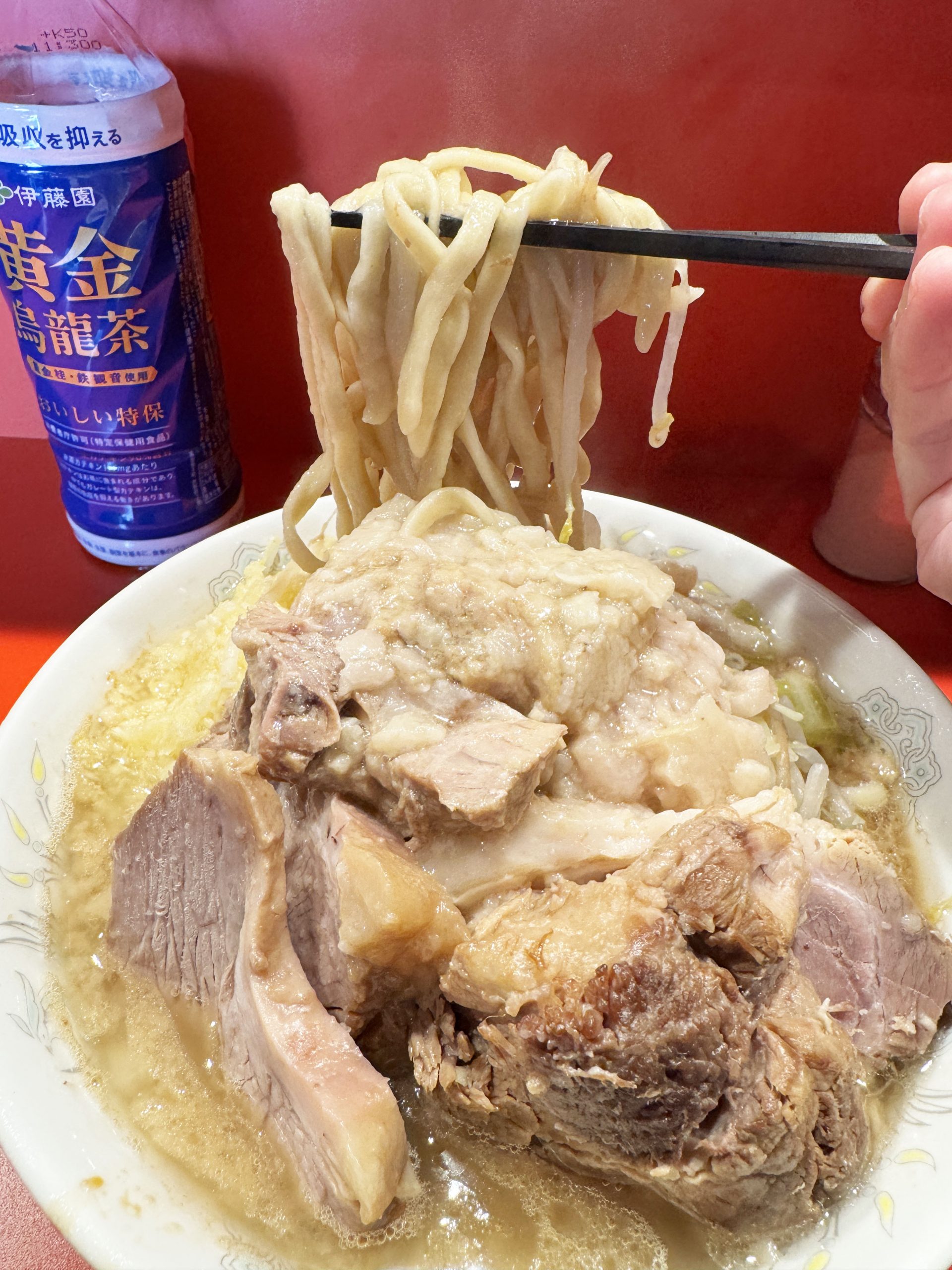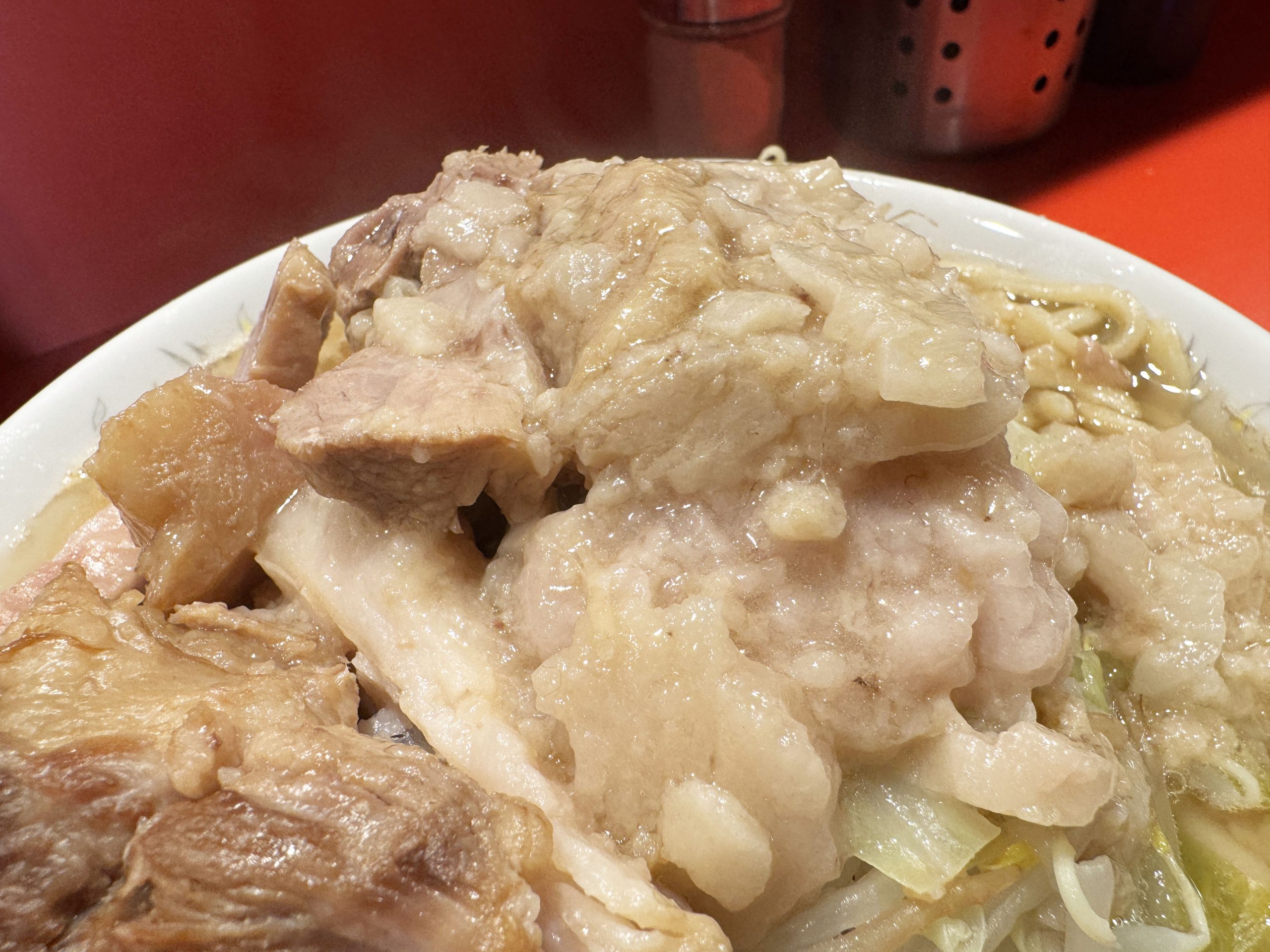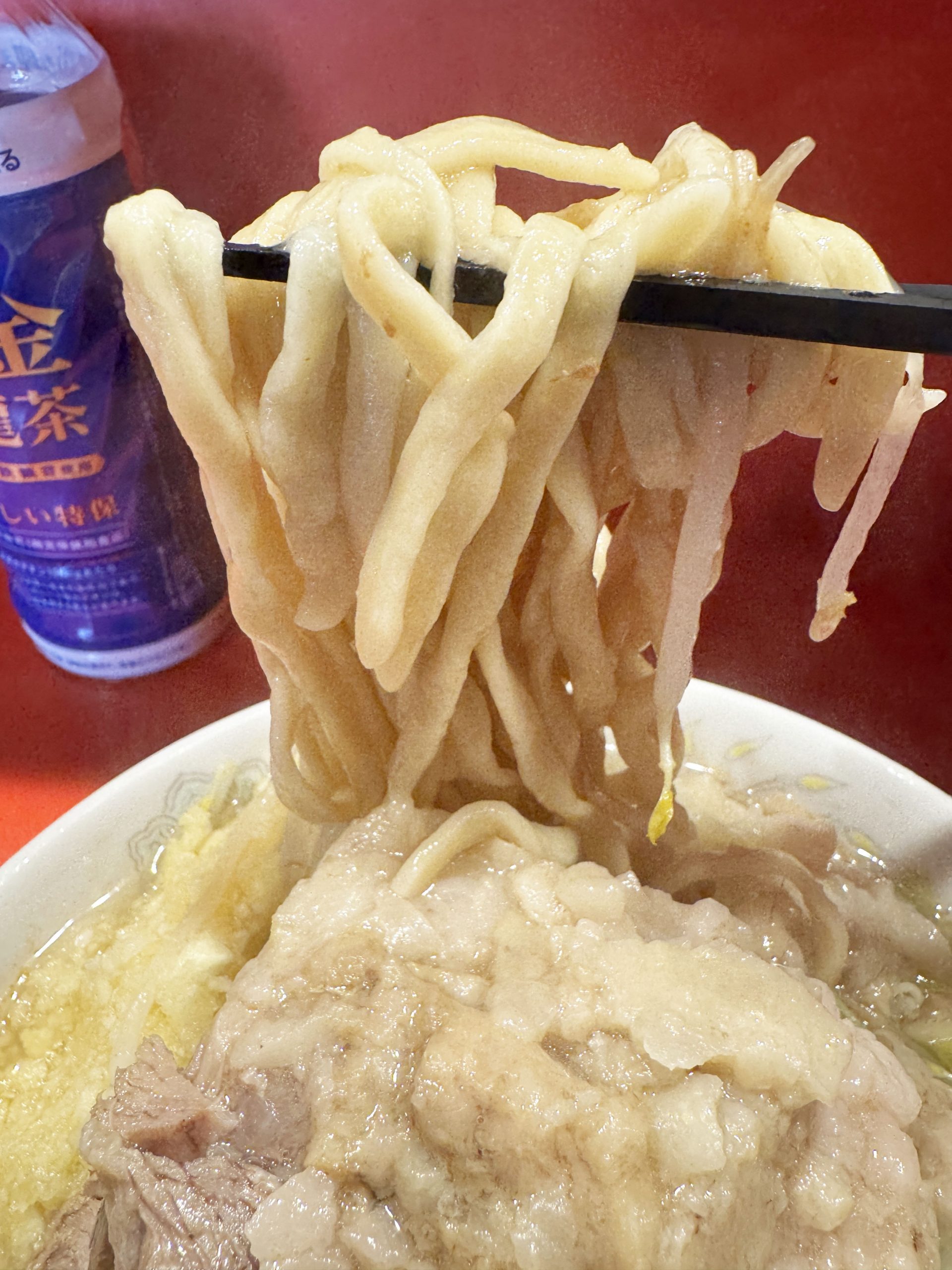 さっそく食べる。ラーメン二郎の中でもトップクラスの限りなく優しいテイスト。麺をサルベージすると、極厚の油膜を通過して味覚を訪れるため、麺クニュ度が極まったソフトな食べ心地となる。そもそも麺自体のクニュとした質感が食べていて心地良い。もしかすると、ラーメン二郎全店舗のなかでもダントツのクニュ感かもしれない。