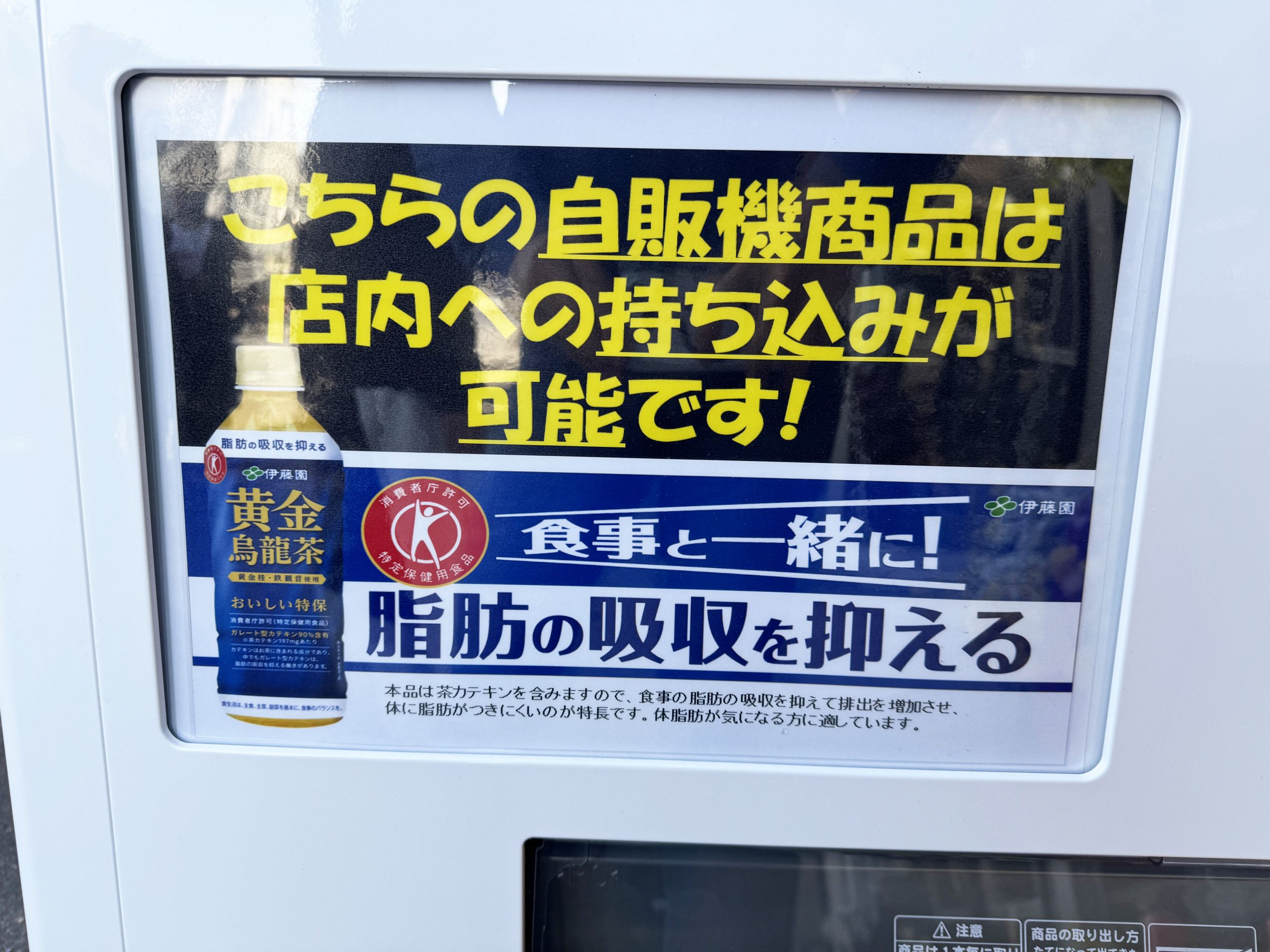 店頭にはドリンク自販機があり、この自販機で購入したドリンクは店内への持ち込みが可能。トクホの黄金烏龍茶、お~いお茶、お~いお茶(濃い茶)、お~いお茶(カテキン緑茶)、リラックスジャスミンティー、健康ミネラルむぎ茶、黒豆茶、りんご三兄弟、みかんゼリージュース、タリーズバリスタBLACKキリマンジャロがある。