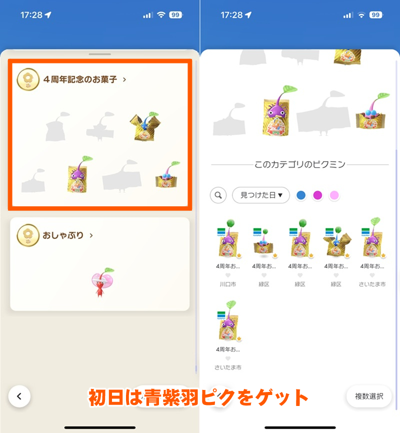 対象店舗に出現中のスペシャルスポットから期間限定で“4周年記念のお菓子”を身に付けたデコピクミンが入手できる。