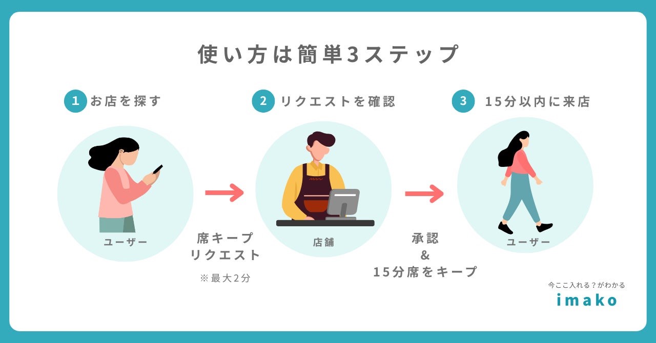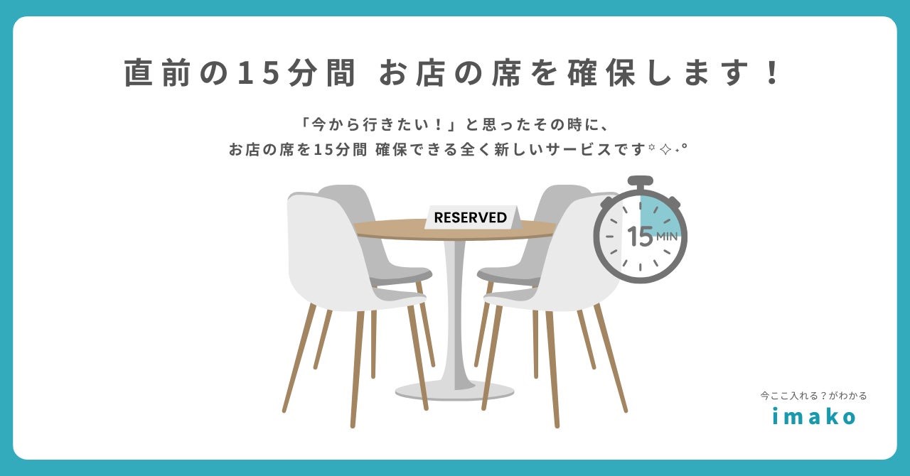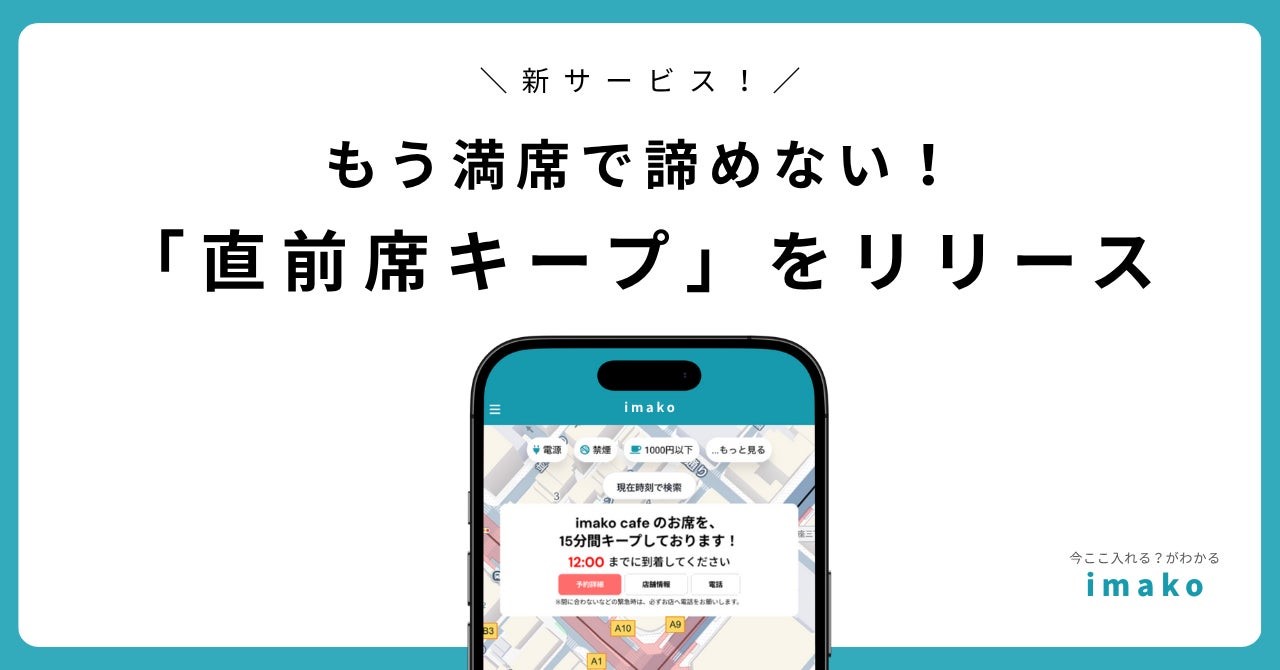 カフェ混雑情報マップ「imako(いまこ)」が、カフェの席を15分間確保できる新サービス「直前席キープ」を11月19日にリリースしました。