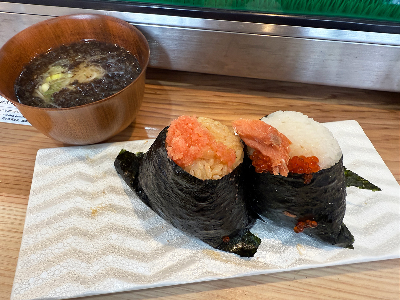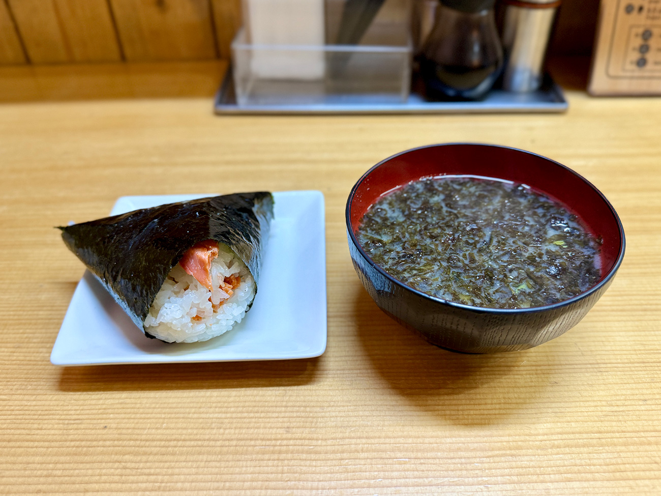 おにぎりと味噌汁だけを食べようと決めてもメニューが豊富で悩んでしまうわけですが、やはり最初は直球勝負。人気No.1にぎりの「たらこバター」(380円)を特製醤油で、人気No.2のしゃけにいくらを合わせた「親子いくら」(490円)、さらに岩のりの味噌汁(310円)をつけました。